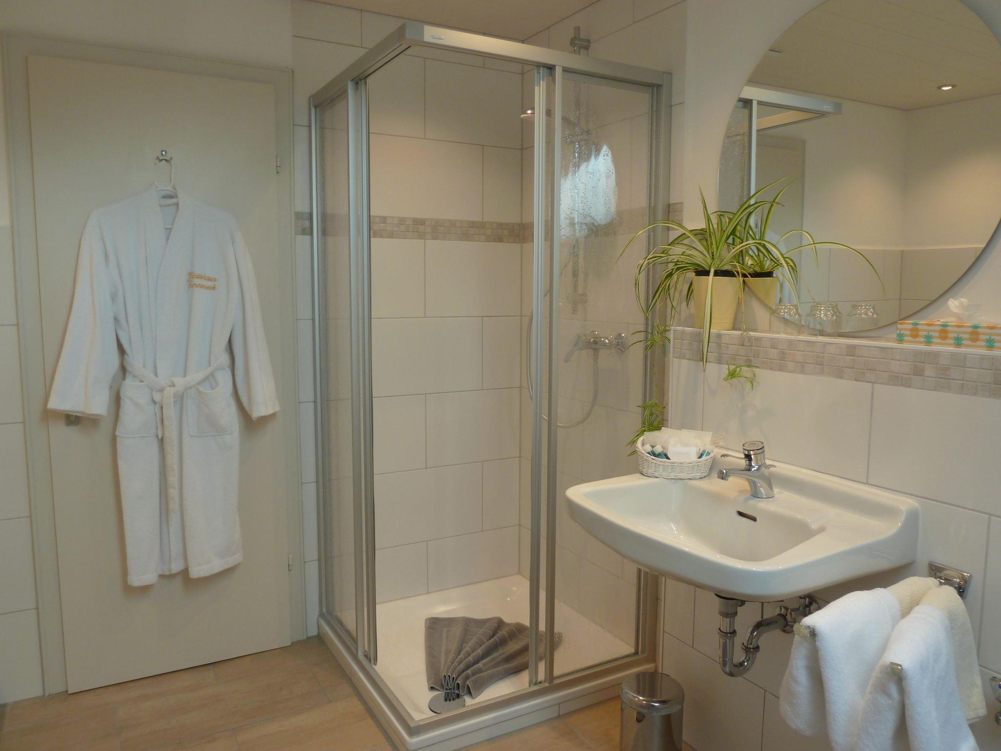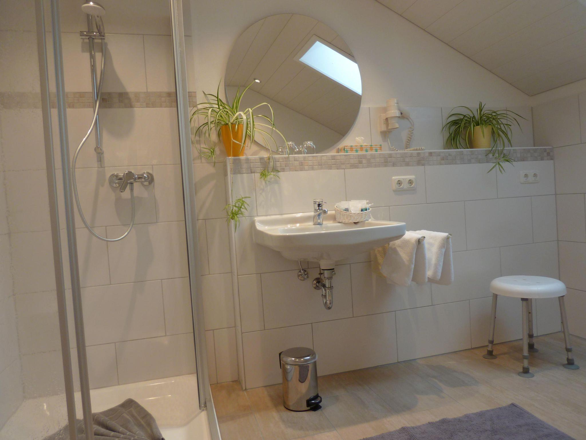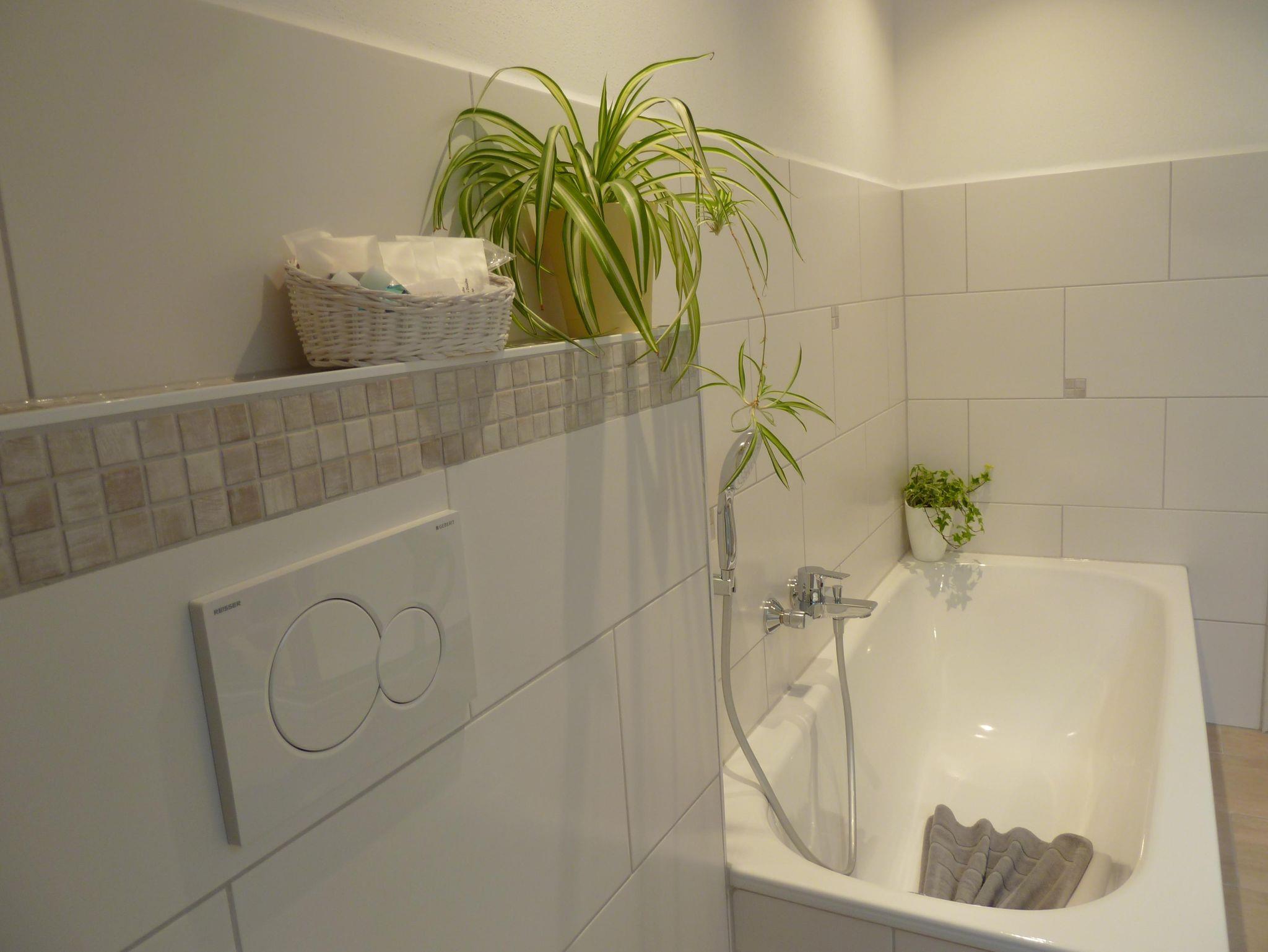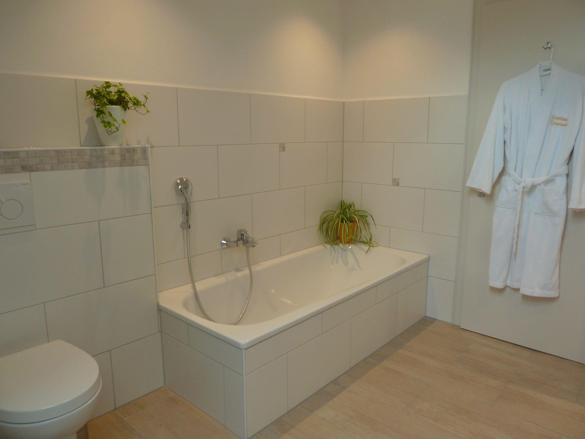 Ein großes, helles Badezimmer mit Badewanne, DU/WC und Waschbecken. Ausgestattet mit einem Fön, Kosmetikspiegel, Toilettenartikel-u. papier und Bademäntel.