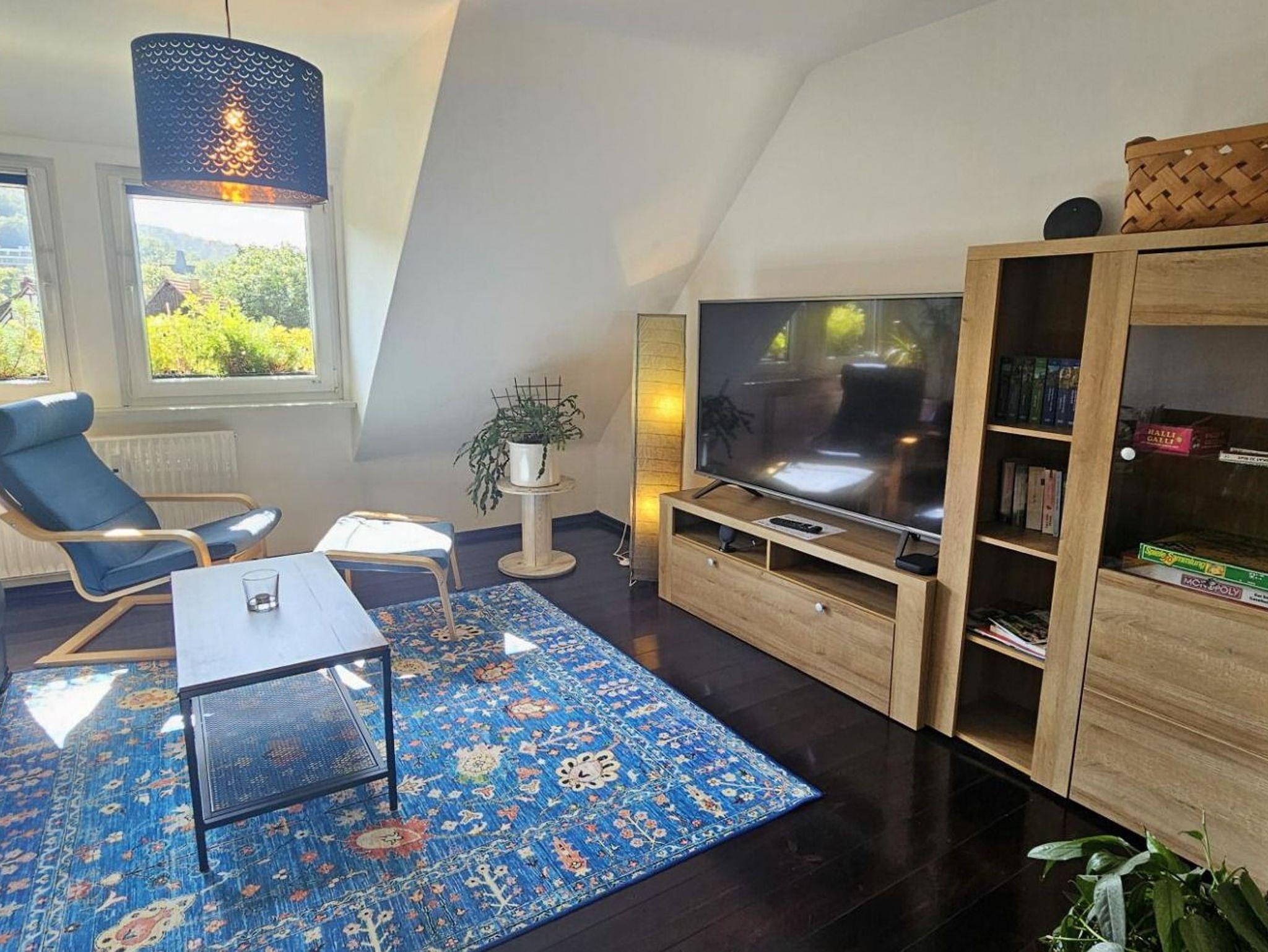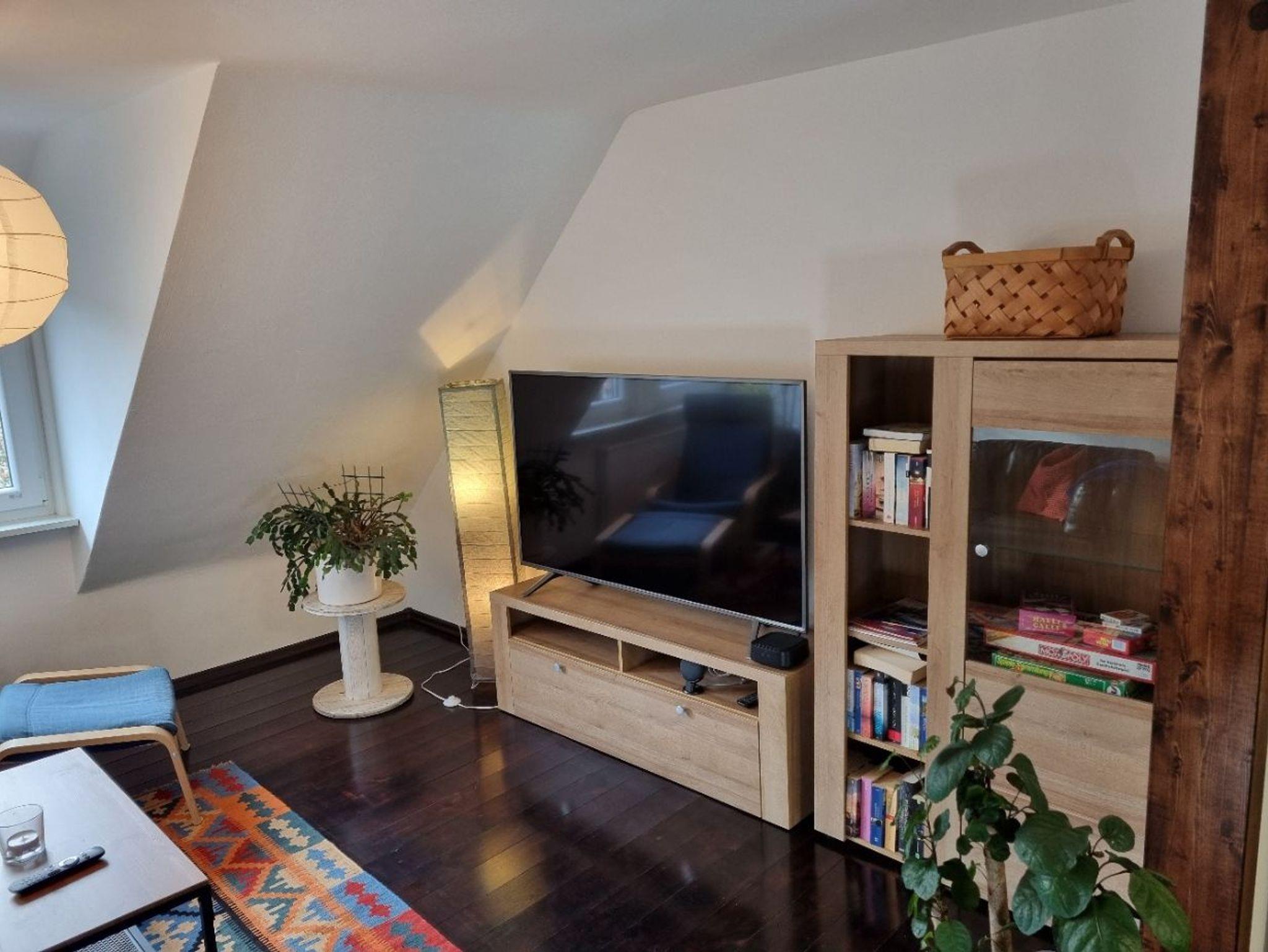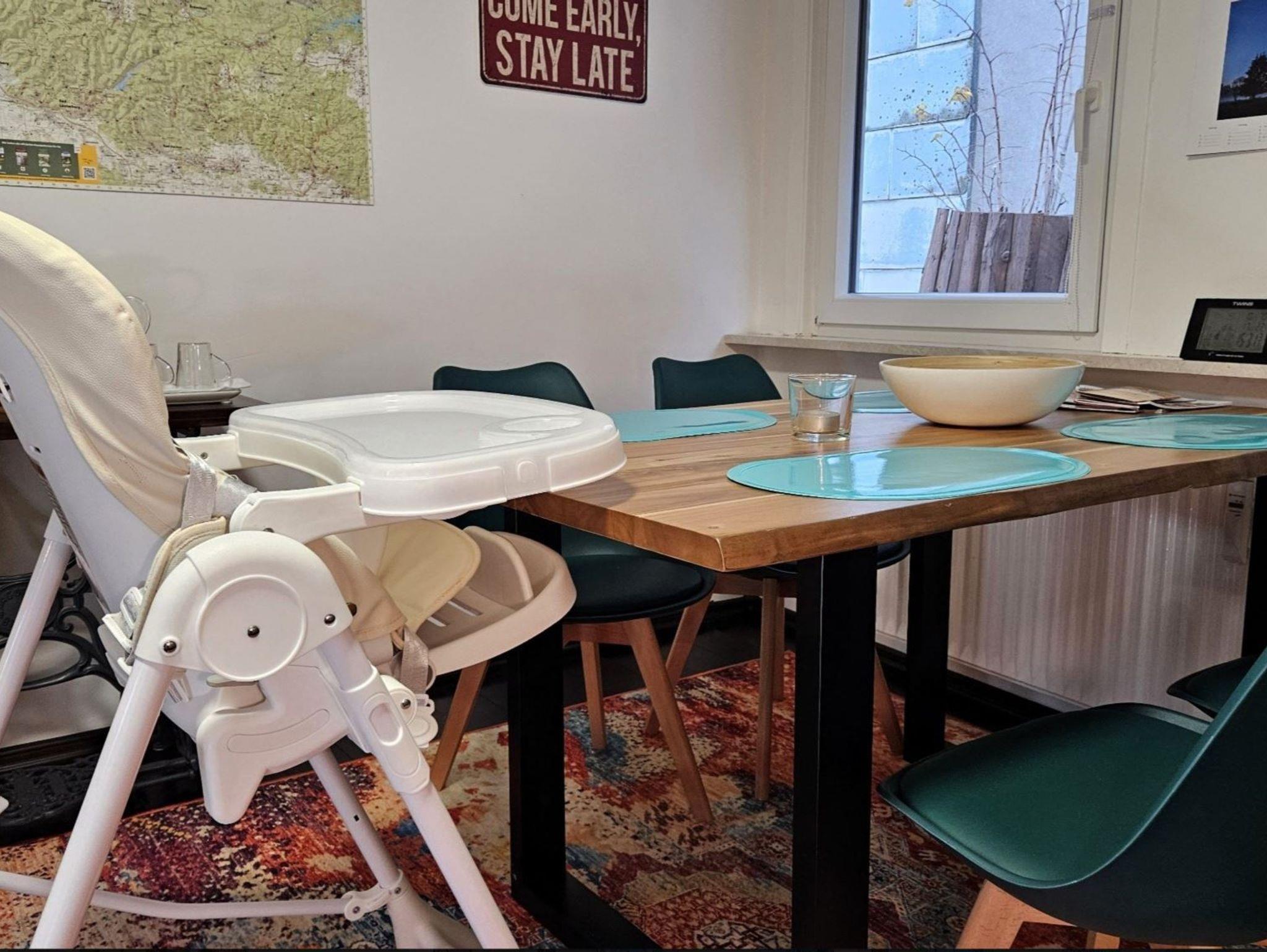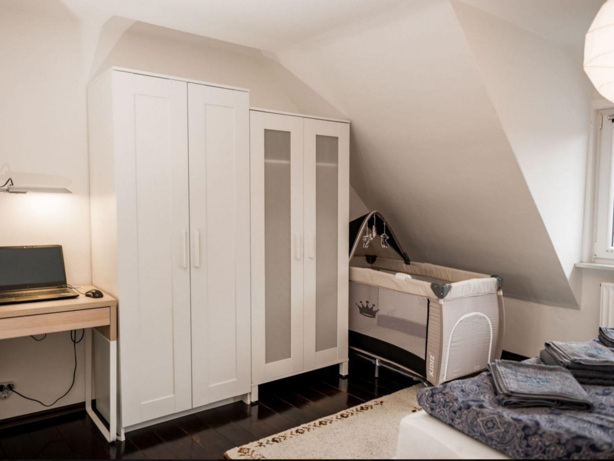 Unsere modern eingerichtete Ferienwohnung verfügt über ein großzügiges Schlafzimmer, ein Wohnzimmer, eine Küche und ein Badezimmer. Im Schlafzimmer steht ein Doppelbett (180 x 200 cm), das Platz für maximal zwei Erwachsene und ein Kind bis 3 Jahre bietet. Bei Bedarf können ein Kinderreisebett mit Bettwäsche sowie ein Kinderhochstuhl kostenlos bereitgestellt werden. Handtücher und bezogene Betten sind ebenfalls vorhanden. Die Wohnung liegt im Dachgeschoss (2. Etage), ist haustierfrei und eine Nichtraucherwohnung. Im Hof besteht jedoch die Möglichkeit zu rauchen.