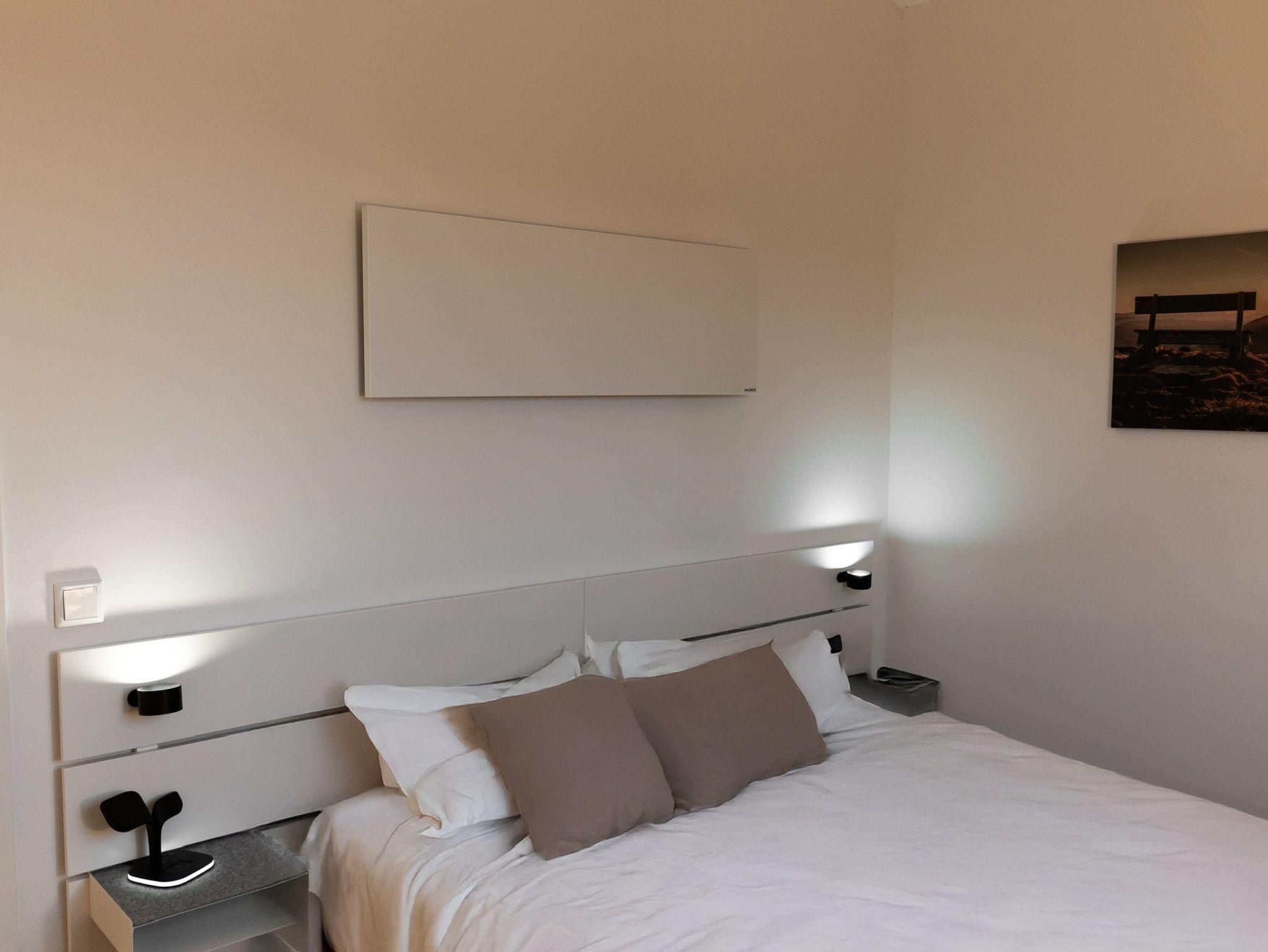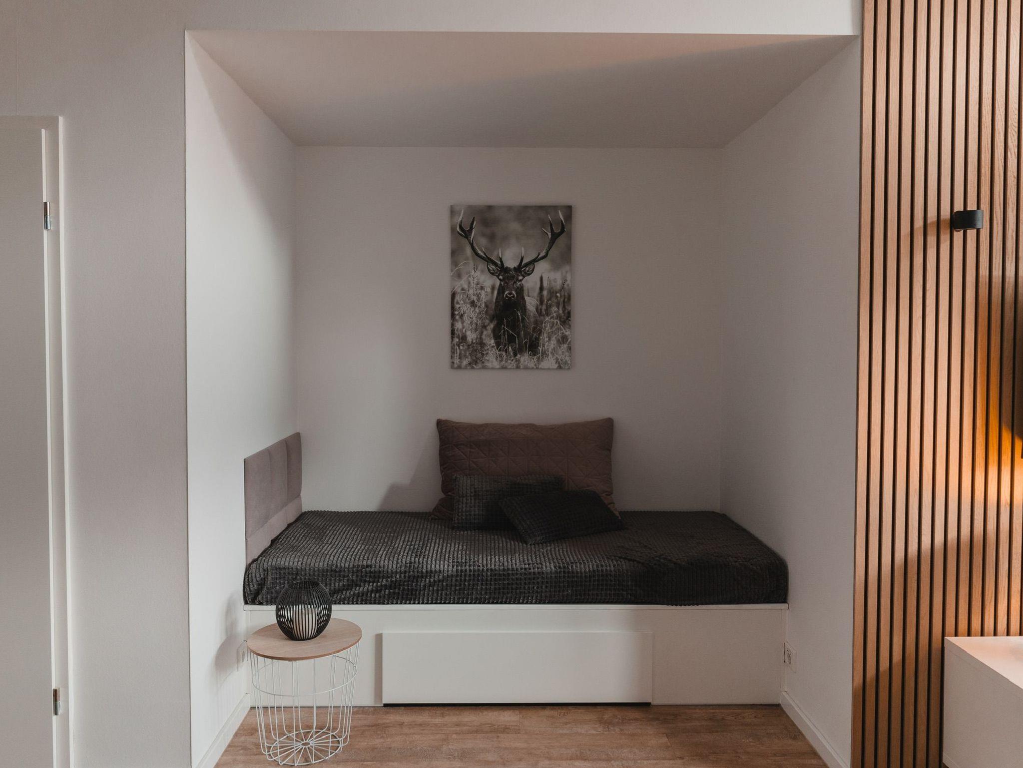 Das separate Schlafzimmer ist mit einem komfortablen Doppelbett ausgestattet und sorgt für erholsame Nächte. Eine zusätzliche Schlafgelegenheit (gegen geringen Aufpreis) bietet das gemütliche Alkovenbett im Wohnbereich ideal für Kinder oder als behagliche Lese- und Kuschelecke.
