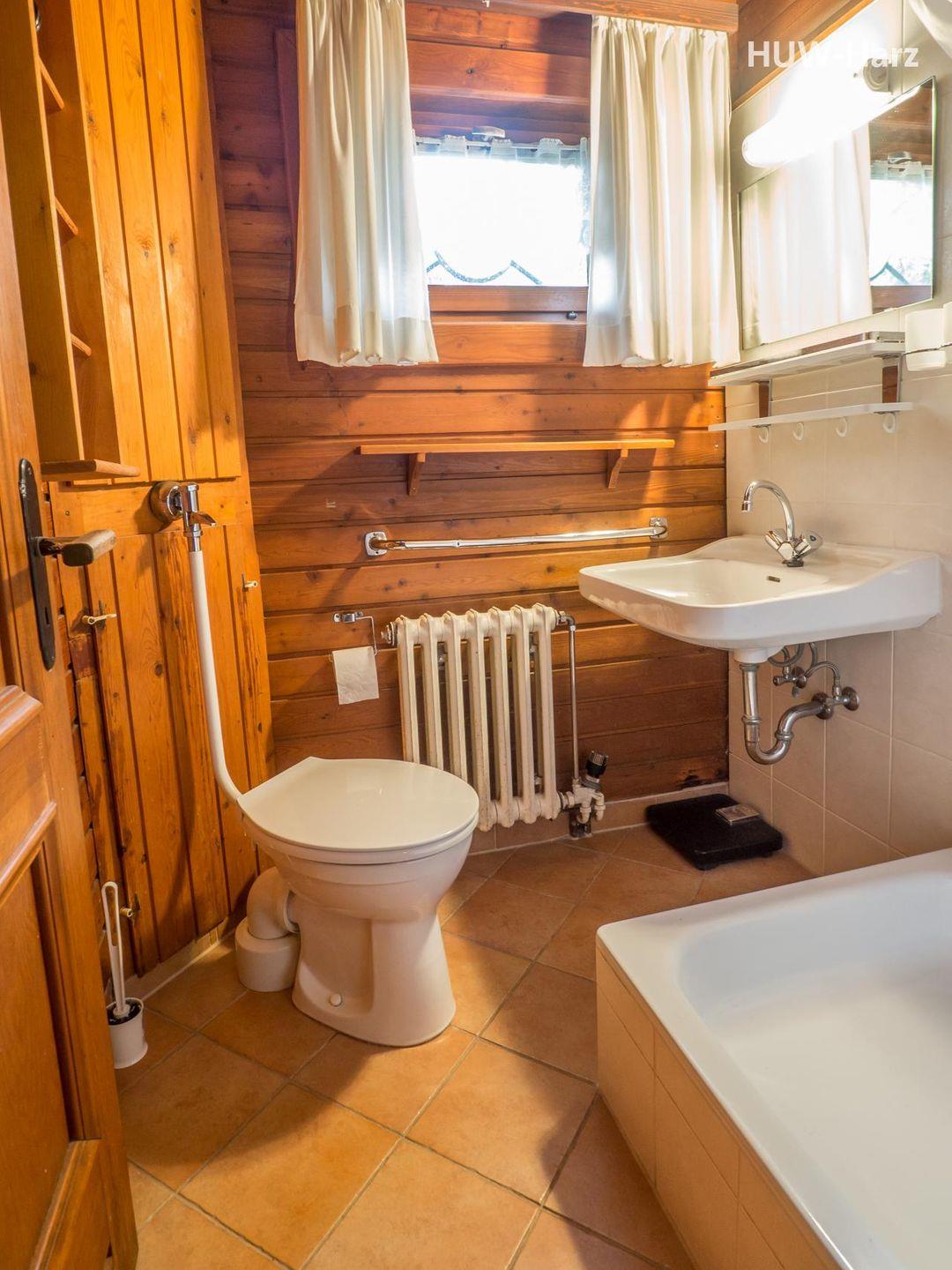 Die Räume sind naturbelassen und holzgetäfelt, die Ausstattung passend zum freundlichen Chalet Stil des Blockhauses.
