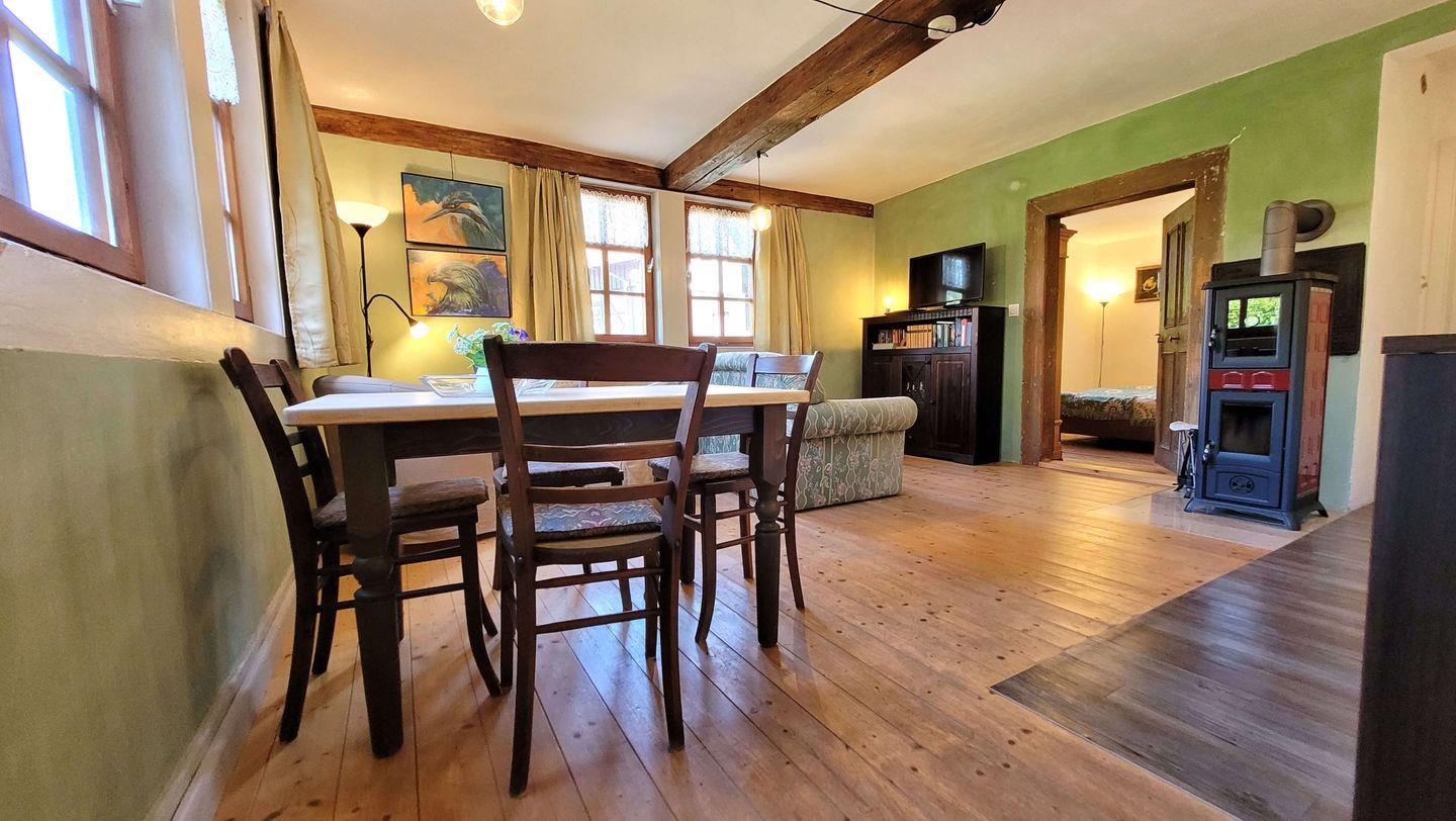 Willkommen in der denkmalgeschützten Lindenmühle, die im Schlosspark Glücksbrunn am Altensteiner Park liegt. Diese Ferienwohnung im restaurierten Fachwerkhaus bietet ein gemütliches Ambiente für 2 Personen und zeichnet sich durch einen Kamin im Wohnbereich aus, der für besondere Gemütlichkeit sorgt. Brennholz steht gegen eine kleine Gebühr zur Verfügung, sodass Sie nach einem erlebnisreichen Tag die Abende bei prasselndem Feuer genießen können.
