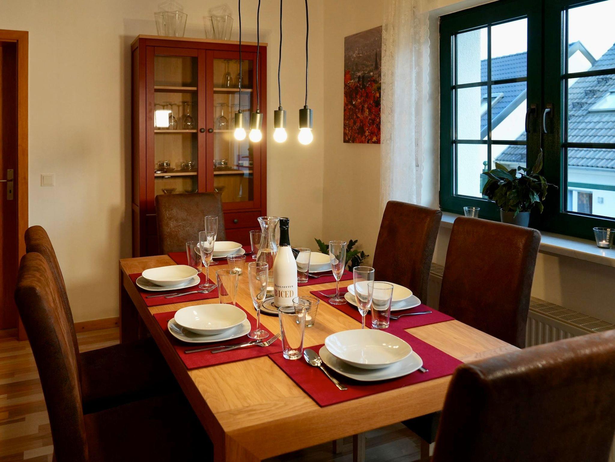 Der großzügige Wohnbereich lädt zum Essen und geselligem Zusammensein ein. Auch einem gemütlichen Fernsehabend mit einem guten Tropfen steht nichts im Wege.