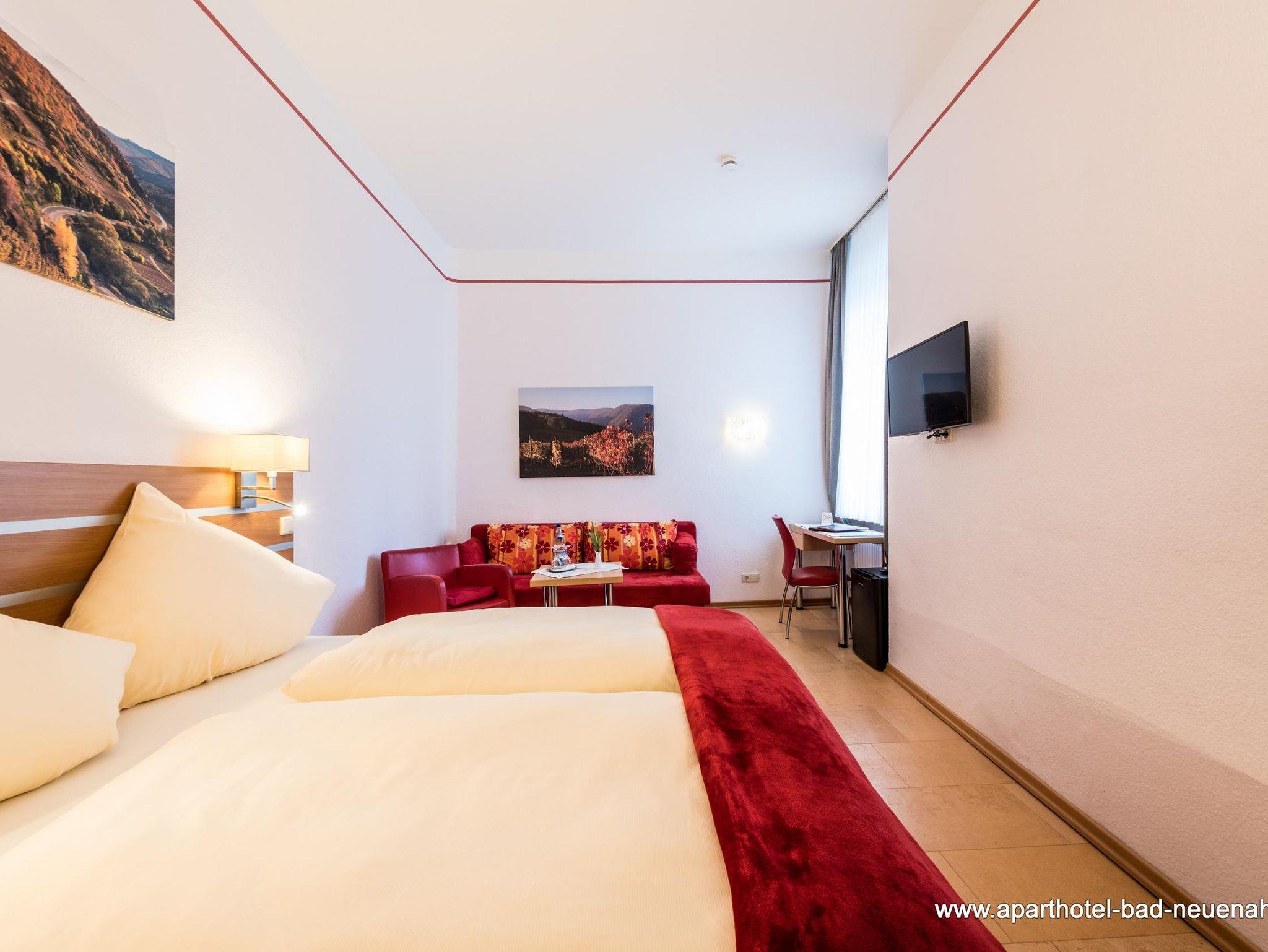 Unsere großzügigen Komfort-Doppelzimmer bieten den Komfort eines 3-Sterne-Hotels und sorgen für einen angenehmen Aufenthalt – ideal auch für längere Aufenthalte in Bad Neuenahr-Ahrweiler.
