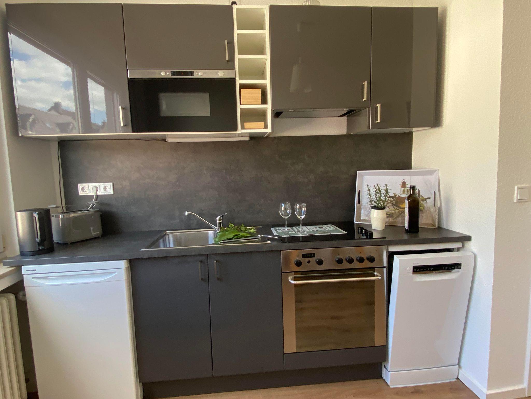 Die Wohnküche bietet alles was das Herz begehrt. So haben sie mit der Mikrowelle die Möglichkeit für einen schnellen warmen Imbiss und auf dem ebenso vorhandenen E-Herd mit Backofen können auch umfangreiche, warme Mahlzeiten zubereitet werden. Selbstverständlich sind dazu alle Kochutensilien inklusive Geschirr und Besteck ebenfalls vorrätig, sodass sie sich bei der Anreise dazu sicherlich keine Gedanken machen müssen. Nach dem Essen sorgt die eingebaute Spülmaschine schnell wieder für Ordnung in der Küche und der große Kühlschrank bietet genug Platz für alle benötigten Vorräte. Selbstverständlich ist eine Kaffeemaschine für einen „Gutenmorgen-Kaffee“ auch in einer gut sortierten Küche vorhanden. Ein Starterpaket für die Küche liegt bereit. Ein grosser Flachbildschirm als Smart TV ist zum Fernsehschauen in der Küche samt kleiner Couch, damit das Schlafzimmer ein Ruheraum sein kann. Zum Streamen steht kostenlos ein Wlan zur Verfügung.