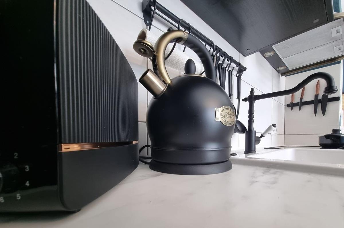 Küche mit Kücheninsel im Industrial Stil mit Backofen, Ceranfeld, Mikrowelle, Wasserkocher, Toaster, etc.