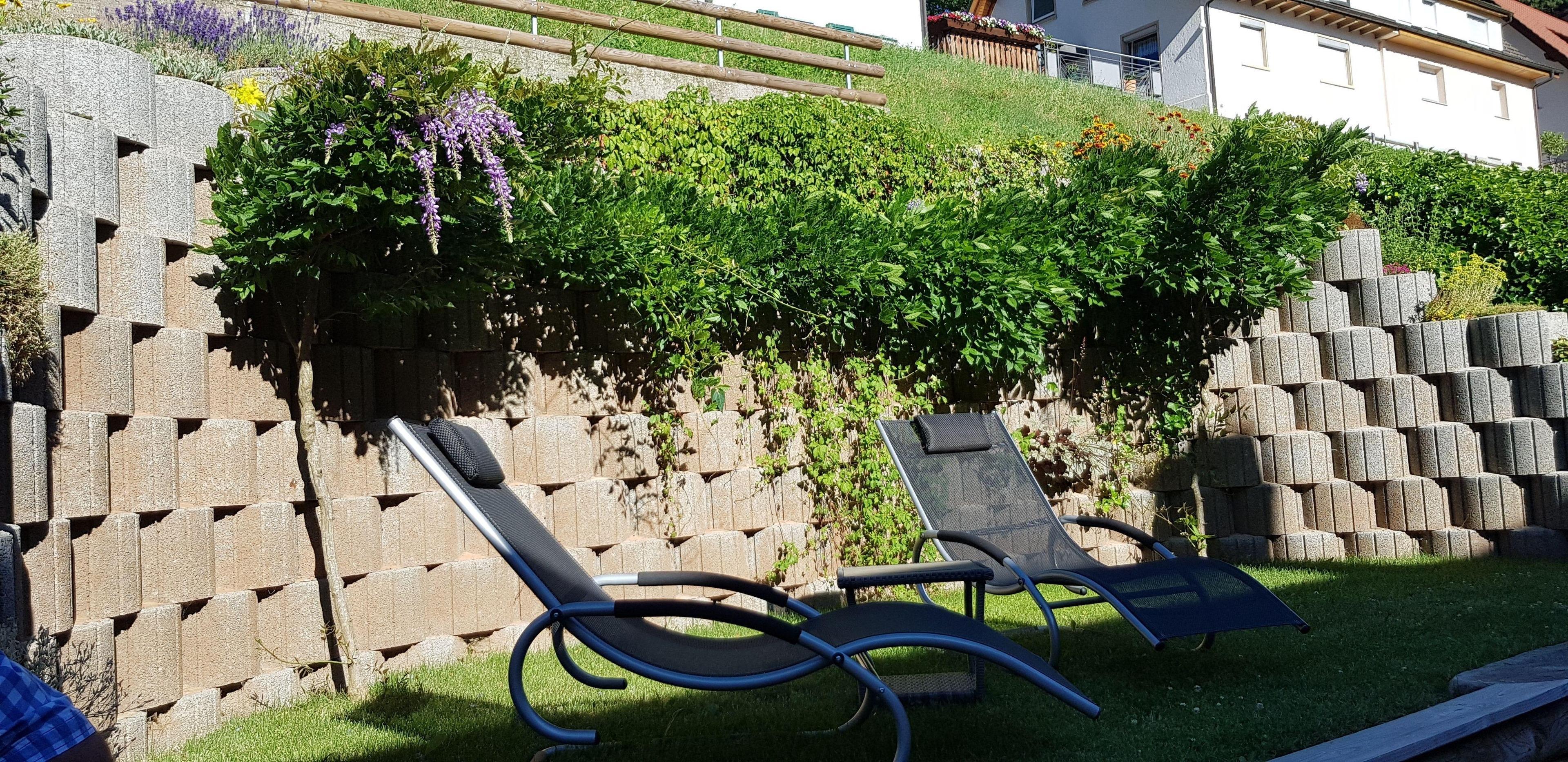 Eine große Sonnenterrasse (38 qm) steht zur freien Verfügung, ebenso der Garten mit einem Freisitz und Sonnenliegen.