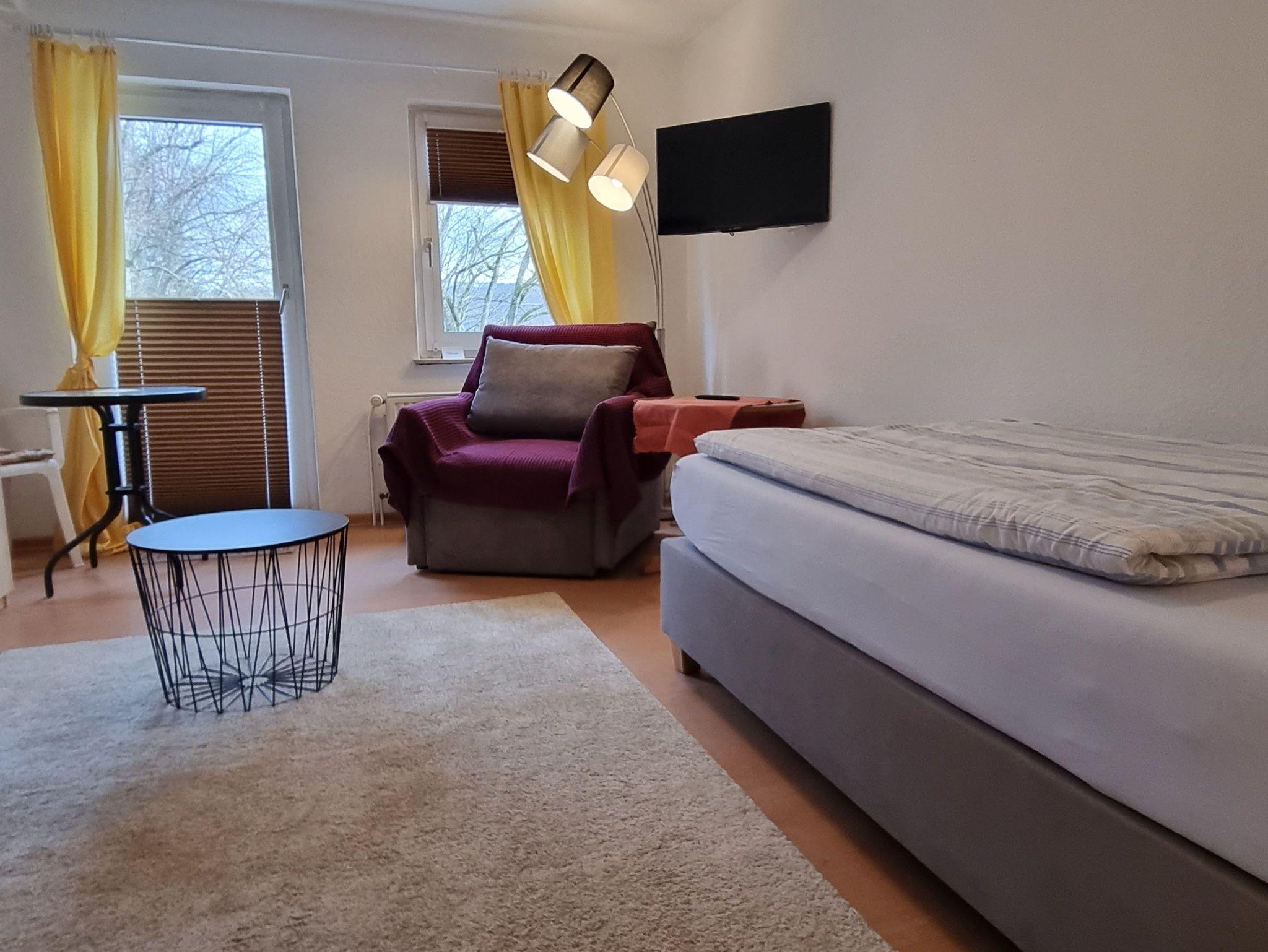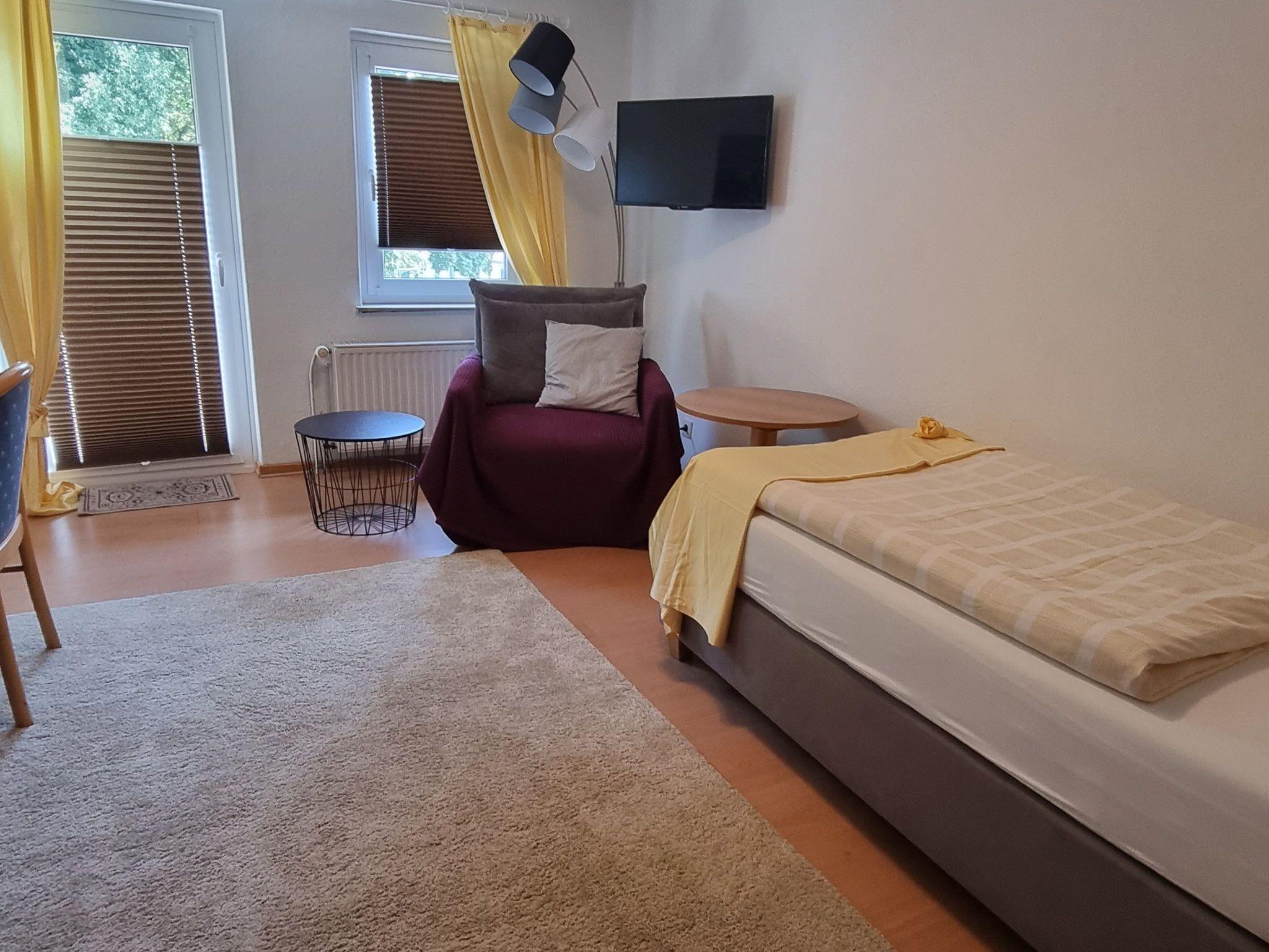 Ausgestattet ist dieses Gäste-Appartment mit zwei Schlafräumen- einem Einzelzimmer ( Einzelbett) und einem Doppelzimmer (Doppelbett auch trennbar als TWIN-Bett), voll ausgestattet wie Hotelzimmer, mit Schreibtisch, Sitzgruppe, TV, Zugang zum gemeinsamen kleinem Balkon mit Blick auf die Stadtmitte und der Kurparkanlage.. Eine Aufbettung für 3te Personen, z.b. Kinder ist mit den vorhandenen Schlafsessel (da aufklappbar) mit einer Größe bis zu 1,70 m möglich. Ein Klappbett (2,00 m Größe) auf Anfrage! Babybettchen sind nicht vorhanden.