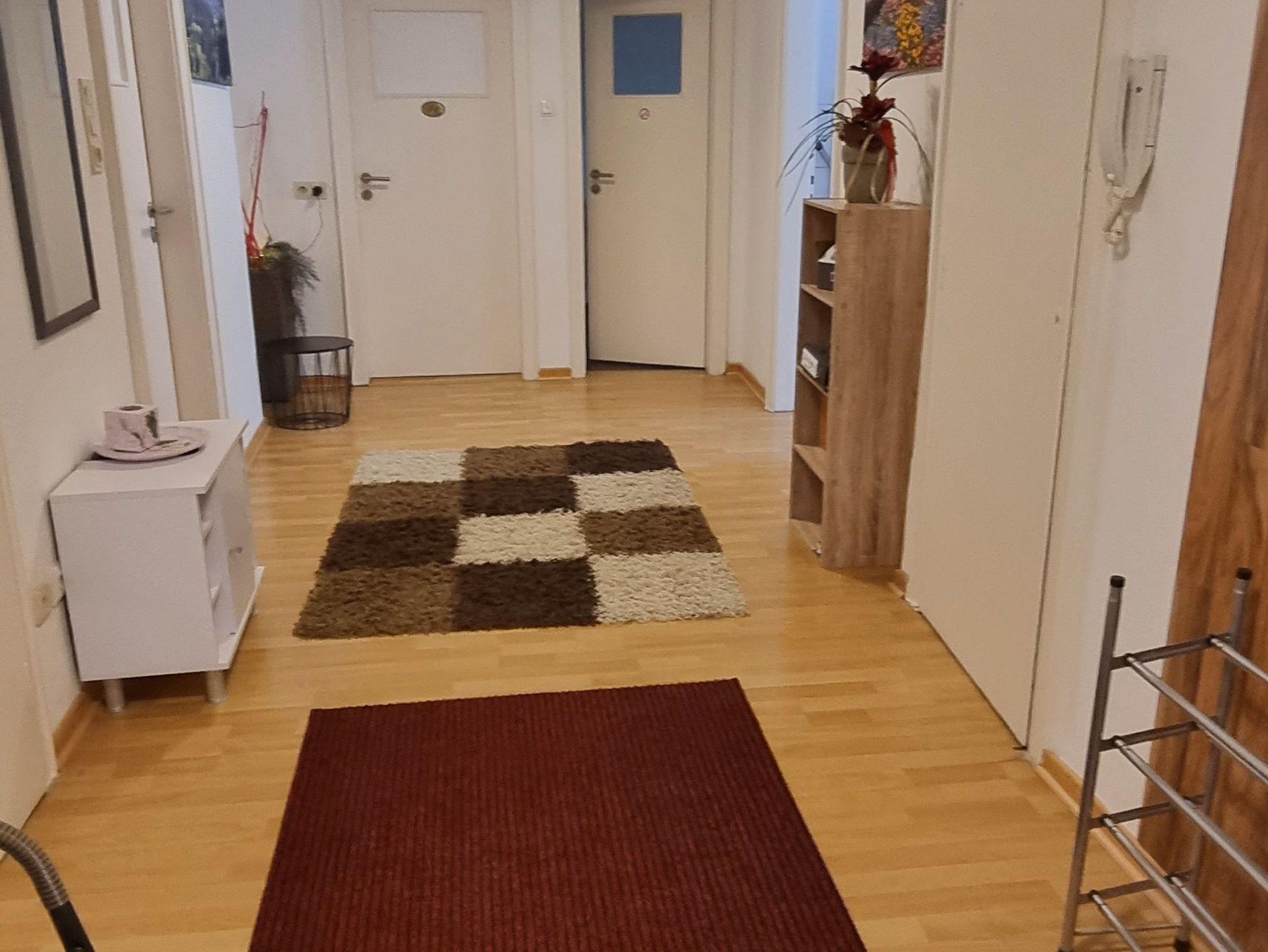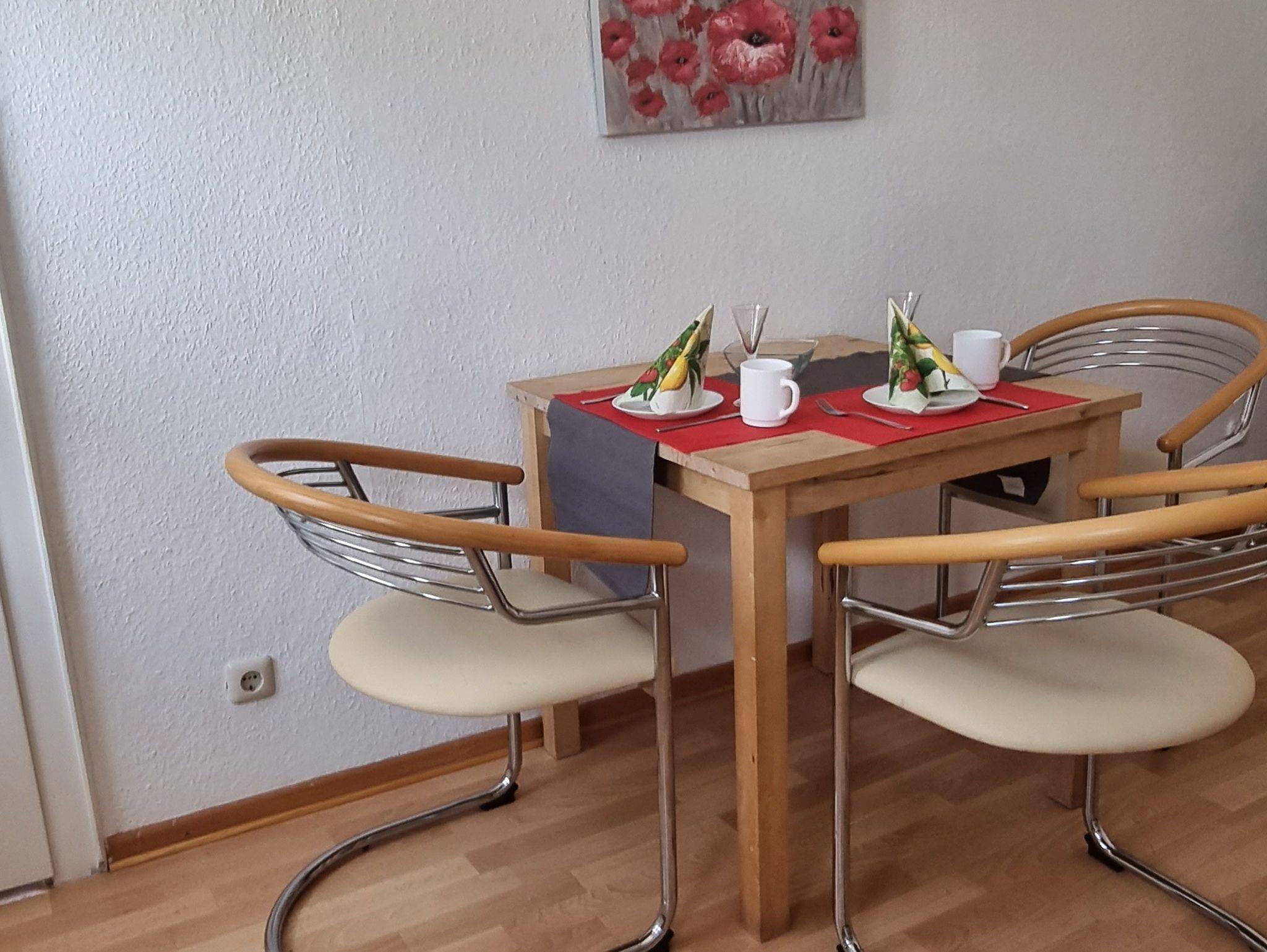 Im Esszimmer befindet sich eine Küche mit Kühlschrank, 4 Platten-Herd, Backofen, Mikrowelle und eine Waschmaschine. Spüle, Wasserkocher und Kaffeemaschine. ebenfalls ein KüchenhandtücherSet. Angrenzend ein Abstellraum. mit Müllsortierungscontainer, diverse Putzutensilien, ein Bügelbrett, Bügeleisen, Wäscheständer, Müllplan und ein Küchenfeuerlöscher. Ein Essbereich bietet Platz für 3 bis 4 Personen. erwähnen möchte wir, das Einkaufsmöglichkeiten fussläufig in der Umgebung, entlang der Schillerstrasse vorhanden sind.