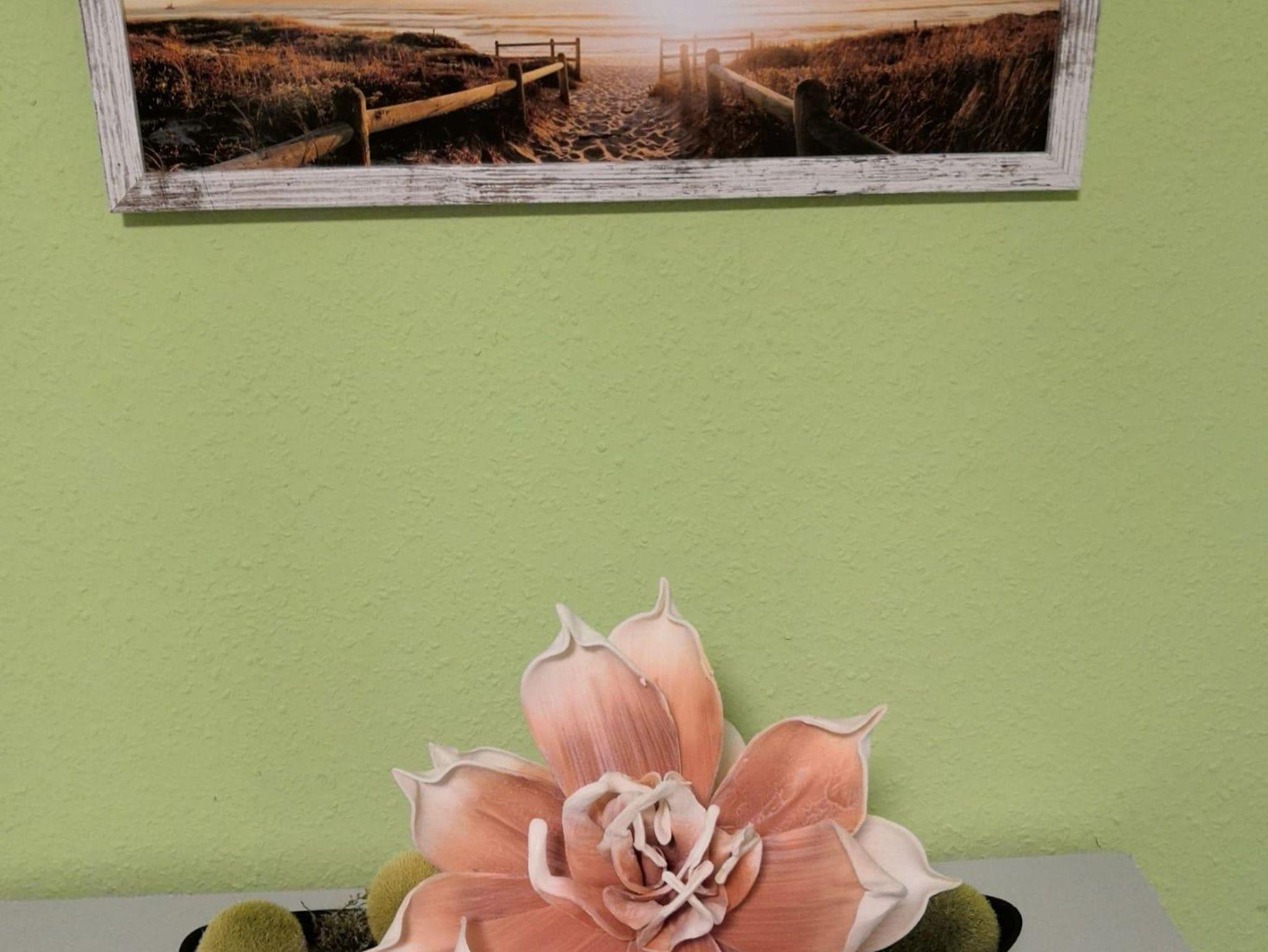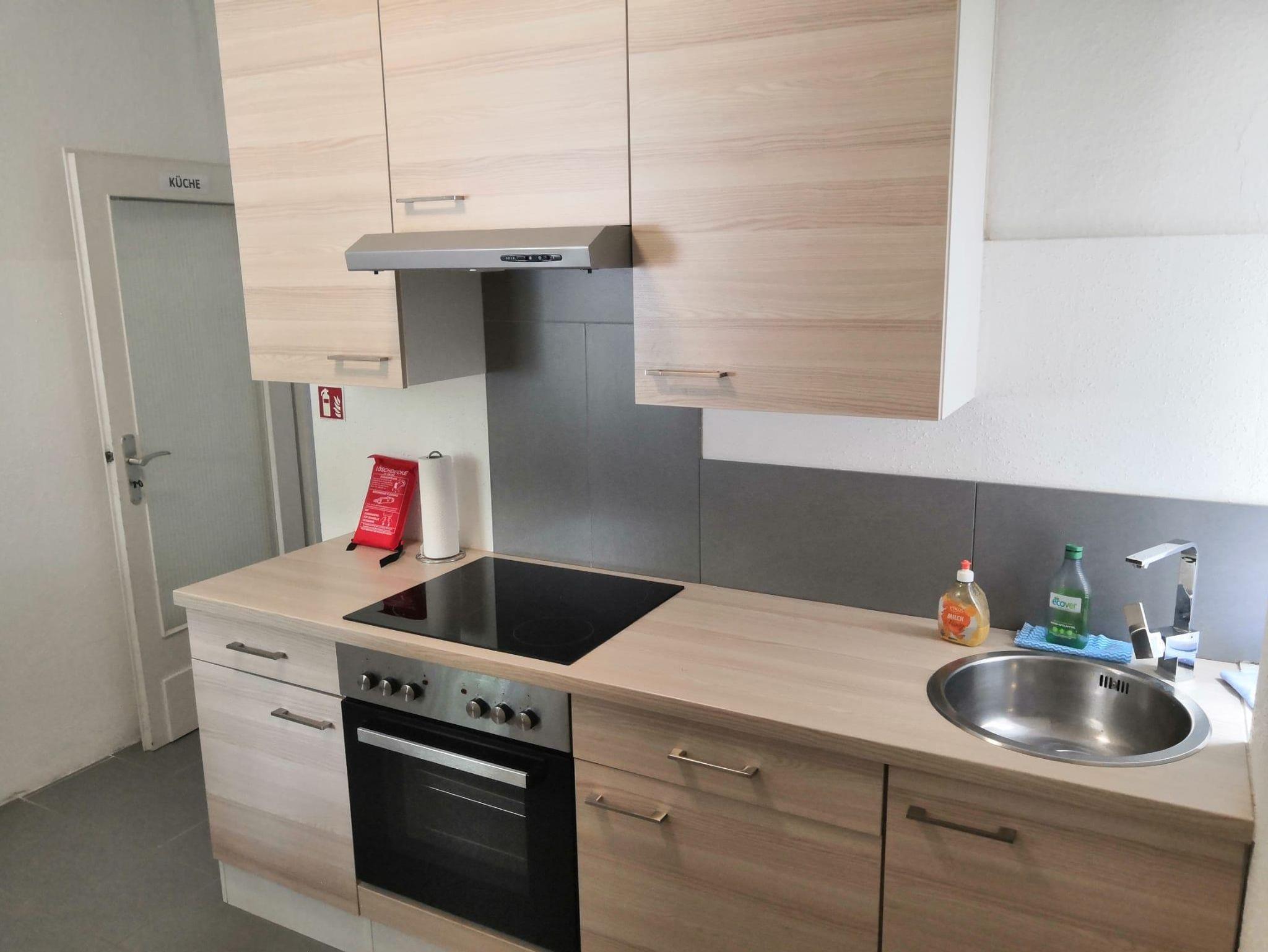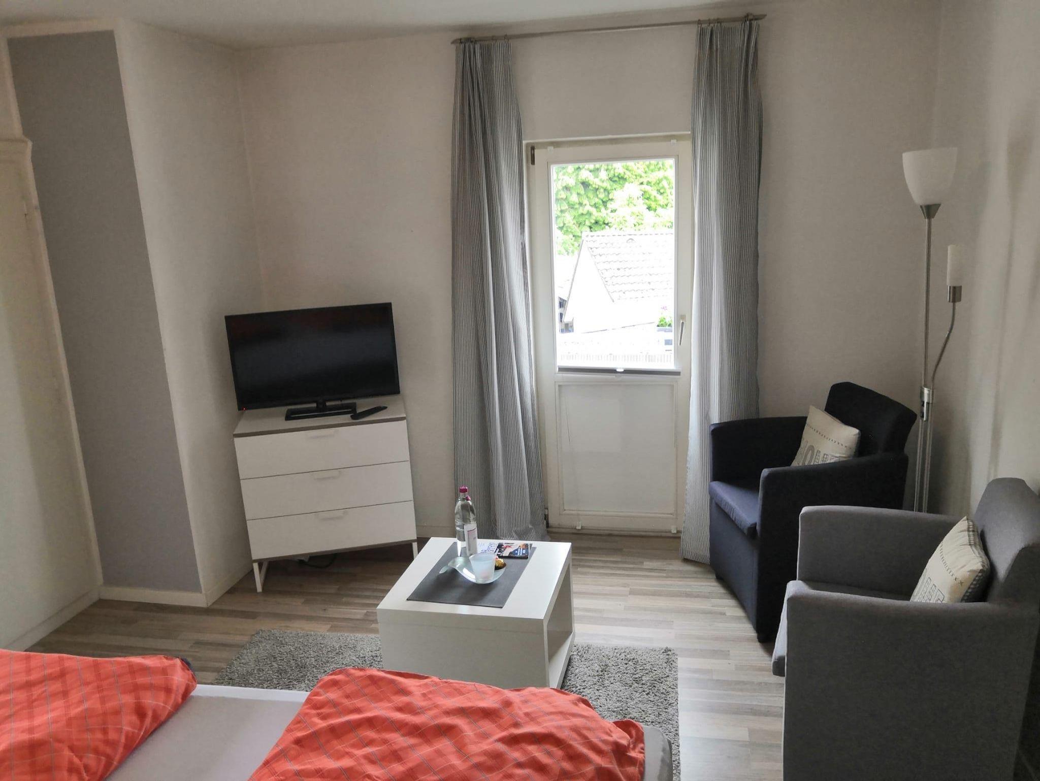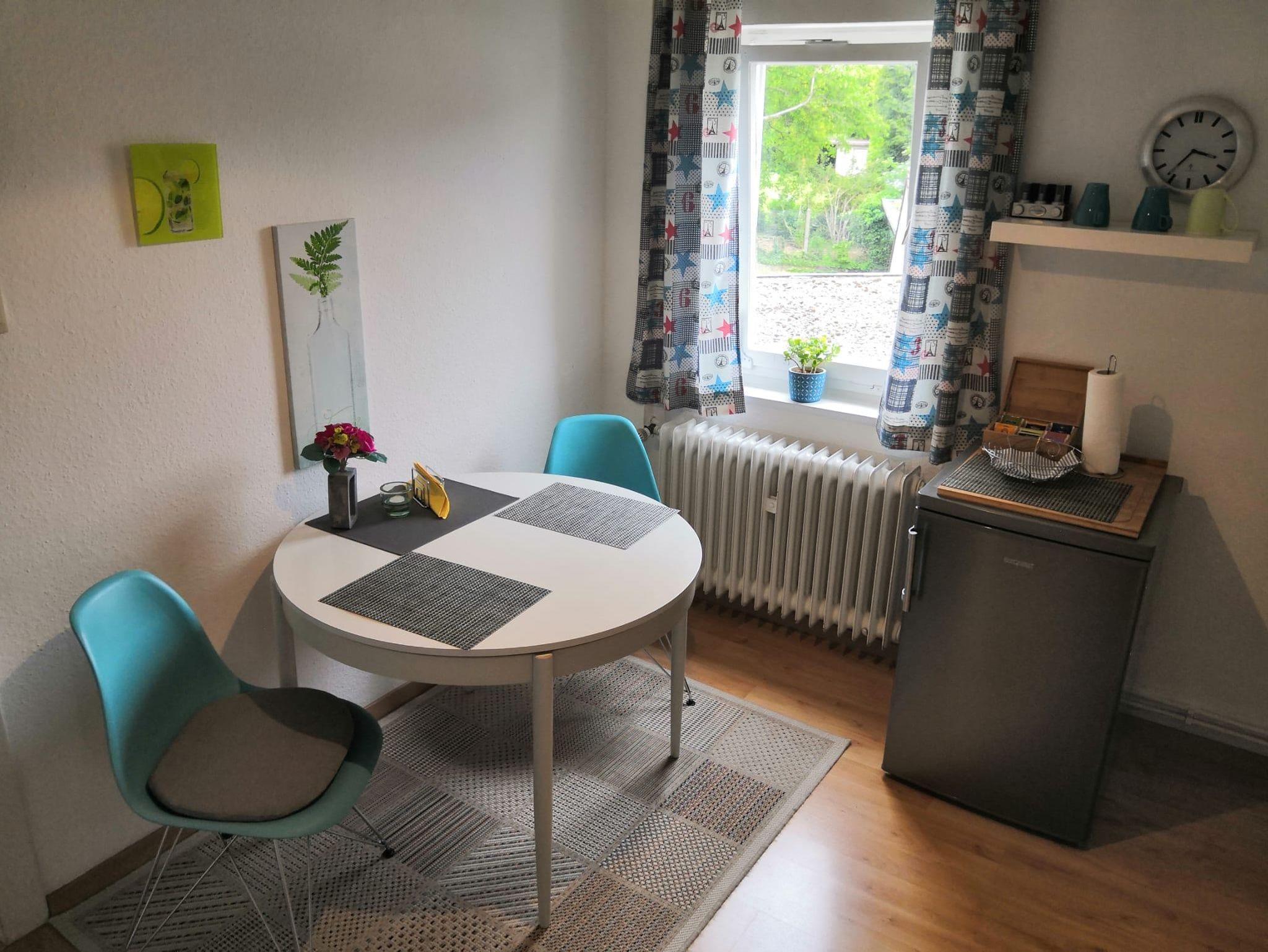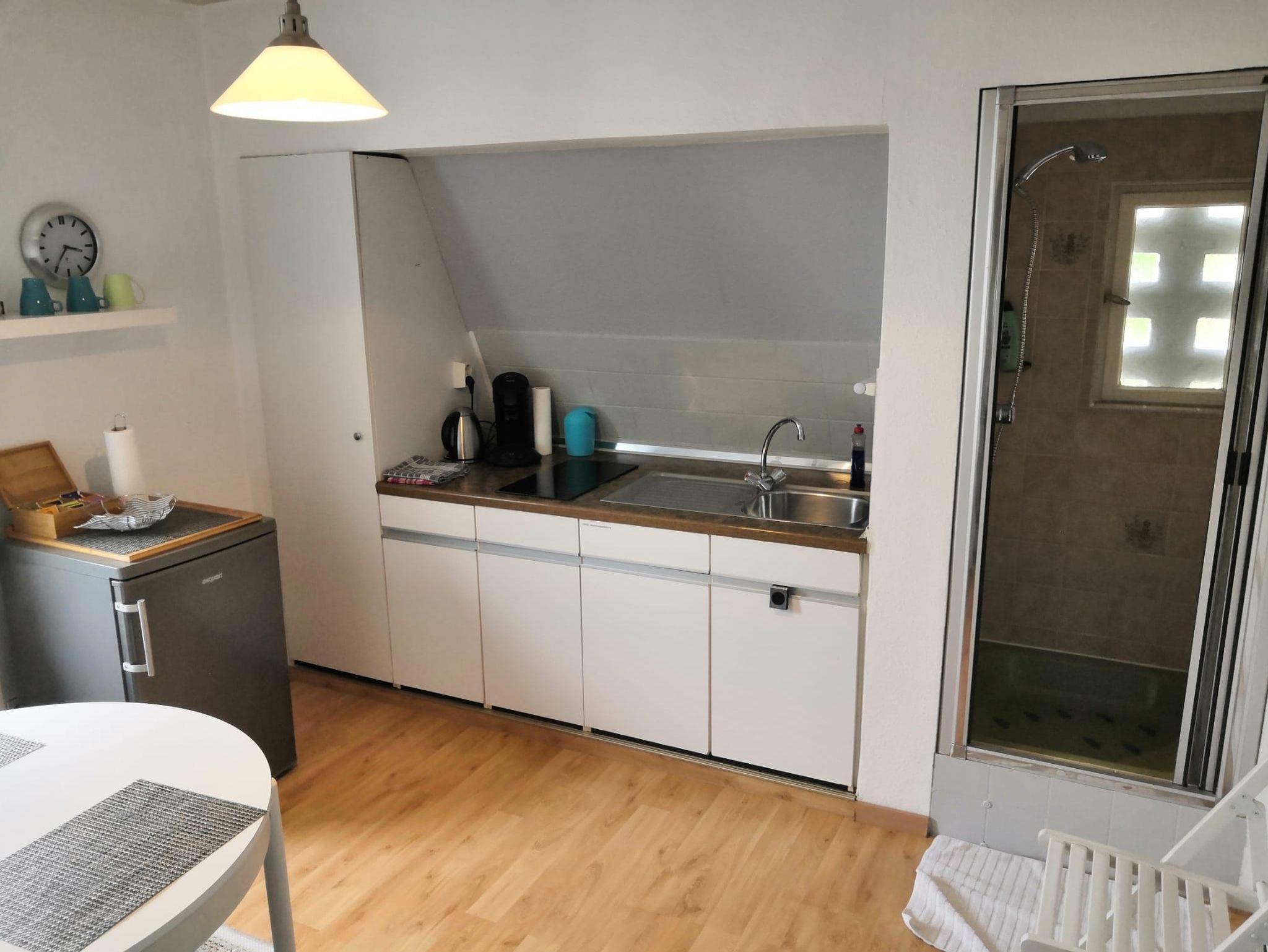 Diese sehr praktische und romantische 1 Zimmer Ferienwohnung /Appartement 1ZiKB (33 qm) liegt im 2. OG rechts auf der Ostseite des Haupthauses und ist mit kleinem überdachten Balkon besonders bei vielen Paaren und Einzelpersonen sehr beliebt. Sie kommen über einen kleinen Flur entweder links in das Wohn-&Schlafzimmer mit schönem King / Queen Bett (Boxspringbett) mit einem Wandschrank und Sitzmöglichkeiten. Es ist mit größerem Fernseher (Kabel-TV), sowie schneller Internetverbindung (WiFI) ausgestattet. Von hier aus gelangen Sie auf Ihren überdachten Balkon mit Seitenschutz (Ostseite). Wohnungseingang gerade aus befindet sich separat ein kleines Bad/WC mit Fenster. Die Dusche ist im Küchenbereich rechts. Große Küche mit modernem Esstisch aus Glas für 2 Personen, allem Notwendigen und mit folgenden Geräten ausgestattet: Spüle, Herd mit 2-Kochplatten, Kühlschrank mit Gefrierfach, Toaster, Eierkocher, Kaffeemaschine und Wasserkocher. Eine Mikrowelle und ein Backofen können bei Bedarf in der gemeinsamen größeren Küche im EG genutzt werden.