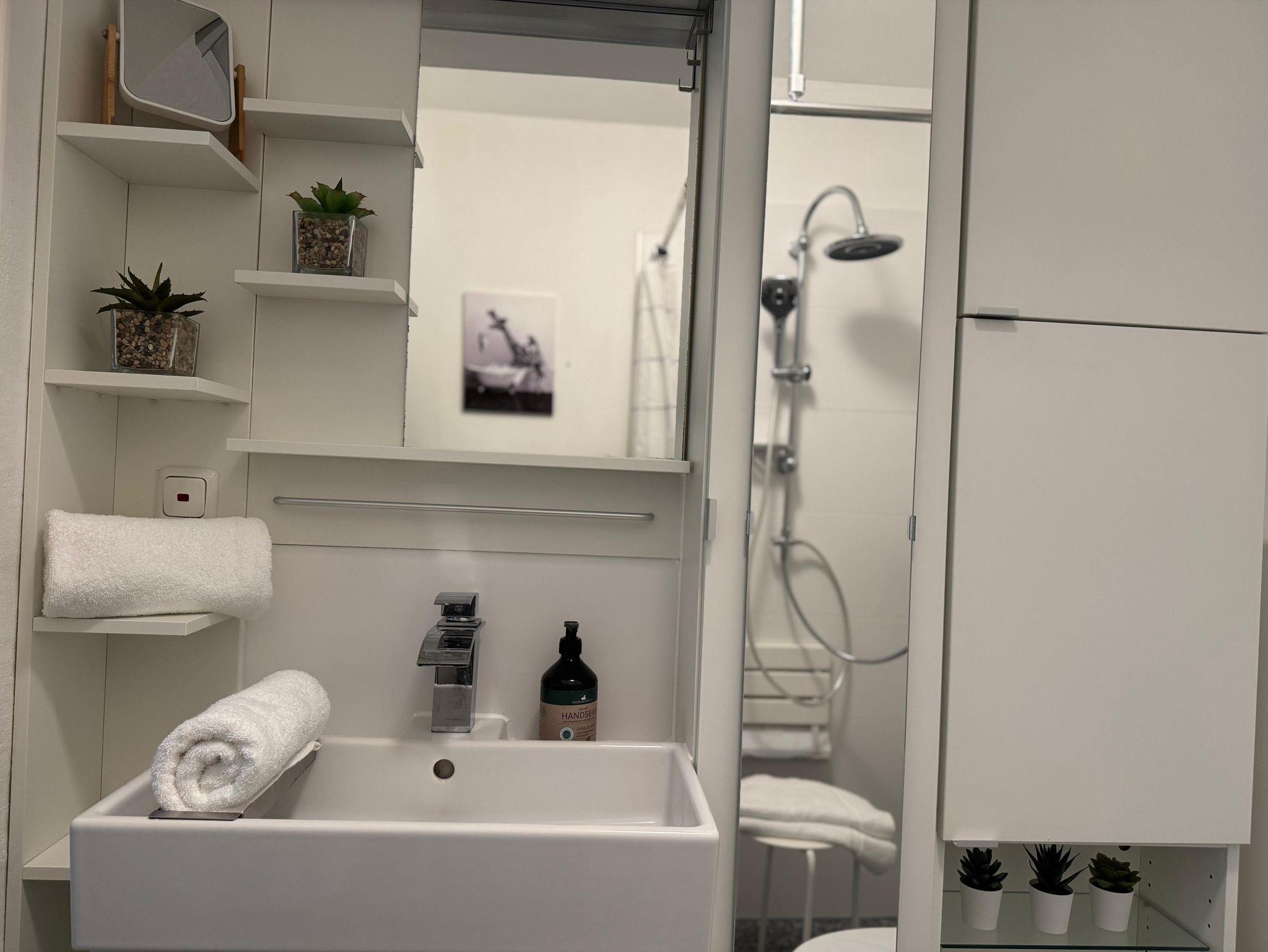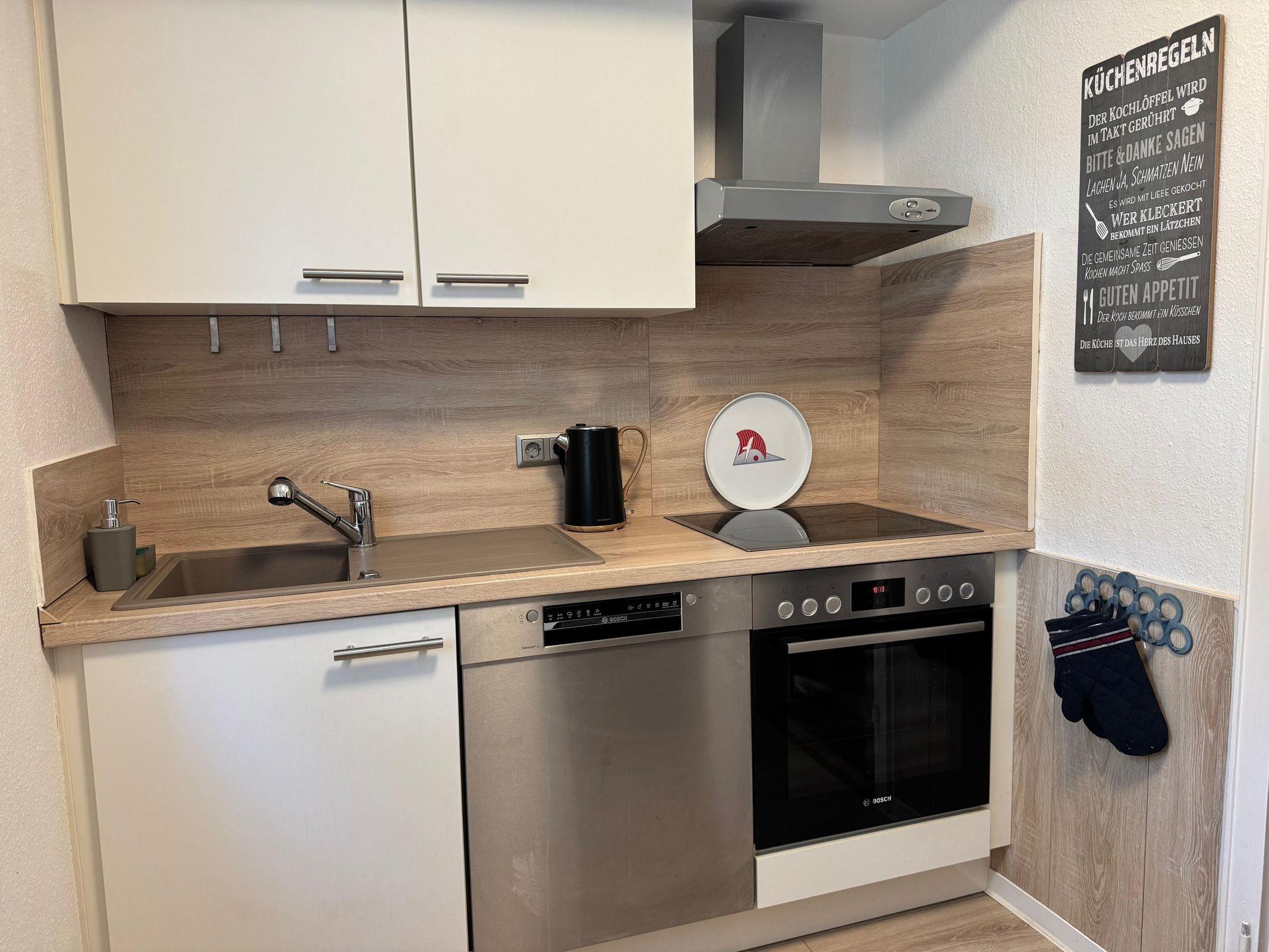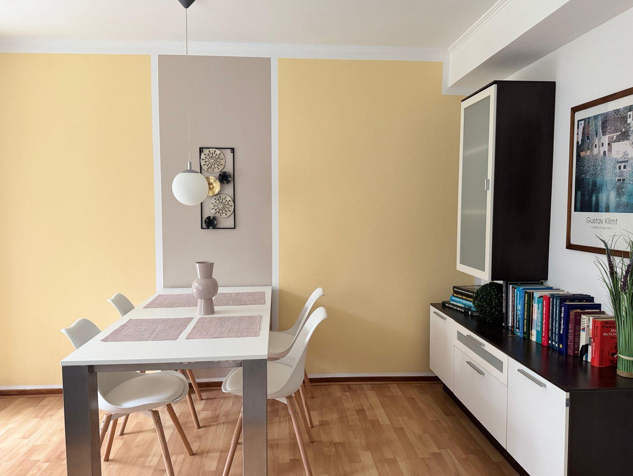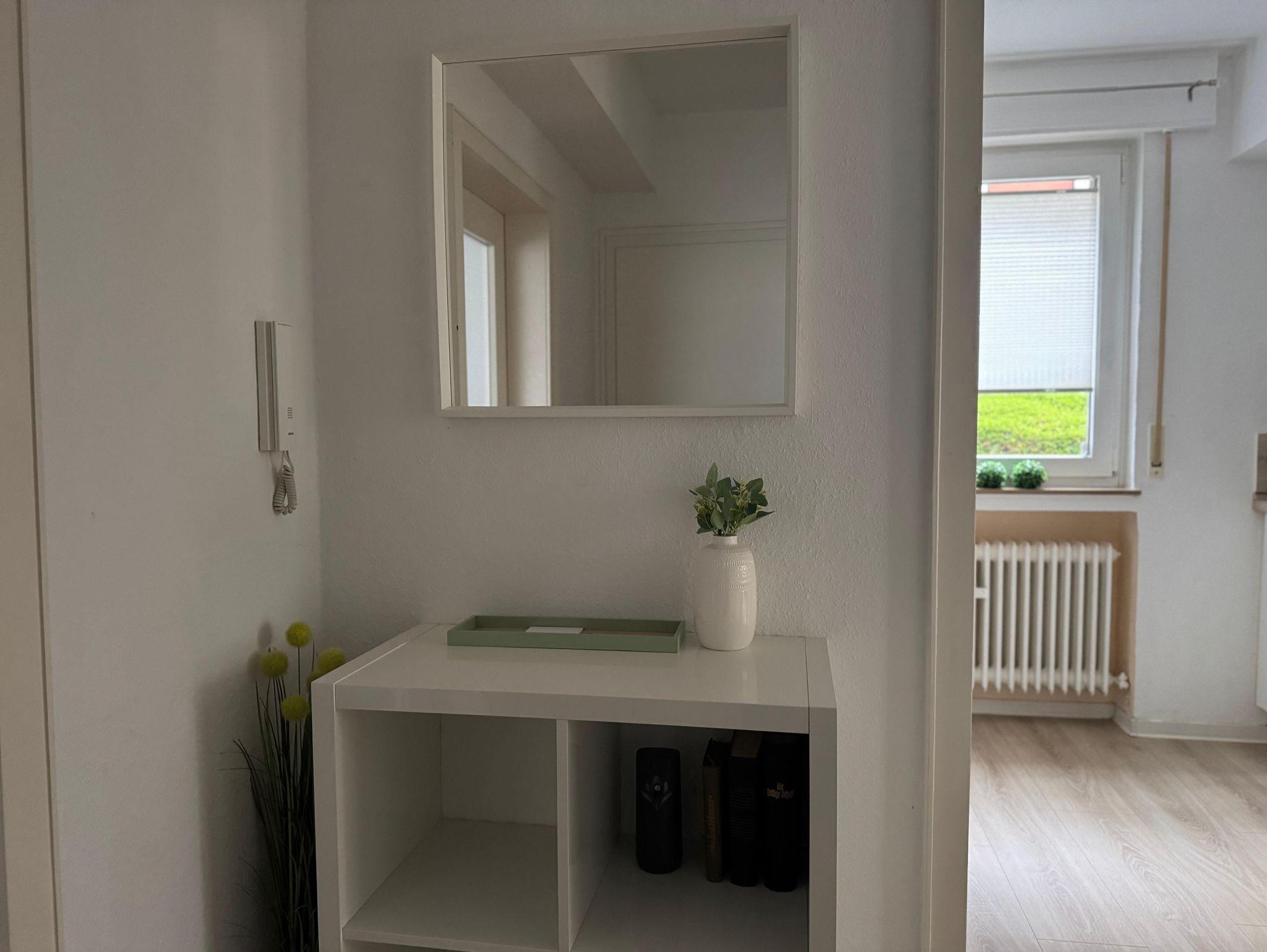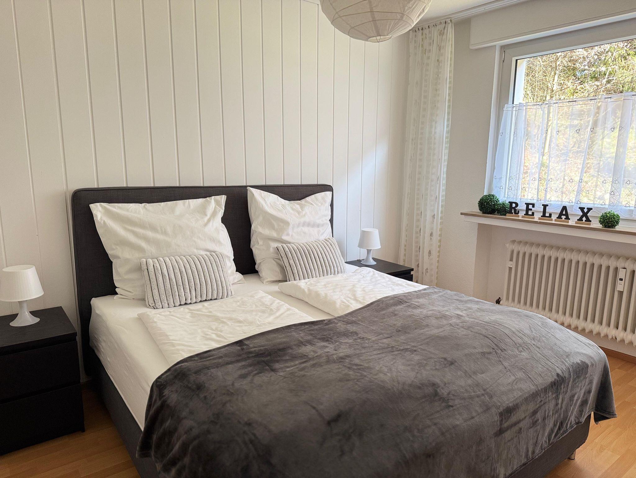 Die moderne Ferienwohnung lädt mit seinem modernen und komfortablen Charme zur Erholung ein. Vergessen Sie in der gemütlichen und mit Liebe zum Detail eingerichteten Wohnung den Alltag oder erholen Sie sich von Ihren Aktivitäten in und um Bad Pyrmont. Ein Komfort-Boxspringbett lädt zum Träumen ein und in dem großen Kleiderschrank und einer Kommode haben Sie viel Platz zum Verstauen Ihrer Garderobe. Zwei große Smart TVs befinden sich im Wohnbereich und im Schlafzimmer. Kostenloses Internet / WLAN rundet das Angebot ab. In der geräumigen Küche befinden sich ein Kühlschrank mit Gefrierfach, Geschirrspüler, Ceranherd mit Backofen, Wasserkocher, Kaffeemaschine, hochwertiges Porzellan, Besteck, Gläser, Töpfe und Pfannen, sowie Grundgewürze, Kaffee und Tee. Im hochmodernen Dusche/WC-Bad befinden sich eine bodenebene Rain-Shower-Dusche mit separater Handbrause, Seife und Shampoo, ein Fön und ein Verbandsset sowie ein Handtuchhalter aus Teakholz für Ihre Handtücher. Wir stellen Ihnen Hand- und Badetücher, Geschirrtücher, sowie sämtliche Hygienepapiere zur Verfügung. Der Wohn- und Essbereich bietet genügend Platz zur Entspannung und besticht durch sein sonnendurchflutetes Flair. Eine gemütliche Sitzgruppe und ein großer Esstisch laden dazu ein, Mahlzeiten in entspannter Atmosphäre zu genießen. Geschmackvolle Bilder und Accessoires komplettieren den Gesamteindruck und unterstreichen das gemütliche Ambiente. Genießen Sie die Natur mitten in der Stadt und trotzdem im Grünen, auf der ruhigen und überdachten Terrasse auf bequemen Teakholzmöbeln. Sie finden bei uns Bettwäsche, Handtücher, Badetücher, Hygienepapiere, Seife, Shampo, Duschgel und noch vieles mehr vor. Das 62 qm große Apartment zeichnet sich durch seine zentrale Lage innerhalb von Bad Pyrmont aus. Durch die Hanglange bedingt, geht es erst einmal „abwärts“ für Sie, da sich das Apartment im zweiten Hausbereich im Parterre befindet. Sie gelangen über den Fahrstuhl oder eine Treppe hinab. Nun trennen Sie lediglich noch drei gut begehbare Treppenstufen von Ihrem Feriendomizil.