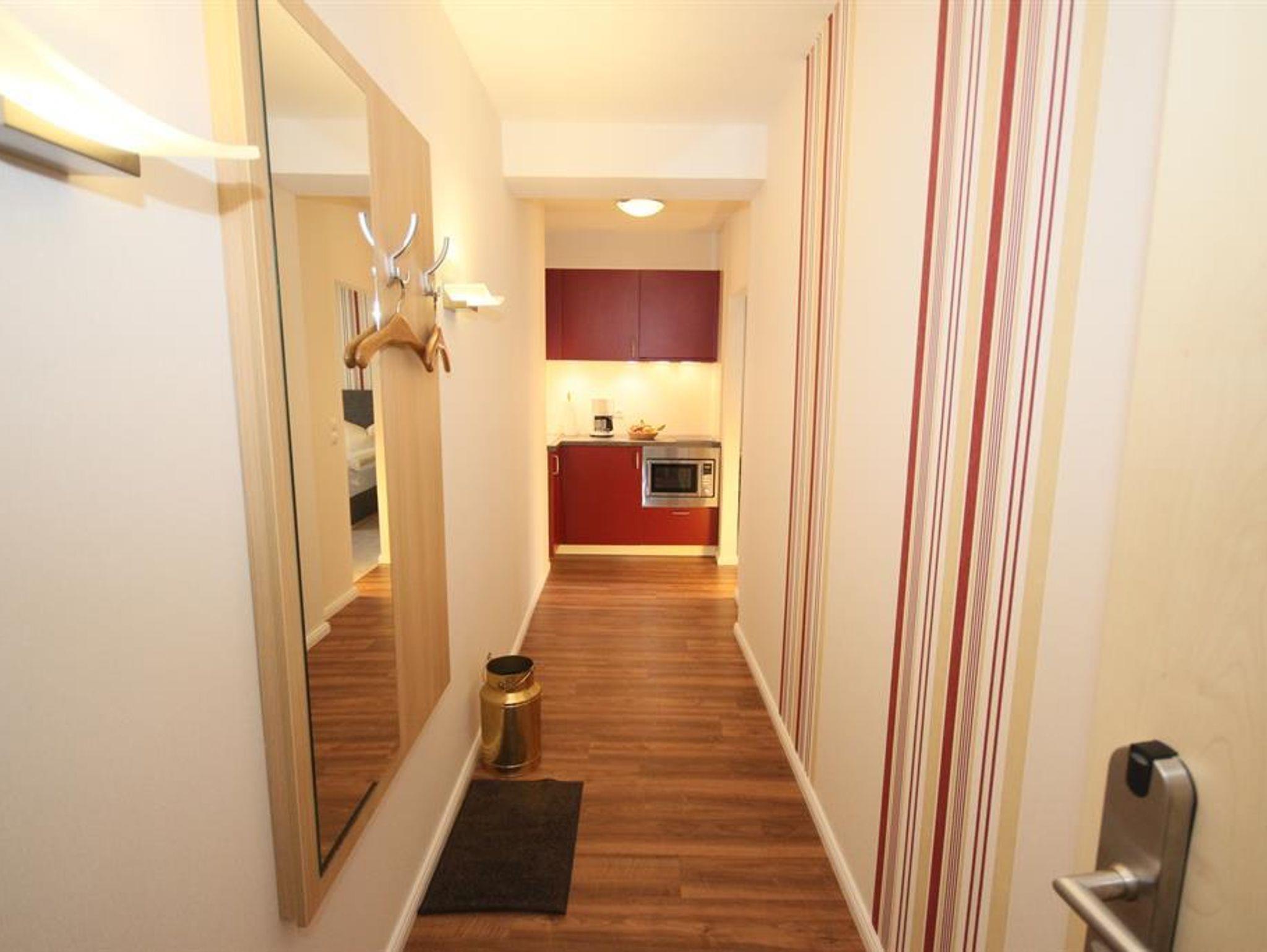 Das Einraumappartement ist ca. 22qm und mit einem Einzelbett (90x200cm) im kombinierten Wohn-/Schlafraum ausgestattet. Die Küchenzeile verfügt über Kühlschrank, Kaffeemaschine, Wasserkocher, 2-Platten Herd und Geschirr. Festnetztelefon, Flachbildschirm TV und WIFI .Das Badezimmer mit Dusche und WC rundet das Gesamtbild ab. Der Balkon richtet sich in Richtung Westen mit Blick auf die Hauptallee. Das Appartement ist mit dem Lift erreichbar.