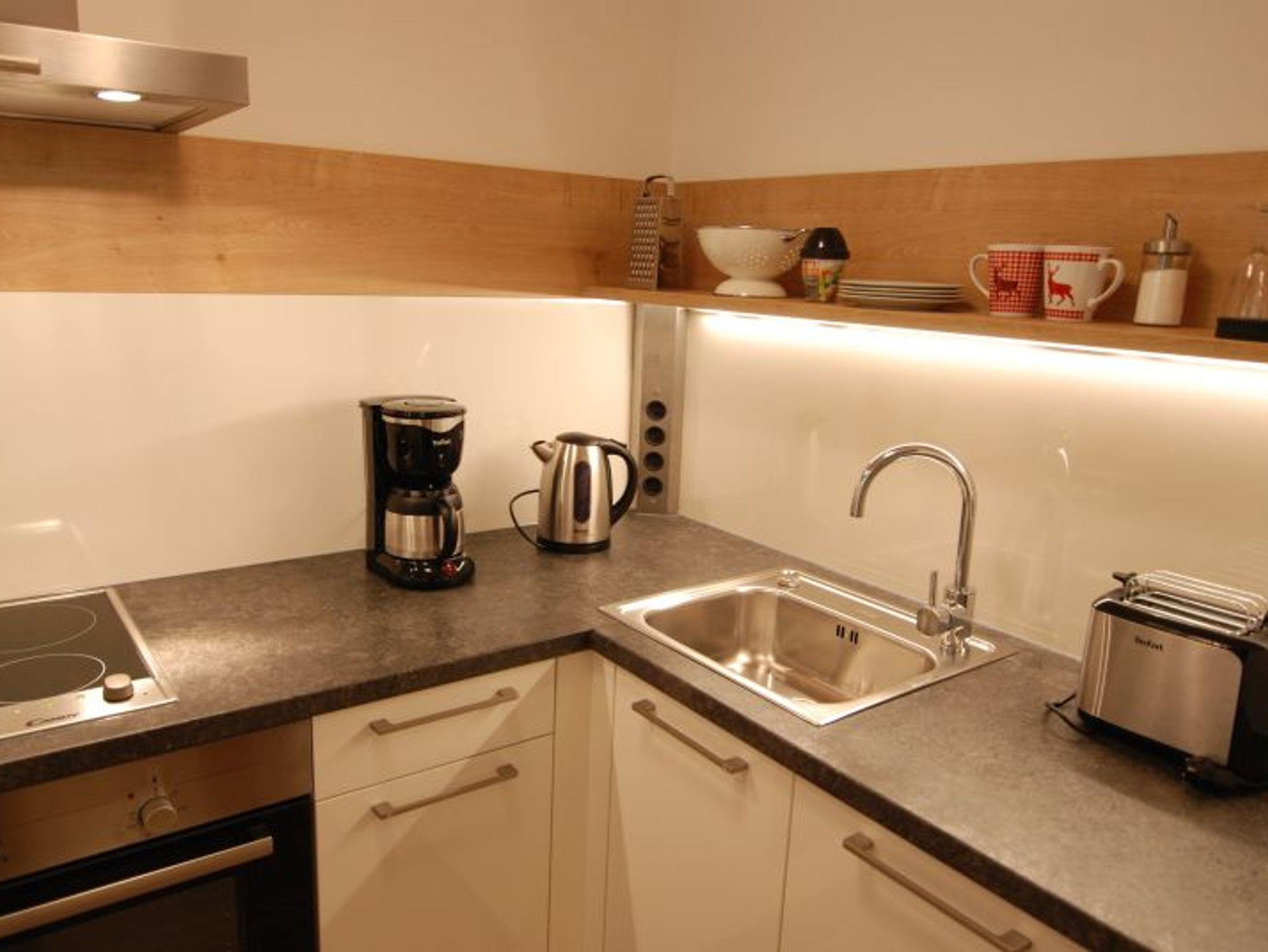 Dieses Studio-Apartment ist 38 qm groß und umfasst einen Wohn-/Schlafraum mit einem 1,60m breiten Doppelbett, einem Essbereich für 3 Personen, einen Sitzbereich mit einer gemütlichen Couch und einem 40-Flachbild-TV sowie ein Bad mit WC, Dusche und einem Haartrockner. In der gut ausgestatteten Küche mit Kaffeemaschine, Kochfeld, Backofen, Wasserkocher, Toaster, Kaffee und Tee, Gewürze, Essig und Öl können Sie sich gerne Ihre eigenen Mahlzeiten zubereiten.