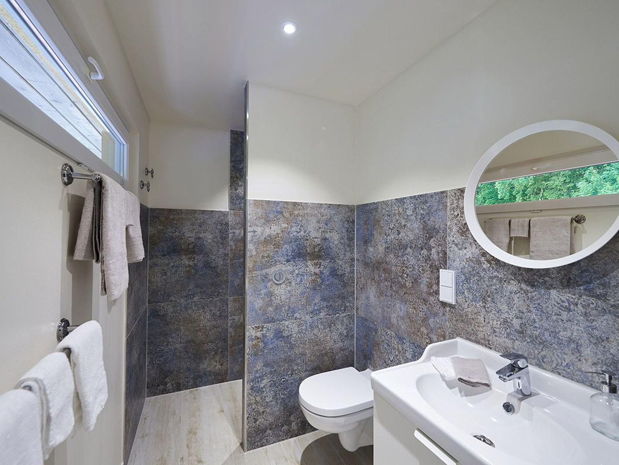 Das modern gestaltete Badezimmer verfügt über eine großzügige, begehbare Dusche – perfekt für entspannte Momente nach einem erlebnisreichen Tag.