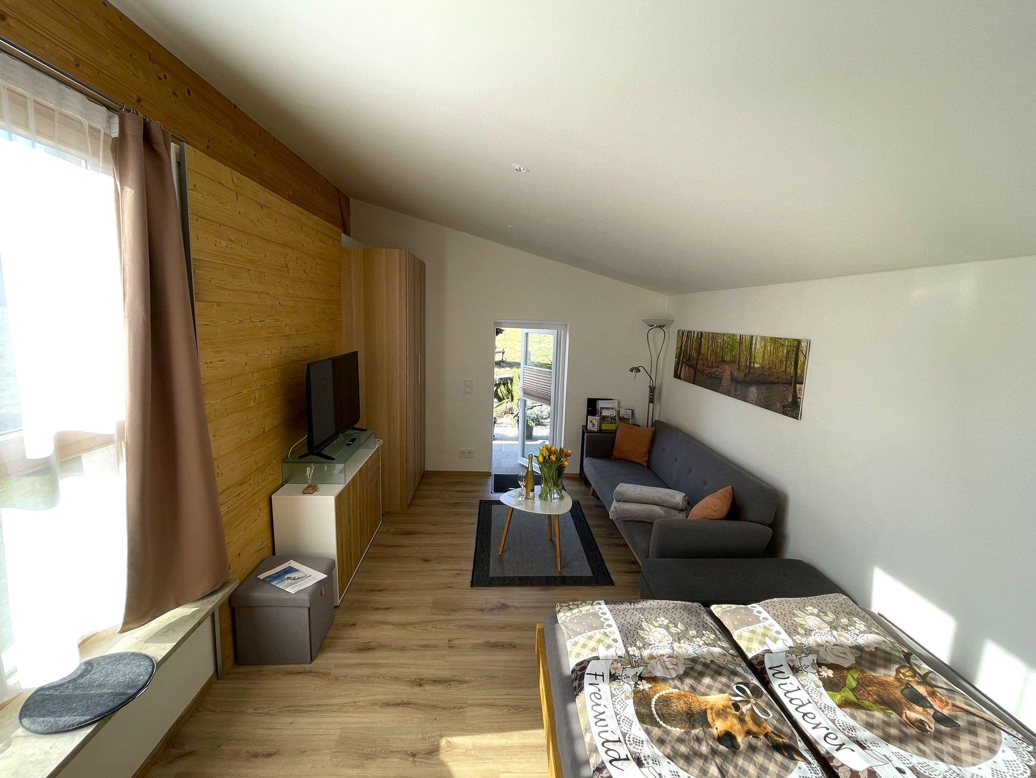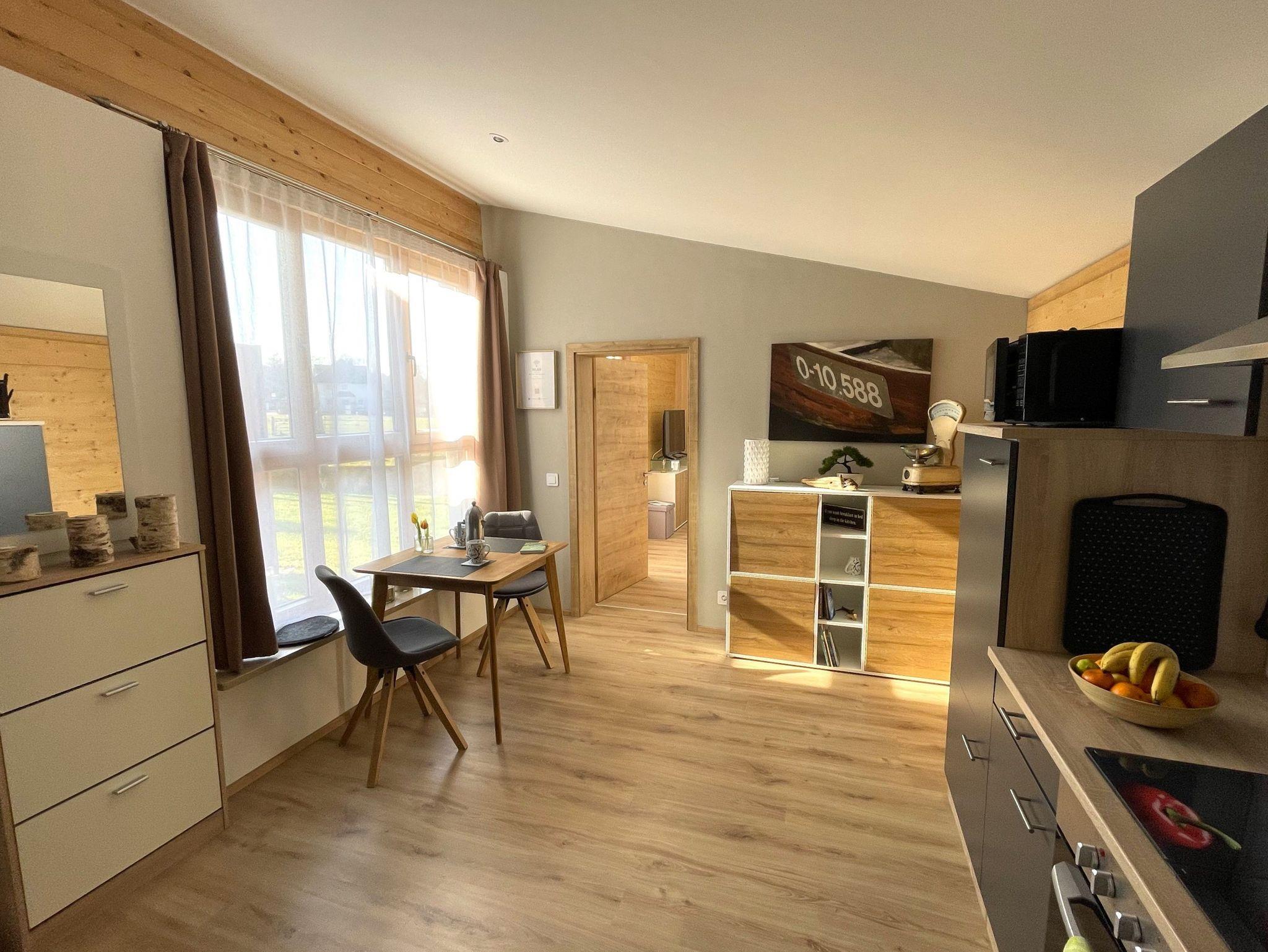 Das Ferien-Appartment befindet sich in einem Anbau im Erdgeschoss und hat einen separaten Eingang, sodass Sie jederzeit kontaktlos Ihre Unterkunft betreten können. Über einen kleinen Flur mit eigener Garderobe kommen Sie in Ihr Appartment. Es besteht aus einer gemütlichen Wohnküche mit vollausgestatteter Küche mit Blick auf die Berge. Ein Wohnschlafzimmer grenzt gleich im Anschluss mit einem Doppelbett und einer Schlafcouch an. Auch ein mitgebrachtes Kinderbett hat hier noch Platz. Vom Wohnschlafzimmer aus gelangen Sie auf eine kleine, voll überdachte Terrasse mit unverbauten und uneinsehbaren Blick auf den Fuderheuberg. Genießen Sie die Nachmittagssonne oder den Sonnenuntergang über dem Staufenmassiv bei einem kühlen Getränk, für Grill-Liebhaber stellen wir auch gerne einen Gas-Grill zur Verfügung. Das Tageslicht-Bad ist komplett neu mit Dusche/WC und Waschmaschine ausgestattet. Alle Räume haben eine Fußbodenheizung.