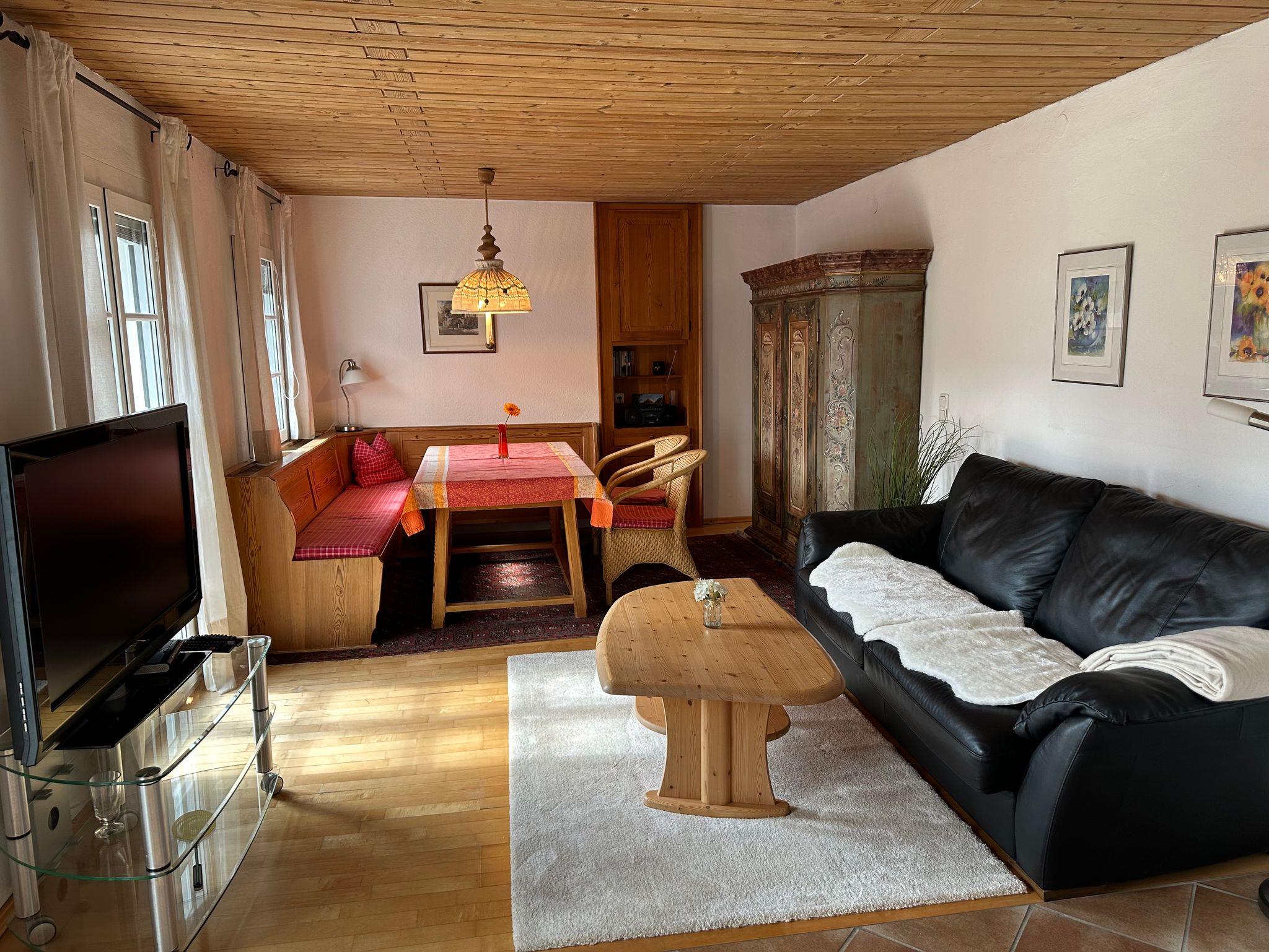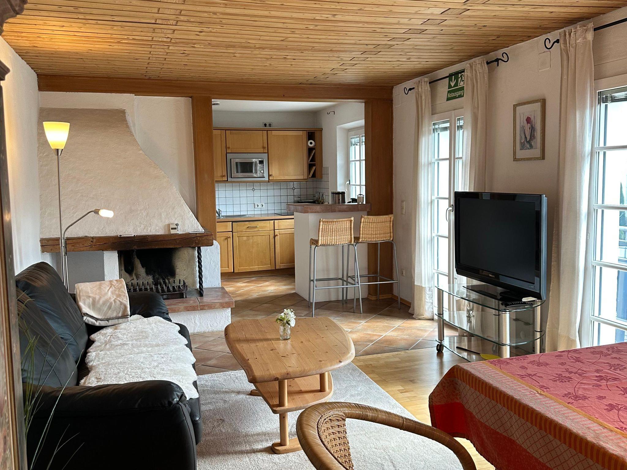 Unsere wohl geräumigste Wohnung (ca. 56 qm² im 2. Stock) besteht aus einem großen Wohn-/ Esszimmer, das durch eine Theke von der mit einer Spülmaschine ausgestatteten Küche abgetrennt ist, einer gemütlichen Eckbank mit Stühlen, einer komplett ausziehbaren Schlafcouch, einem Bauernschrank, zwei Bädern (jeweils mit Dusche, Toilette und einmal Bidet) sowie einem Schlafzimmer. Der etwa 15 qm² große Südbalkon mit elektrischer Markise, Tisch und Stühlen runden die Wohnung ab. Die Wohnung bietet Platz für 2 Personen.