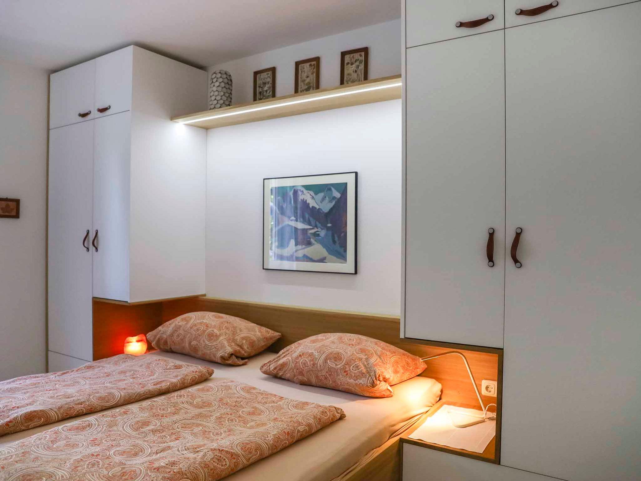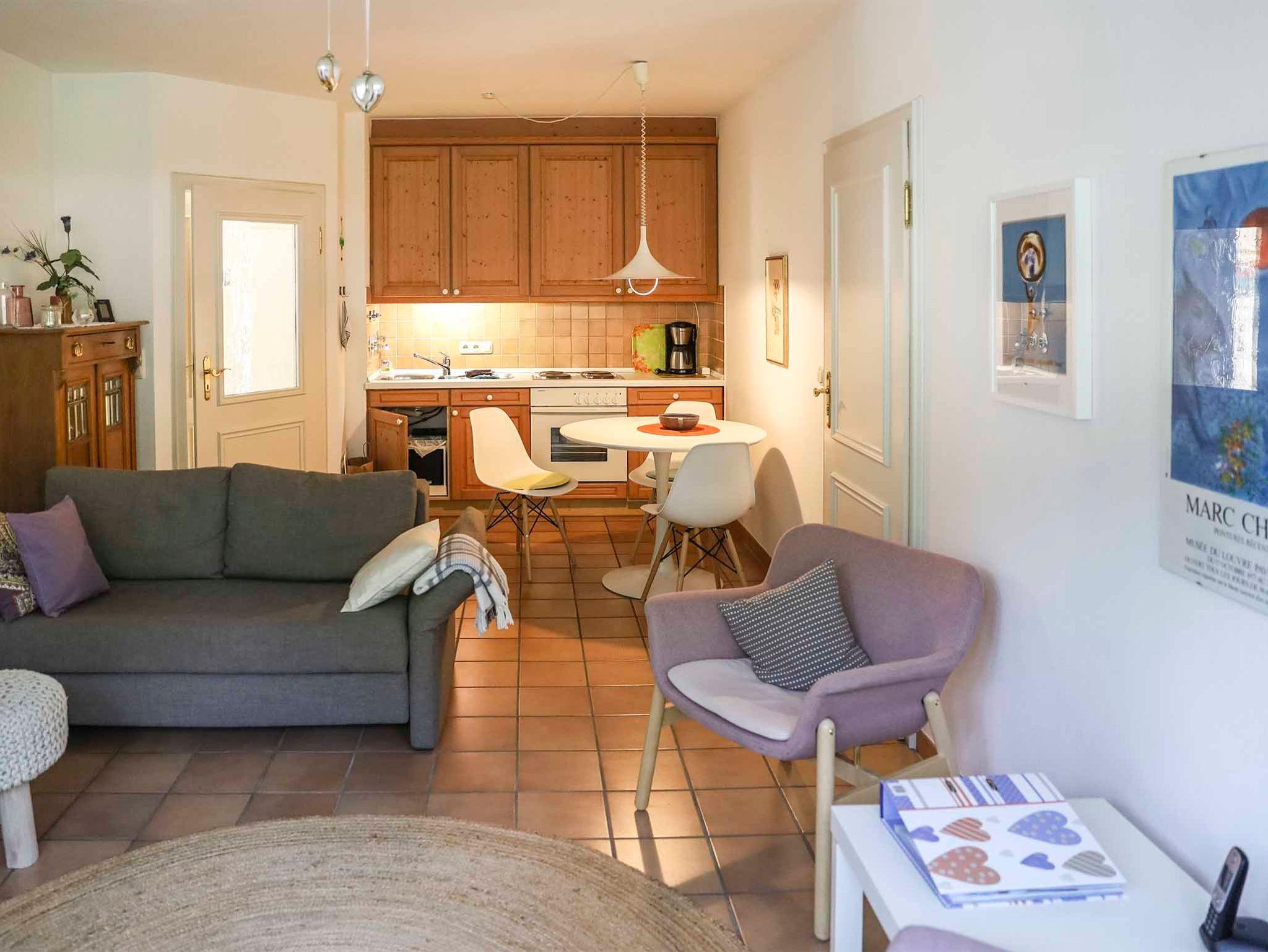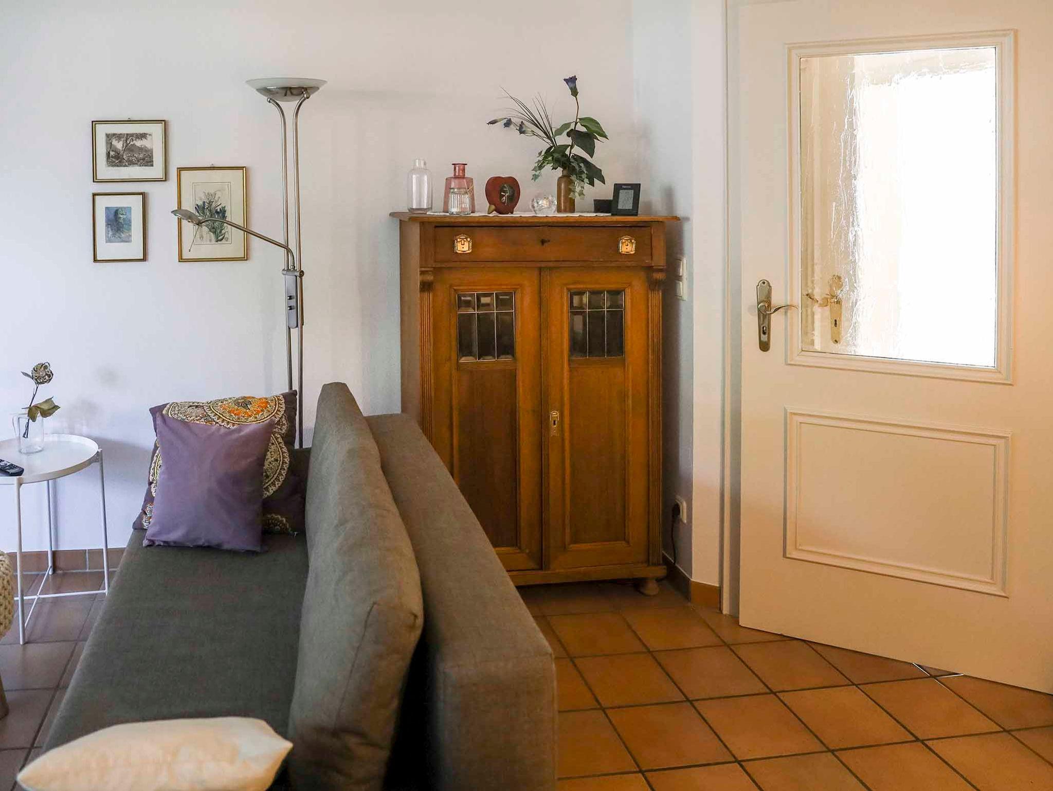 Unsere 2-Zimmer Ferienwohnung im Erdgeschoss besteht aus einem Wohn- Esszimmer mit Küchenzeile, einem separaten Schlafzimmer und Bad mit Dusche/WC. Die Wohnfläche beträgt ca. 45m². Das Schlafzimmer ist mit einem Doppelbett (1,80m breit) und 2 getrennten Schränken ausgestattet. Im Wohn- Essbereich befindet sich ein Schlafsofa. Entspannen Sie sich bei einem herrlichen Blick auf die Berge im Erker des Wohnbereichs oder auf der Terrasse im Außenbereich!