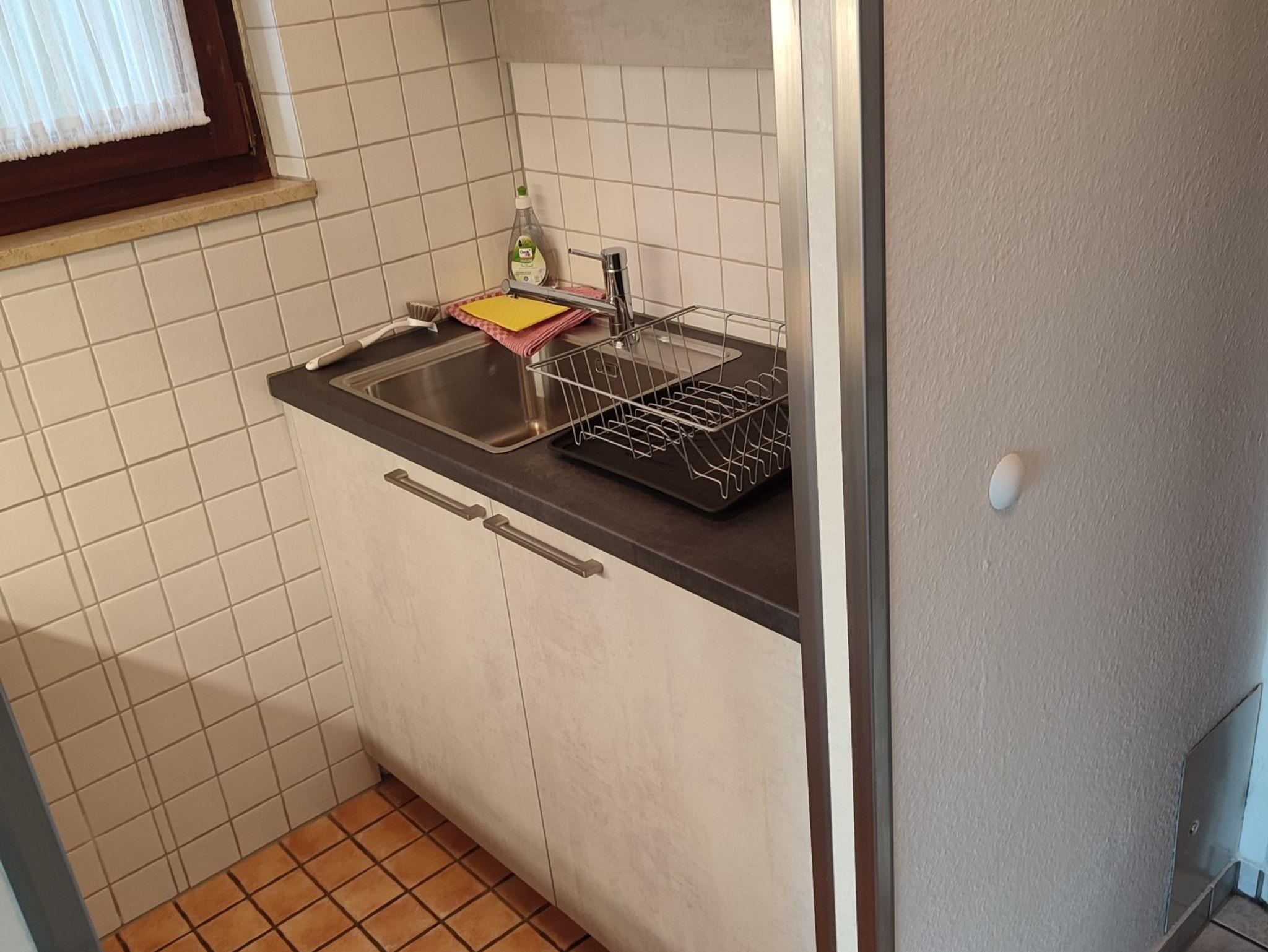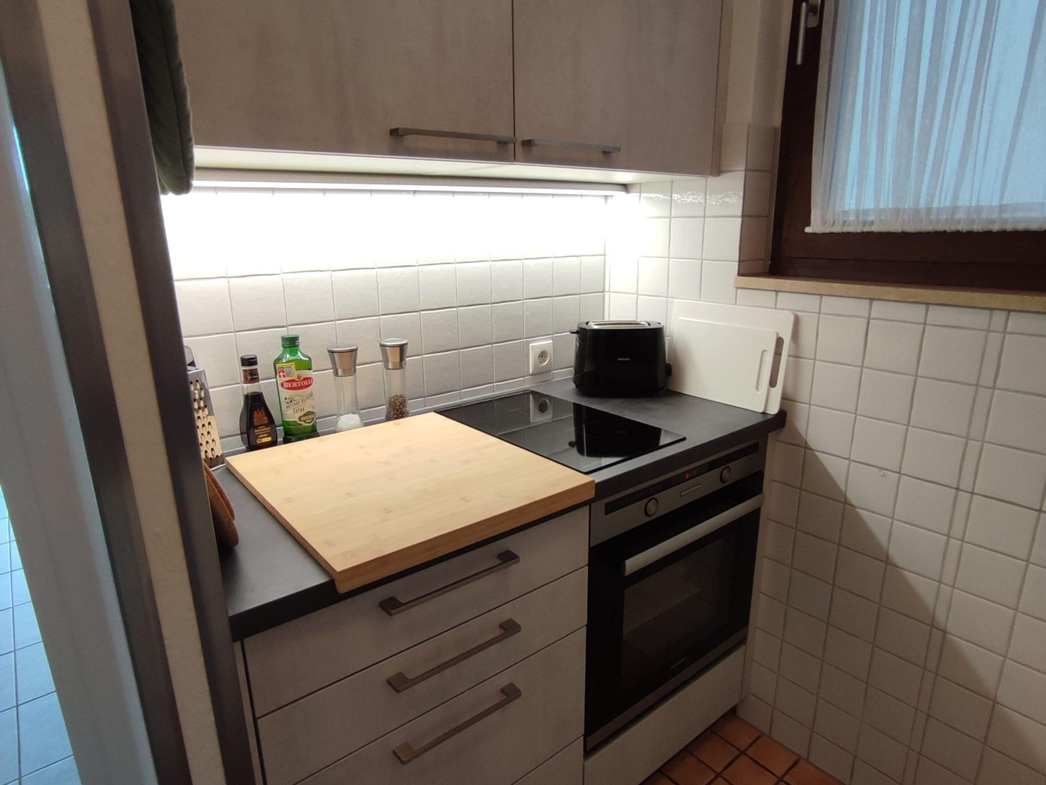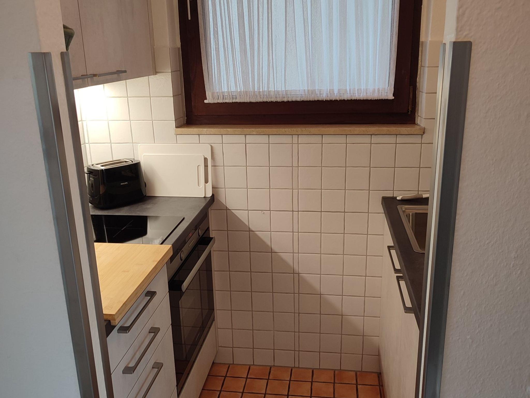 Die Wohnung befindet sich in einem Mehrfamilienhaus im 7. Obergeschoß und ist über 2 Aufzüge bequem zu erreichen. Die Nichtraucher-Ferienwohnung wurde im Jahr 2017 renoviert. Das Bett, der Schrank und der Couchtisch sind für uns von einer ortsansässigen Schreinerei angefertigt worden. Sie betreten die Wohnung und finden rechts eine Küche, die mit allen erforderlichen Geräten ausgestattet ist. Neben Kühlschrank mit Gefrierfach, Elektroherd mit Ceran-Kochfeld und Backofen, finden Sie Geschirr, eine Kaffeemaschine, einen Toaster und einen Wasserkocher. Gerne stellen wir unseren Gästen Kaffee und Tee, Filtertüten, Essig und Öl, Zucker, Salz und Pfeffer kostenfrei zur Verfügung. Die Küche hat ein Fenster, das für ein angenehmes Licht sorgt.