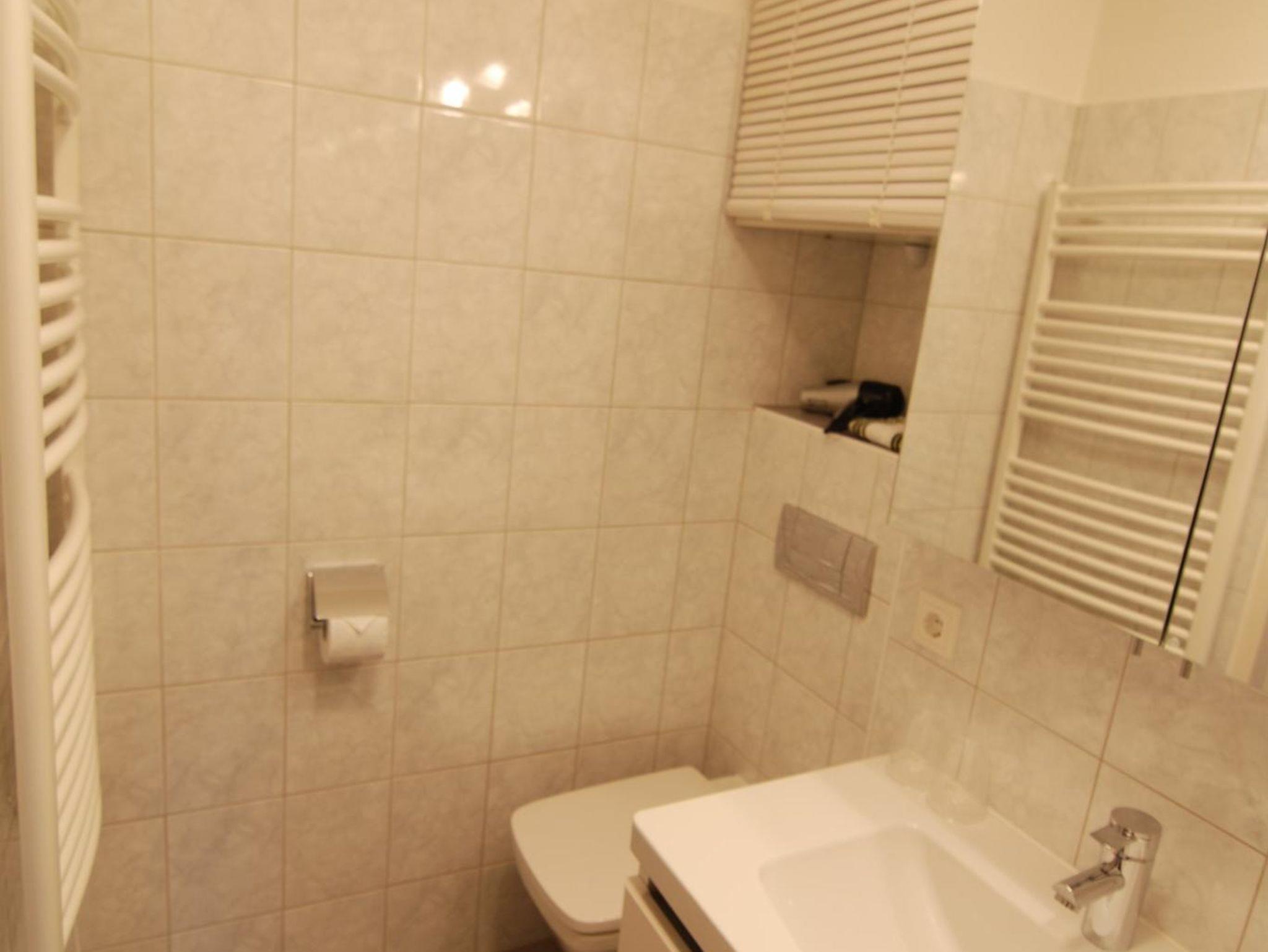 Links finden Sie ein renoviertes Bad, eine Dusche mit Handbrause, ein großes Waschbecken sowie die Toilette. Das Badezimmer ist mit einer Elektroheizung ausgestattet. Kostenfreie Handtücher, Seife und ein Haarfön liegen für Sie bereit.