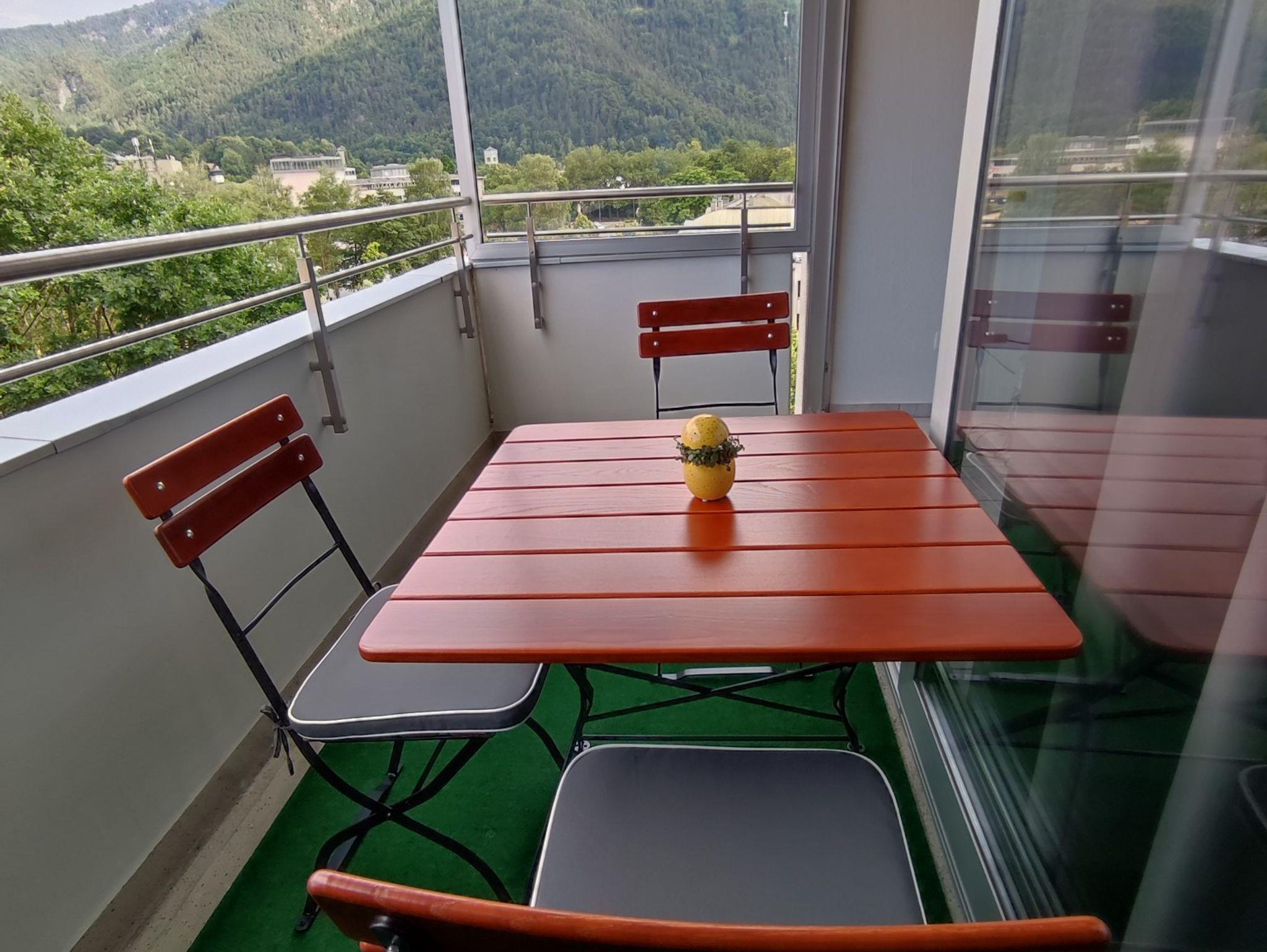 auf die Stadt Bad Reichenhall genießen. Erholen Sie sich auch auf dem Balkon mit Morgensonne. Eine gemütliche Sitzgarnitur steht bereit. Hier können Sie auch auf den Predigtstuhl schauen. Auf der gemütlichen Ledercouch können Sie es sich am Abend vorm Fernseher gemütlich machen. Die Schlafcouch kann elektrisch zu einer größeren Liegefläche verändert werden. Für Sie ist ein Flachbild-Fernseher, ein Radio sowie kostenfreies W-LAN vorhanden. Kostenlose Zeitschriften und Gästeinformationen liegen aus. In einem großen Schrank haben Sie genügend Platz für Ihr Gepäck und Ihre Kleider. Im Haus befindet sich ein großer Wasch-/Trockenraum mit ausreichend Waschmaschinen und Trocknern. Ihr Auto können Sie kostenfrei auf Parkplätzen am Haus oder in der Straße parken. Für Ihre Fahrräder gibt es einen separaten Raum, der kostenfrei genutzt werden kann. In unmittelbarer Nähe finden Sie Lebensmittelgeschäfte, einen Metzger und einen Bäcker. Das Mitbringen von Haustieren ist nicht gestattet.