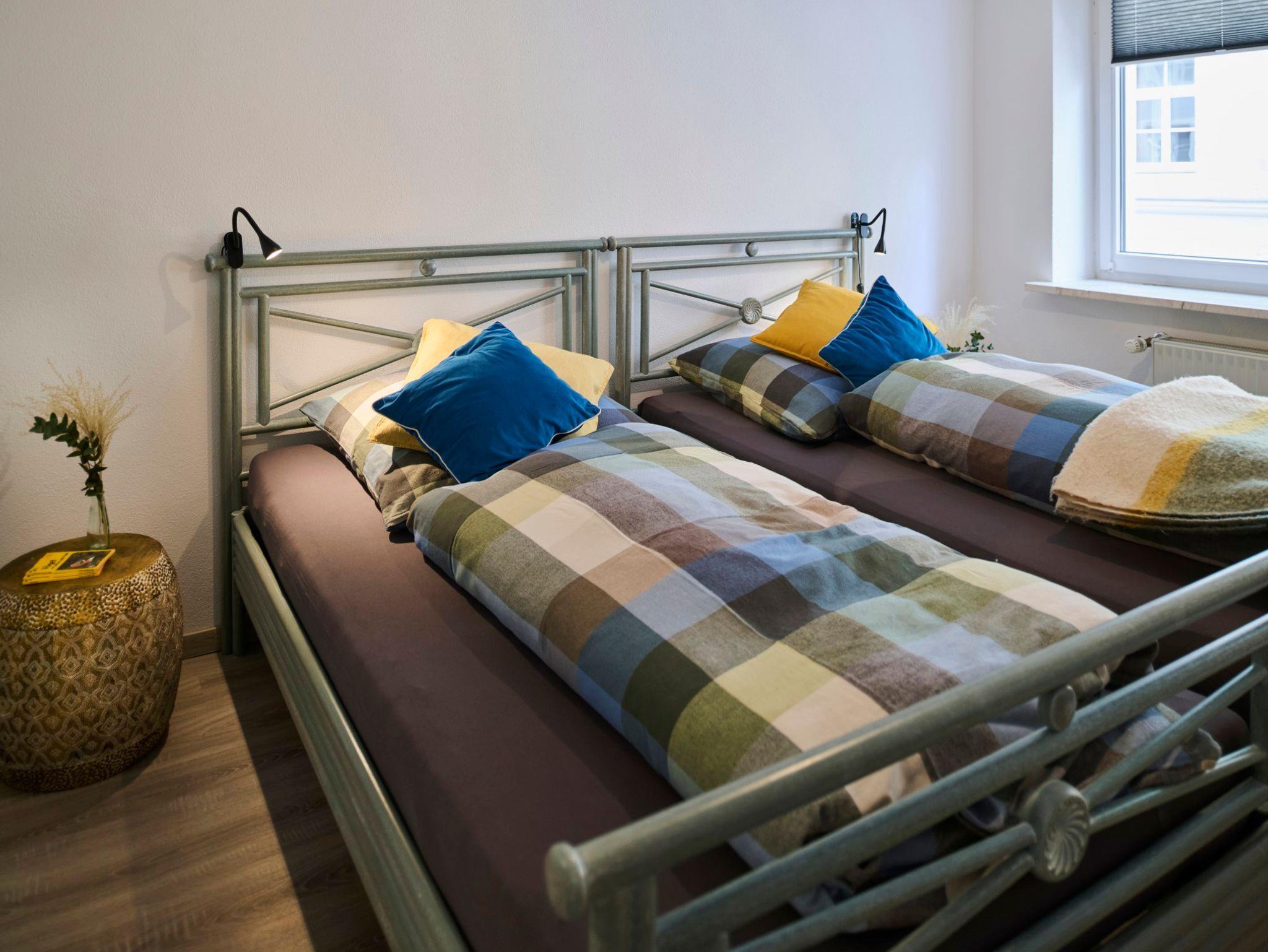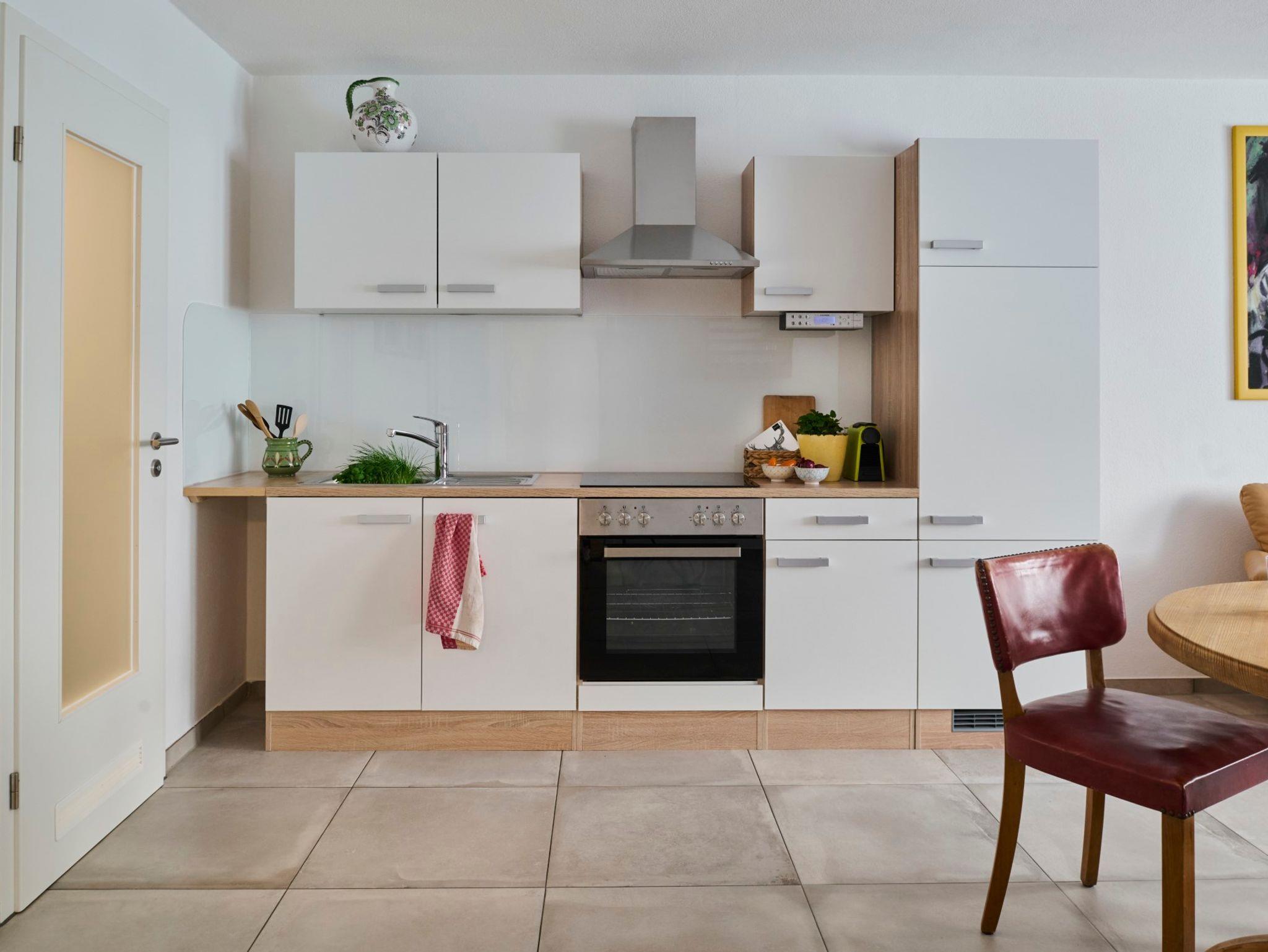 Die lichtdurchflutete Wohnküche ist der perfekte Ort zum Entspannen und Genießen. Sie ist komplett ausgestattet mit einer modernen Küchenzeile, einer Kaffeekapselmaschine, Wasserkocher, Toaster sowie Gewürzen, Essig, Öl und zahlreichen weiteren Küchenutensilien. Der Essbereich mit einem Tisch und vier Stühlen lädt zu gemeinsamen Mahlzeiten ein, während die komfortable Zweisitzer-Ledercouch zum Verweilen und Relaxen einlädt. Das Schlafzimmer sorgt mit zwei getrennten Betten (100 x 200 cm), einer Kommode und einem Garderobenständer für einen erholsamen Schlaf. Für die dritte oder vierte Person steht ein geräumiges Wohnzimmer mit einer gemütlichen Eck-Schlafcouch (120 x 180 cm), einem Kleiderschrank, Sideboards und einem Flachbild-TV zur Verfügung. Ein einladender Eingangsbereich mit Flur und Garderobe sorgt für ausreichend Platz für Ihre persönlichen Dinge. Unser kleiner Freisitz zum Hof, steht Ihnen zur Verfügung. Unsere Ferienwohnung ist eine Nichtraucherwohnung und mit Rauchmeldern ausgestattet. WLAN ist in der gesamten Wohnung kostenfrei verfügbar. Haustiere sind bei uns herzlich willkommen! Die Ferienwohnung hat keinen Stellplatz, auf Nachfrage können wir Ihnen aber gerne in der Nähe einen Stellplatz organisieren. Wir freuen uns darauf, Sie bei uns begrüßen zu dürfen!