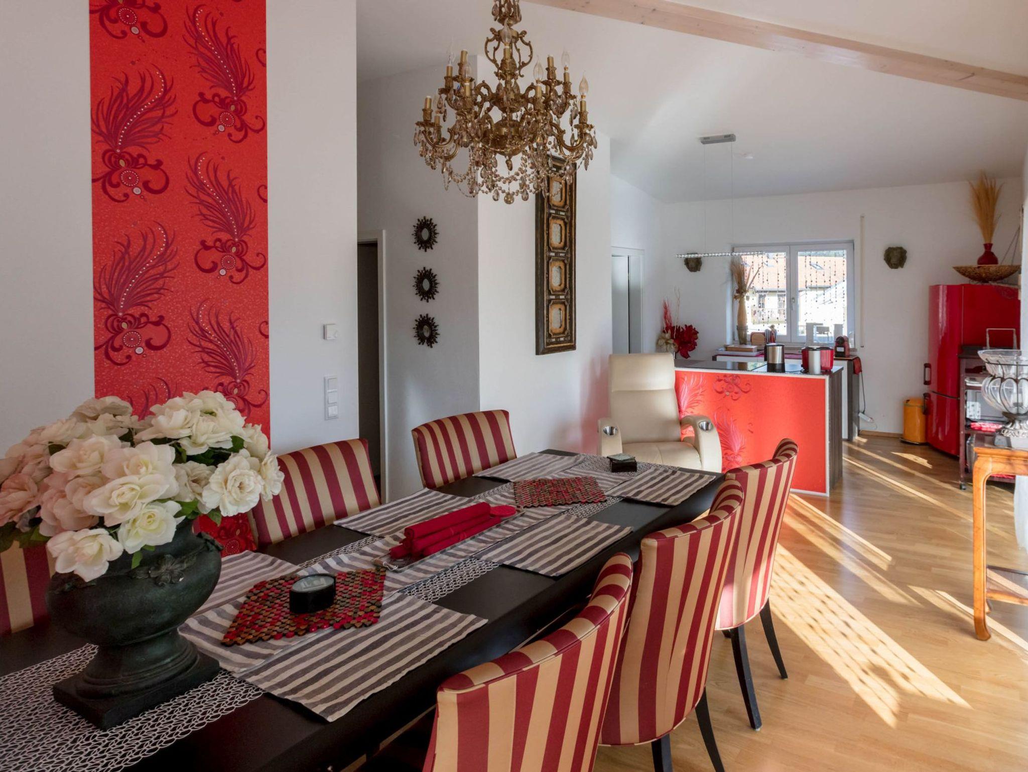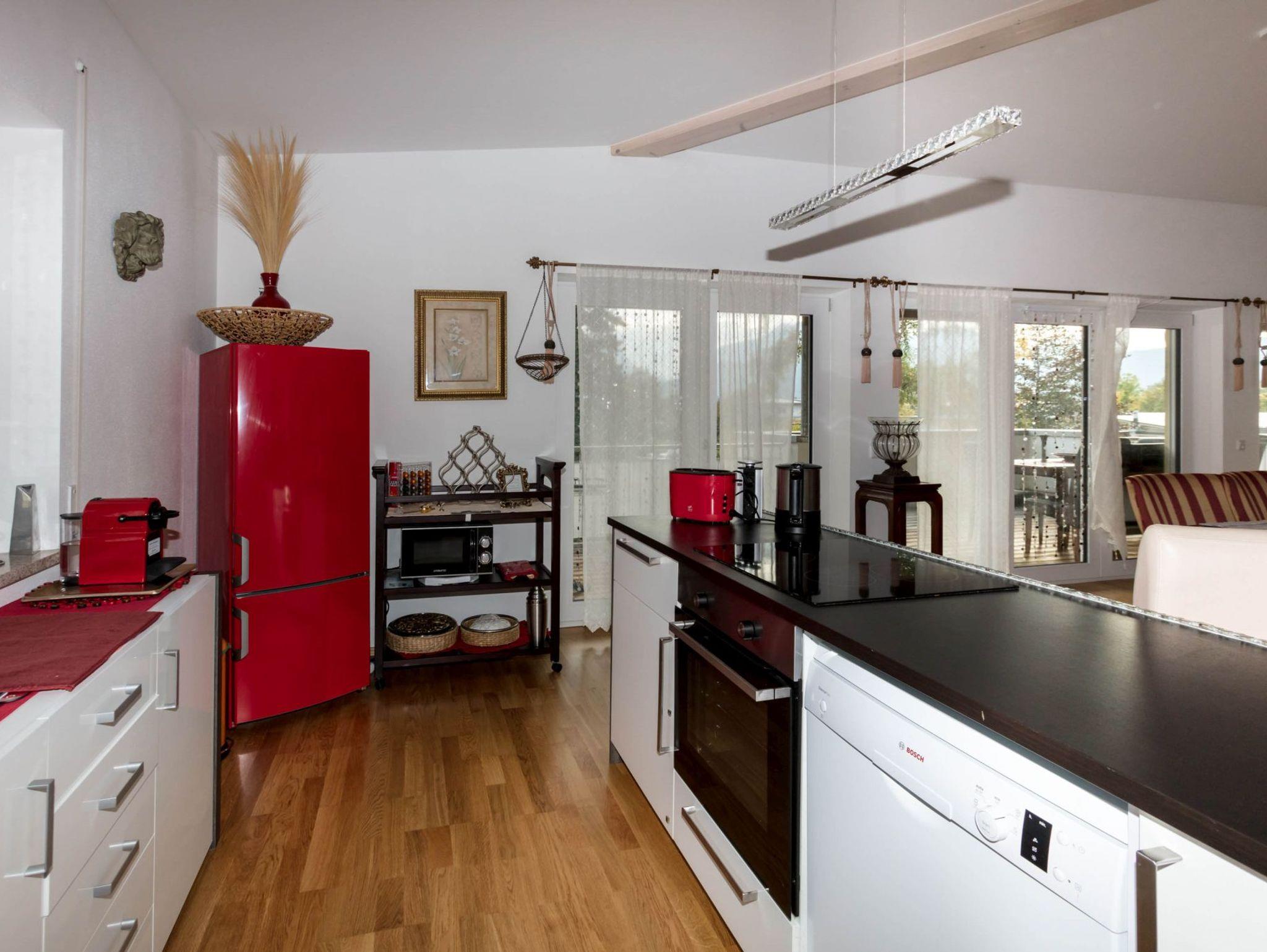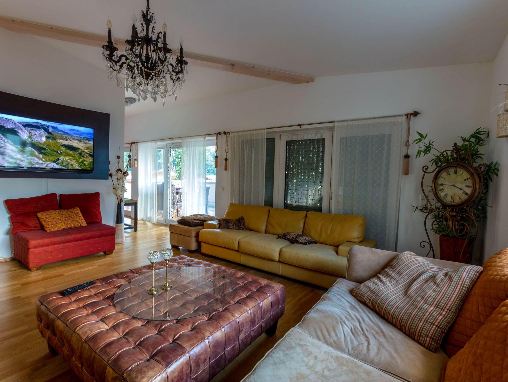 Die exklusiv eingerichtete Ferienwohnung bietet Ihnen auf 150qm viel Platz und Ruhe, in der bis zu 6 Personen den Alltag hinter sich lassen können. Genießen Sie auf dem riesigen Balkon den Ausblick auf die Berge in der Nachmittags- oder Abendsonne. Im großen Wohnzimmer können Sie sich auf einem der drei Sofas bei einem guten Film entspannen (großer Fernseher mit Kabel-TV und Netflix) oder über das Internet (WLAN) Ihre nächsten Ausflüge planen. Wenn Sie gerne kochen, so ist dies in der komplett ausgestatteten Küche ein leichtes. Vom Herd bis zur Kaffeemaschine ist alles vorhanden, um im Essbereich oder auf dem Balkon ein zauberhaftes Essen zu servieren. Die Betten sind zur Anreise bezogen und Handtücher liegen für Sie parat. Die Neubauwohnung liegt im 2. Stock, zu der Sie mit dem Aufzug oder über die Treppe gelangen. Der Zugang ist ebenerdig, ohne Stufen, so dass auch gehbeeinträchtige Personen mühelos in die Wohnung gelangen können (z. B. mit Rollstuhl oder Rollator). Brave Hunde und Kinder sind willkommen. Für Baby oder Kleinkind stellen wir Ihnen ein Kinderbett zur Verfügung.