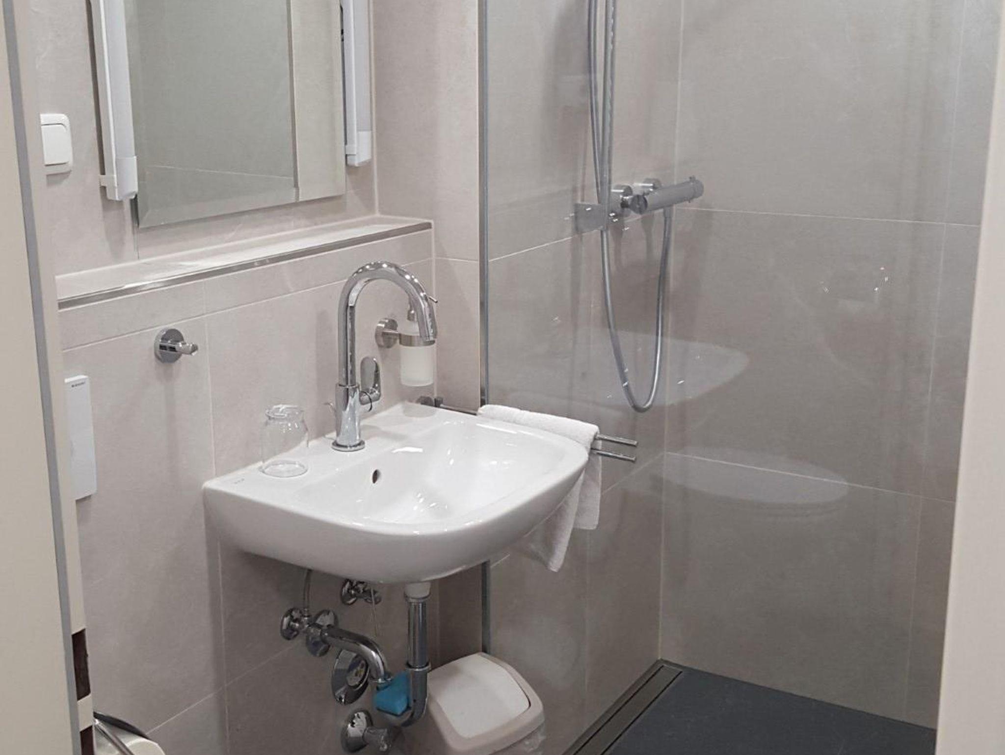 ausgestattet. Steckdosen sind in großer Zahl und gut erreichbar in Bettnähe und beim Schreibtisch vorhanden. Die Wohnung hat einen kleinen überdachten Balkon. Die Einbauküche fügt sich perfekt in das Ensemble der restlichen Einbaumöbel ein. Sie ist mit einem 2-fach Induktionskochfeld, Backofen, großen Kühlschrank mit Gefrierfach, Wasserkocher, Kaffeemaschine sowie einer Grundausstattung an Töpfen, Geschirr, Besteck etc. ausgestattet. Das Bad ist komplett neu und verfügt über eine bodenebene Walk-in-Dusche mit Glaswand, WC, Waschbecken mit beleuchtetem Spiegel und großem Handtuchheizkörper. Ein Haartrockner ist vorhanden. Das Apartment 209 kann auf Anfrage mit dem benachbarten Einzelzimmer (210) zu einer ca. 52 m² großen Wohnung mit 2 Bädern verbunden werden.