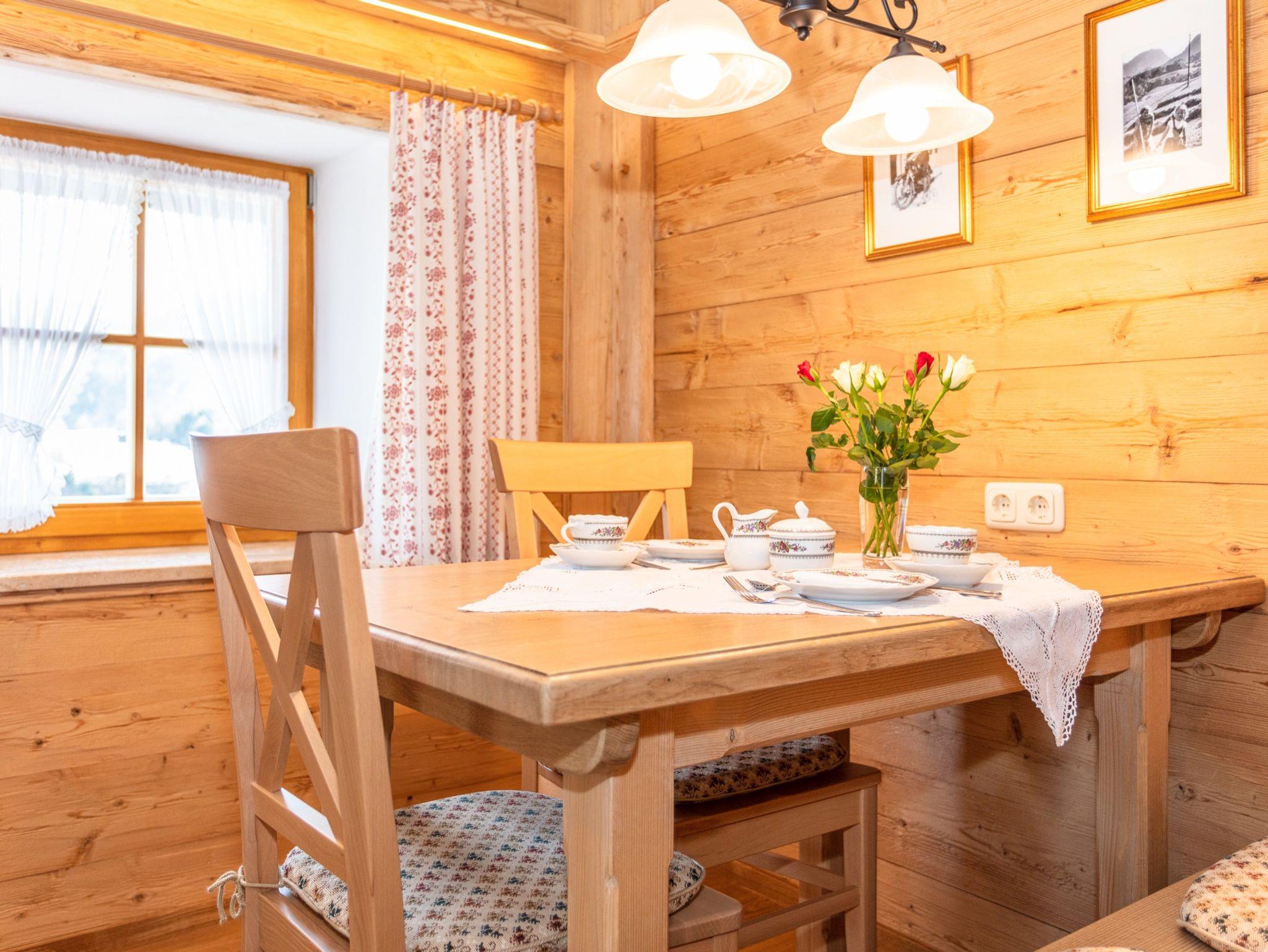 Diese Wohnung wurde komplett neu erstellt und ist sehr exklusiv ausgestattet. Die Ferienwohnung Hochthron befindet sich im 2. Stock (ohne Aufzug) des Haupthauses und verfügt über einen eigenen großen Balkon mit Sitzmöbeln und einen Tisch. Die Wohnung ist sehr ruhig, da sie in der obersten Etage liegt und sich dort keine weiteren Gäste befinden. Die Ferienunterkunft, mit einer Wohnfläche von 50 m², ist wie folgt aufgeteilt: Ein Schlafzimmer, ein Badezimmer, Wohn-Esszimmer mit Küche und Essecke, einen Eingangsbereich mit Garderobe. Hochwertigste Ausstattung: Vom Schreiner aus der Umgebung gefertigte massive Altholztüren und massive handbemalte Schlafzimmermöbel. Echtholzboden aus Eichendielen. Teilweise Wandvertäfelung aus Altholz. Komplett neues Badezimmer mit Regenschauerdusche. Komplett eingerichtete Küchenzeile mit Kühlschrank inklusive Gefrierfach, Geschirrspüler, Backofen, Ceranfeld, Mikrowelle, Kaffeemaschine, Wasserkocher, Toaster, Geschirr in ansprechenden Design, Töpfe, Pfannen und Kleinutensilien, Essecke, ausziehbares Ecksofa, Fernseher im Wohnbereich ( 50 Zoll) und im Schlafzimmer, Kostenloses W-LAN.