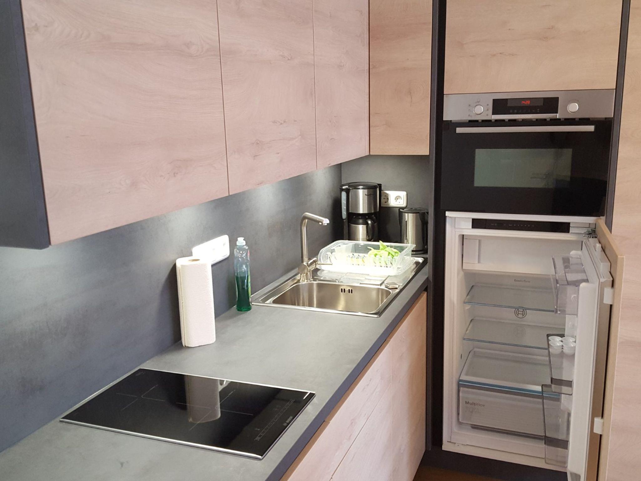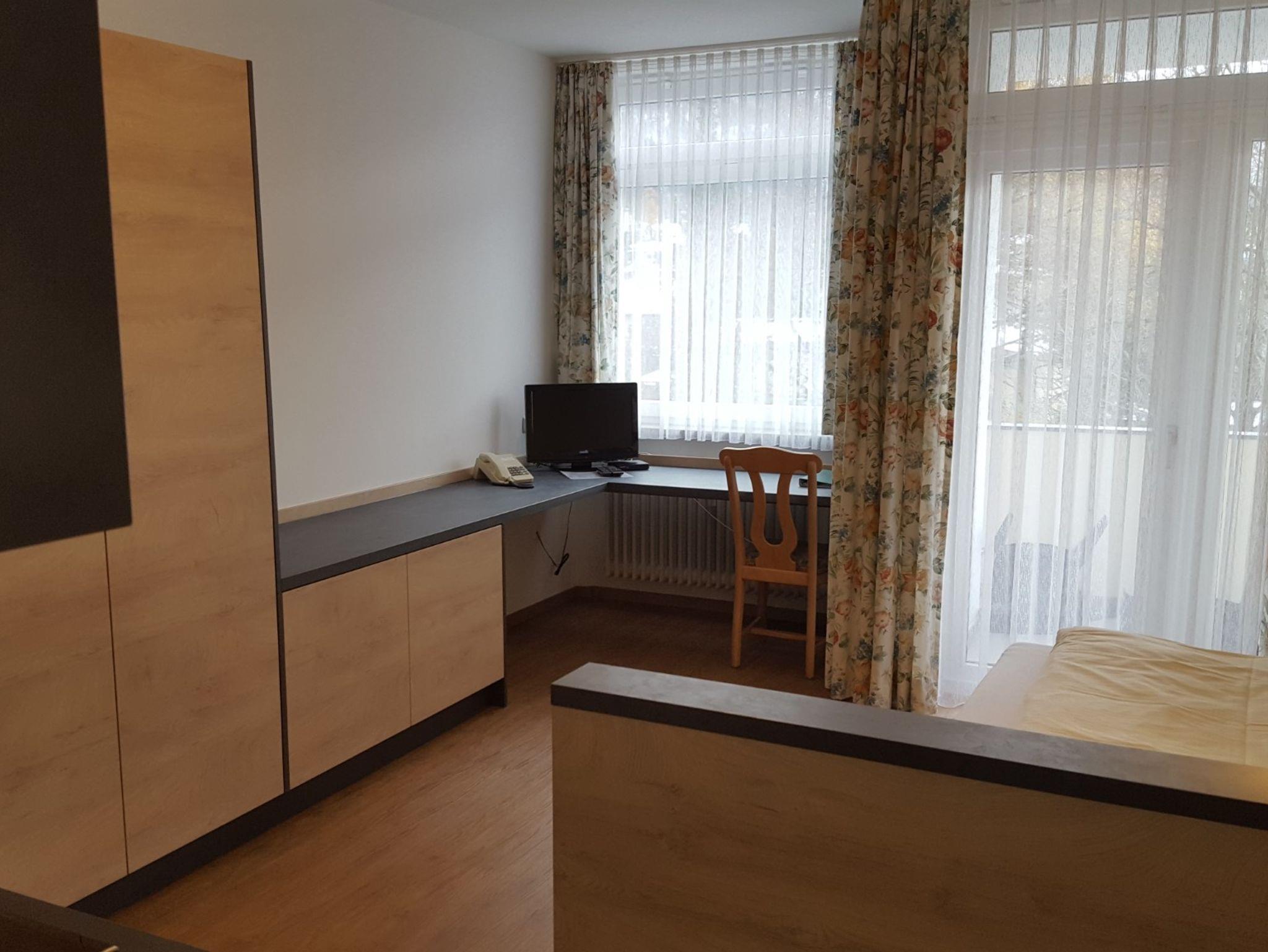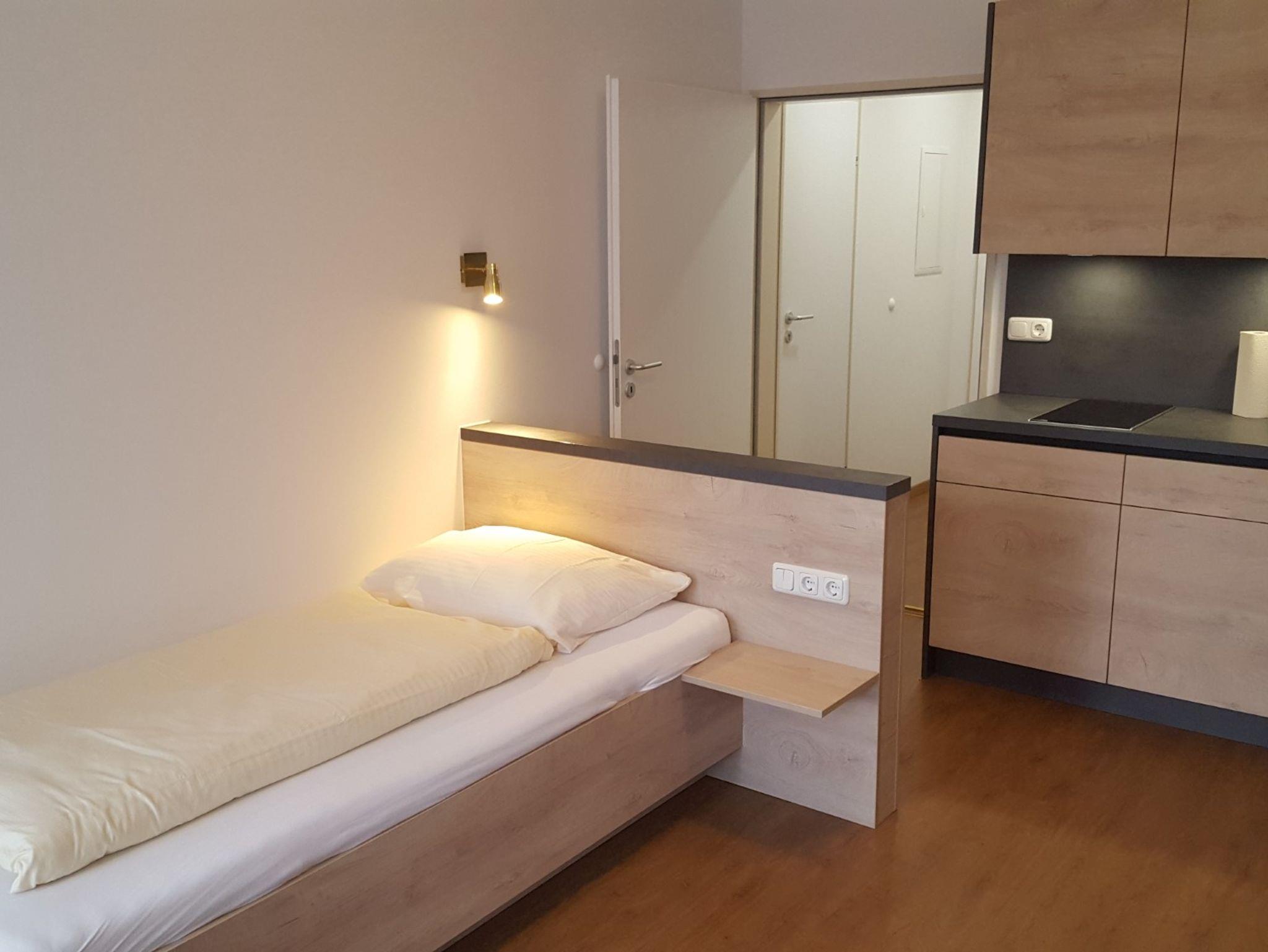 Das etwa 26 m² große 1-Zimmer-Apartment Junior 309 befindet sich im 3. Stock nach Südwesten zur Mozartstraße (mit Nachtfahrverbot) gelegen mit wunderschönem Blick auf den Predigtstuhl, das Lattengebirge sowie Staufen und Zwiesel. Die Wohnung wurde im Jahr 2024 komplett renoviert. Sie ist mit einem neuen PVC-Boden in Eichenoptik, Einzelbett (100 x 200 cm), einem großen Eckschreibtisch mit Flachbild-TV, einem großen Einbauschrank und Kommode, Stuhl sowie einem großen Spiegel ausgestattet. Steckdosen sind in großer Zahl und gut erreichbar in Bettnähe und beim Schreibtisch vorhanden. Die Wohnung hat einen kleinen überdachten Balkon. Die Einbauküche fügt sich perfekt in das Ensemble der restlichen Einbaumöbel ein. Sie ist mit einem 2-fach Induktionskochfeld, Backofen, großen Kühlschrank mit Gefrierfach, Wasserkocher, Kaffeemaschine sowie einer Grundausstattung an Töpfen, Geschirr, Besteck etc. ausgestattet. Das Bad ist komplett neu und verfügt über eine bodenebene Walk-in-Dusche mit Glaswand, WC, Waschbecken mit beleuchtetem Spiegel und großem Handtuchheizkörper. Ein Haartrockner ist vorhanden. Das Apartment 309 kann auf Anfrage mit dem benachbarten Einzelzimmer (310) zu einer ca. 52 m² großen Wohnung mit 2 Bädern verbunden werden.