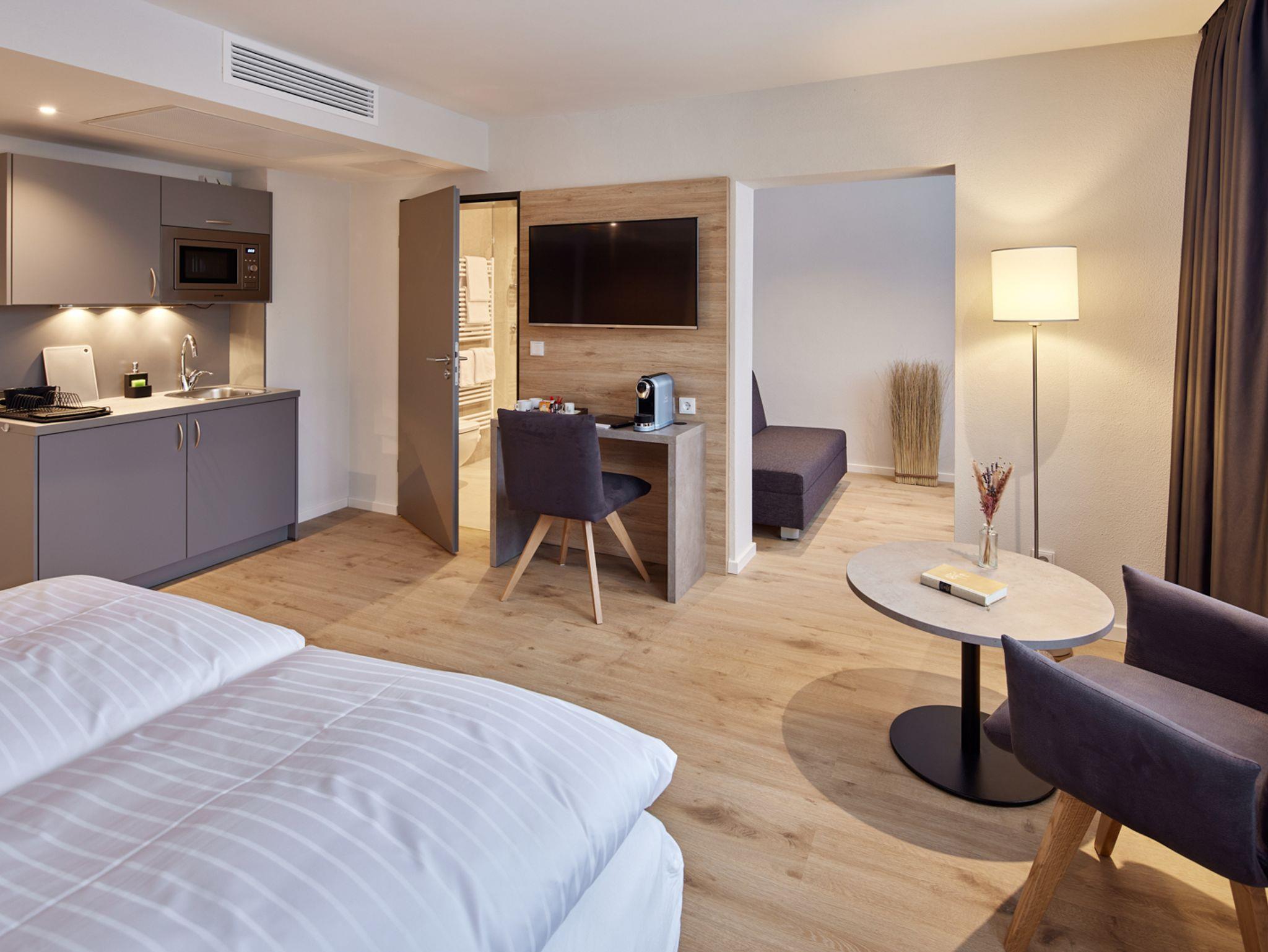 Kategorie Large, Größe: ca. 30 m², Wohn- und Schlafbereich mit Doppelbett und zusätzlichem separatem Schlafbereich mit Schlafsofa für 2 Personen, Kochnische, Badezimmer mit Dusche, Panorama mit Alpen- und Gartenblick. Unsere Apartments sind alle mit Heiz-und Kühlanlage, WIFI, Smart TV, 17 Zoll Zimmersafe, leistungsstarker Haartrockner und Segafredo Kaffeemaschine ausgestattet. Toaster, Wasserkocher, Wäscheständer, Bügelbrett und Bügeleisen werden nur auf Nachfrage ausgehändigt. Waschmaschine und Trockner stehen Ihnen in der 1 und 2 Etage gegen Gebühr zur Verfügung.