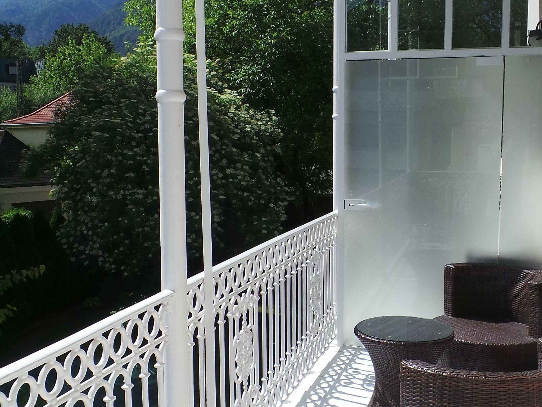 Die Ferienwohnung - TOP 1 (40 qm) mit sonnigem Ostbalkon, ist als Nichtraucherwohnung hell, freundlich und modern gestaltet, verfügt über ein Schlaf/Esszimmer mit Einzelbett, ein Schlafzimmer mit Doppelbett und Miniküche (Küchenzeile). Die elegante Wohnung im 1. OG ist über eine schöne Holztreppe mit Fenster/Zwischenpodest in der Villa Bariole gut erreichbar. Sie ist ideal für 1-3 Personen. Beide Zimmer bieten Balkonzugang, je eine Dusche/WC, großen Flachbild-Wand TV mit Sat-Empfang, Internet/WLAN Anschluss, Radio, Wandgarderobe, sowie ein vielfältiges Beleuchtungskonzept zum Wohlfühlen. Der Balkon mit Lounge-Sitzgruppe lädt zum Verweilen ein und gewährt einen wundervollen Ausblick in den Garten mit altem Baumbestand und in die Berge der Region. Die Miniküche ist gut ausgestattet, verfügt über Spüle, Kühlschrank mit Gefrierfach, Magnetresonanzkochplatten (2 Kochfelder) mit zugehörigem Kochgeschirr und Dunstabzug, Mikrowelle, Kaffeefilterautomat, Toaster, Wasserkocher, Besteck, Gläser und allen anderen relevanten Dingen.