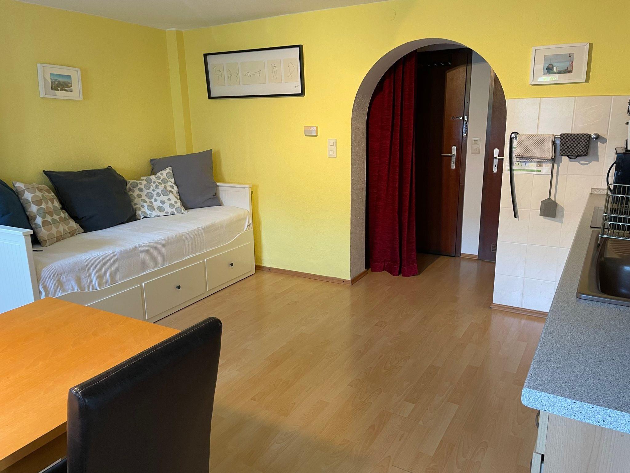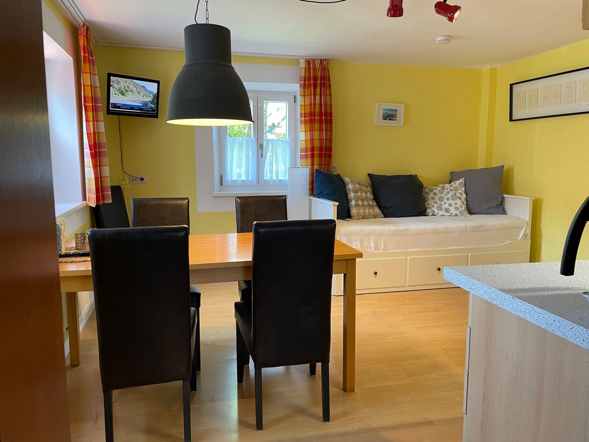 Die großzügige Wohnküche ist wohnlich eingerichtet und lädt mit dem Tagesbett zum verweilen ein. Dieses Tagesbett kann zu einem Doppelbett 160x 200cm ausgezogen werden. In der Wohnküche ist auch der Fernseher montiert.