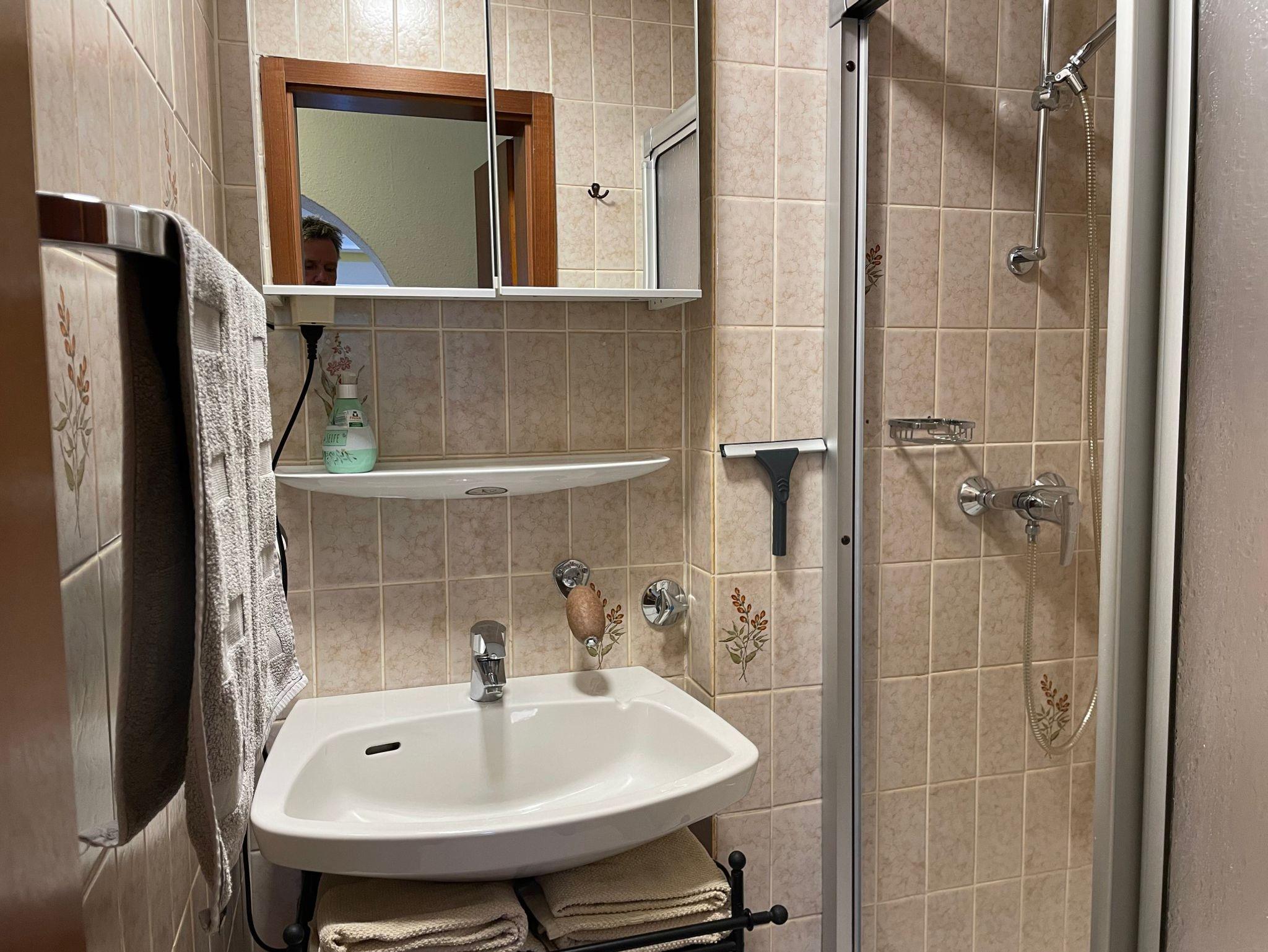 Toilette und Bad sind räumlich voneinander getrennt. Das Bad verfügt über eine Dusche. Die Handtücher werden gestellt, je ein großes, ein kleines Handtuch p.P./Woche.