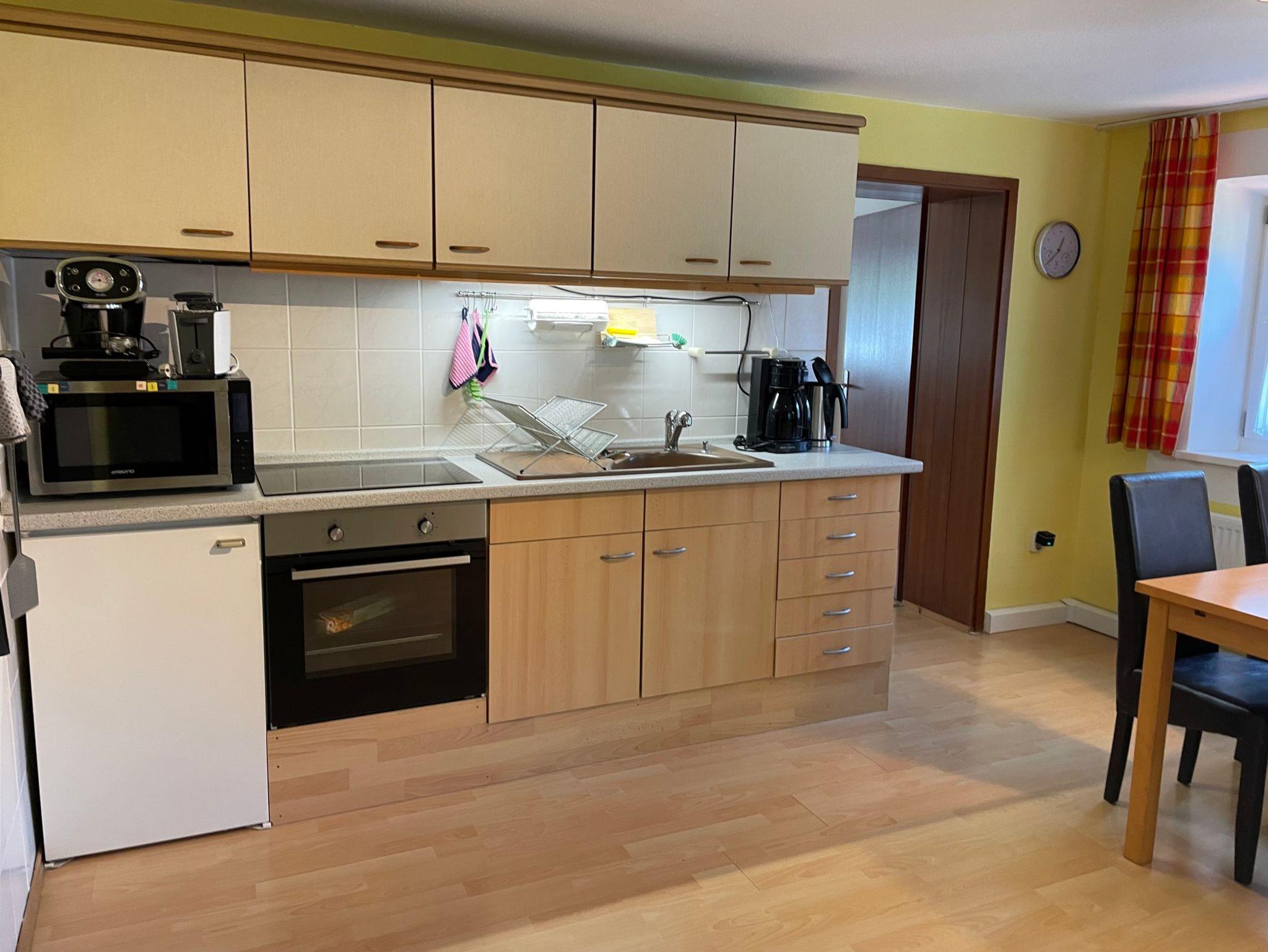 Die Einbauküche verfügt über einen Backofen, eine Kaffeemaschine, einen Herd und einen Kühlschrank. Die Küche ist mit einer Basisausstattung an Tellern Töpfen und Besteck, sowie Gläsern und Tassen ausgestattet. Es gibt eine reguläre Spüle, jedoch keinen Geschirrspüler. Spültuch, Spülmittel, Geschirrhandtuch und Spülschwamm werden gestellt.