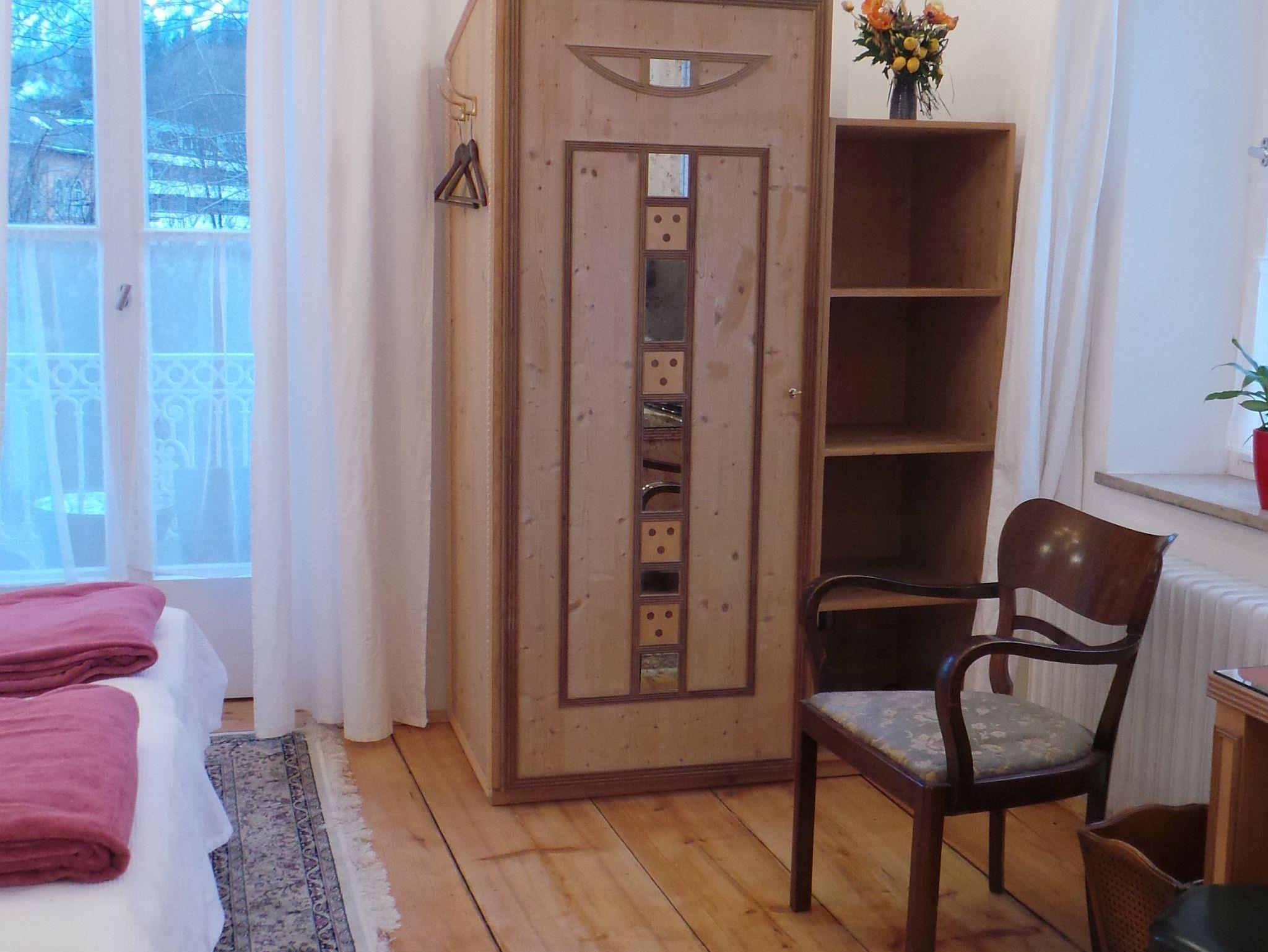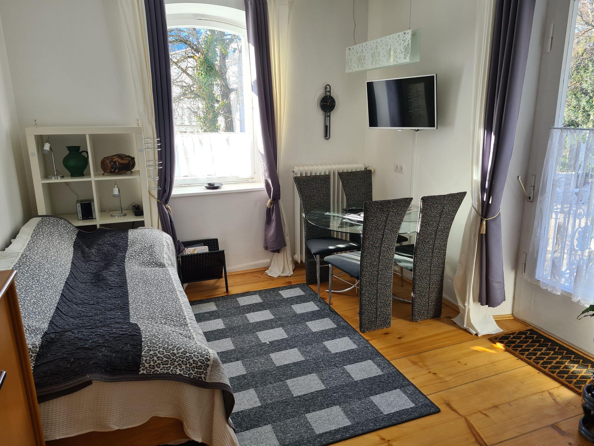 Die Ferienwohnung - TOP 2 (55 qm) mit sonnigem Ost- und Südbalkon, ist als Nichtraucherwohnung hell, freundlich und modern gestaltet, verfügt über ein Wohn/Esszimmer mit Küchenzeile und gesondertem Schlafzimmer mit Badezimmer (Du/WC). Die elegante Wohnung im 1. OG ist über eine schöne Holztreppe mit Fenster/Zwischenpodest in der Villa Bariole gut erreichbar. Sie ist ideal für 1-3 Personen. Beide Zimmer bieten Balkonzugang, sowie ein vielfältiges Beleuchtungskonzept zum Wohlfühlen. Beide Balkone mit Lounge-Sitzgruppen laden zum Verweilen ein und gewähren einen wundervollen Ausblick in den Garten mit altem Baumbestand und in die Berge der Region. Der Predigtstuhl (1.613 Höhenmeter) ist vom Südbalkon aus gut sichtbar und erhebt sich abends wie ein leuchtender Kristall über der Stadt. Das Wohn/Esszimmer mit Fenster und Balkontüre (Süd) ist charmant eingerichtet, verfügt über ein Ausziehsofa, Wohnzimmertisch mit Sitzgruppe, Wand- Flachbild-TV mit Sat-Empfang, Internet/WLAN Anschluss und ein Radio mit CD-Player. Die Küchenzeile im Wohn/Esszimmer ist gut ausgestattet, verfügt über Spüle, Geschirrspüler, Kühl-/Gefrierschrank, Magnetresonanz-Kochplatte (2 Kochfelder) mit zugehörigem Kochgeschirr und Dunstabzug, Mikrowellenherd, Kaffeefilterautomat, Toaster, Wasserkocher, Besteck, Gläser und allen anderen relevanten Dingen. Frisches Gebäck können die Gäste in einer nahegelegenen Bäckerei fußläufig besorgen. Das Schlafzimmer mit Fenster und 2 Balkontüren (Ost und Süd) beinhaltet eine Essecke mit rundem Tisch, Schreibtisch mit großem Flachbild-TV mit Sat-Empfang, Internet/WLAN Anschluss, Doppelbett mit Komfortmatratzen, 2 Nachtkästchen, Radiowecker, Kleiderkasten, sowie ein Badezimmer (Du/WC).