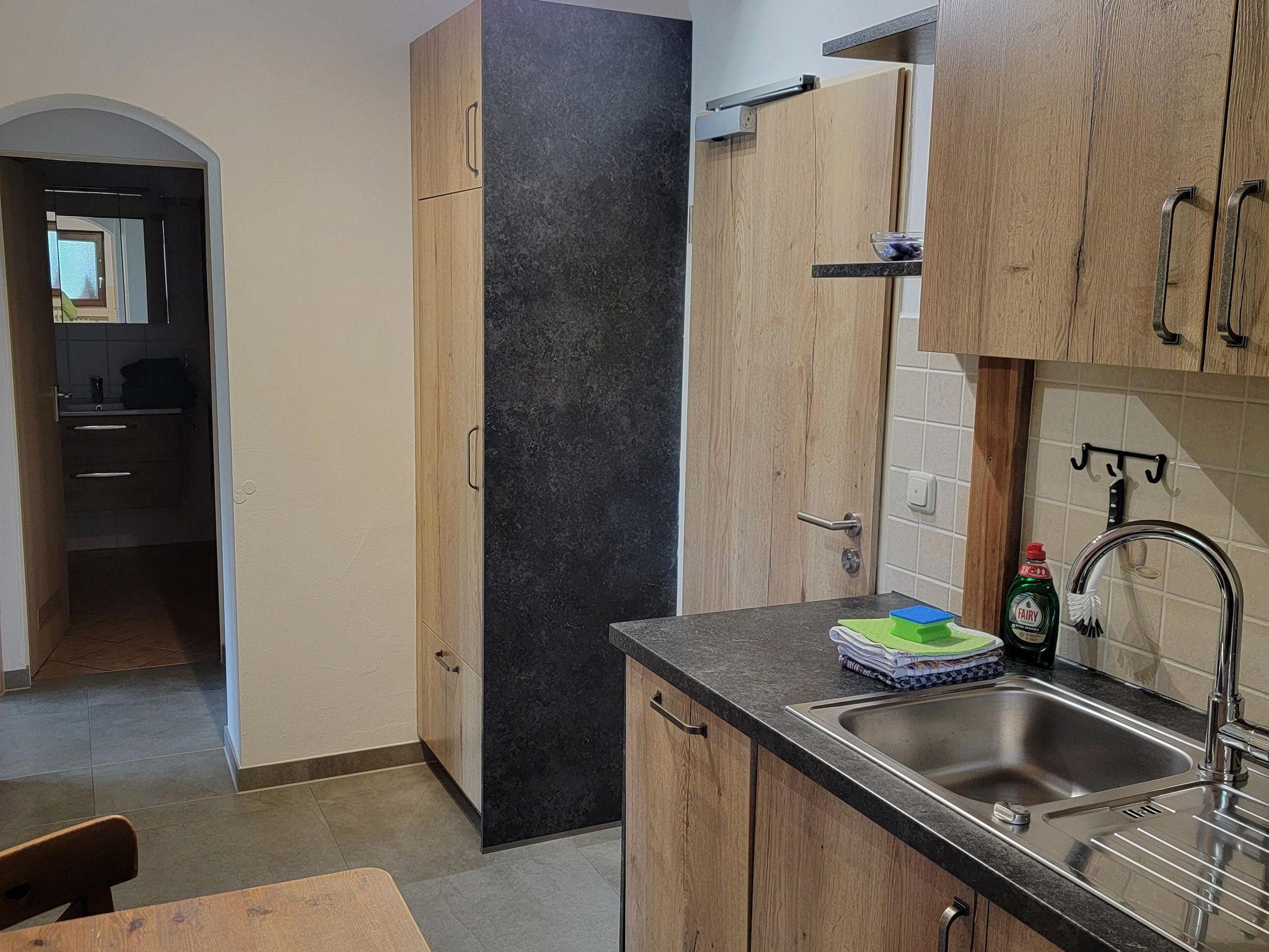 Unsere gemütliche Ferienwohnung ist mit einer Einbauküche mit Backofen und 3-Platten-Herd ausgestattet. Kaffeemaschine, Wasserkocher, Toaster, etc sind vorhanden. Im Wohnzimmer finden Sie eine gemütliche Sitzecke mit Sat-TV. Auf dem Balkon oder der Terrasse können sie ein wunderschönes Panorama genießen.