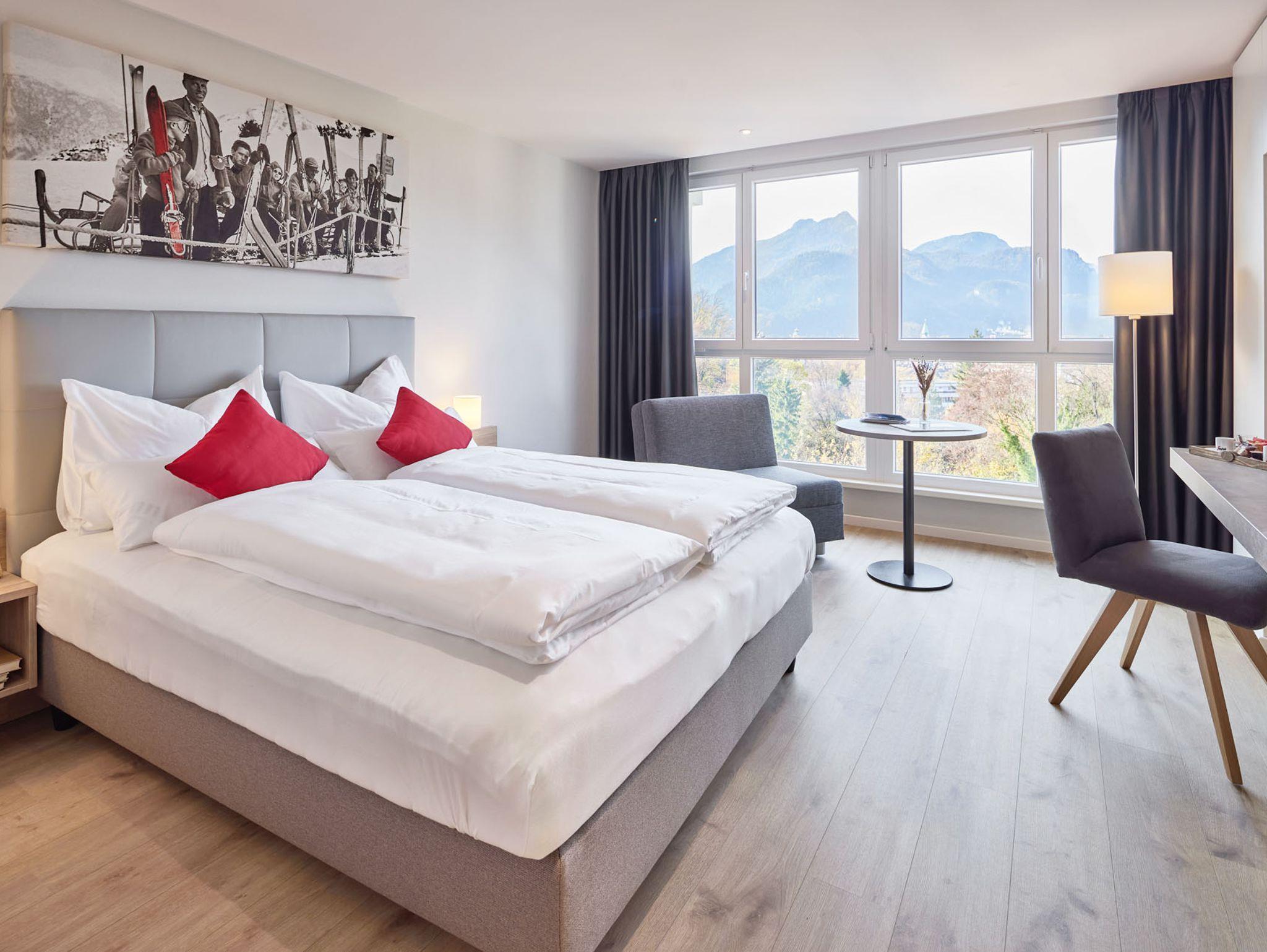 Kategorie Medium Plus, Größe: ca. 23,5 m², Wohn- und Schlafbereich mit Doppelbett und zusätzlichem separatem Kanapee als Zusatzbett für 1 Person, Kochnische, Badezimmer mit Dusche, Panorama mit Alpen-, Garten- oder Stadtblick. Unsere Apartments sind alle mit Heiz-und Kühlanlage, WIFI, Smart TV, 17 Zoll Zimmersafe, leistungsstarker Haartrockner und Segafredo Kaffeemaschine ausgestattet. Toaster, Wasserkocher, Wäscheständer, Bügelbrett und Bügeleisen werden nur auf Nachfrage ausgehändigt. Waschmaschine und Trockner stehen Ihnen in der 1 und 2 Etage gegen Gebühr zur Verfügung.