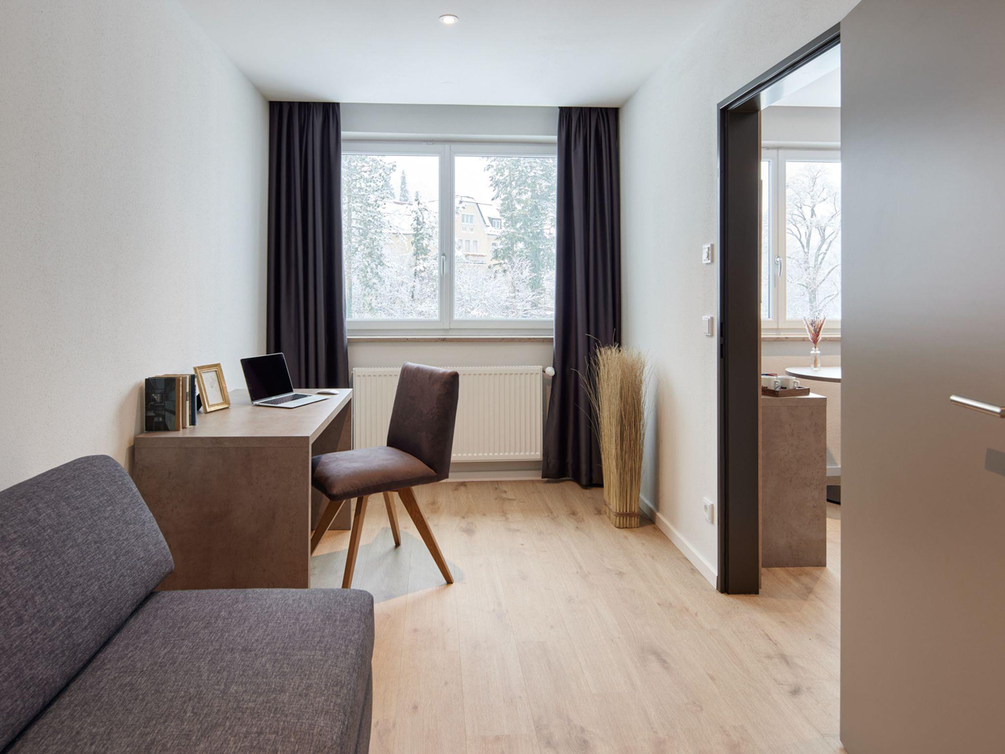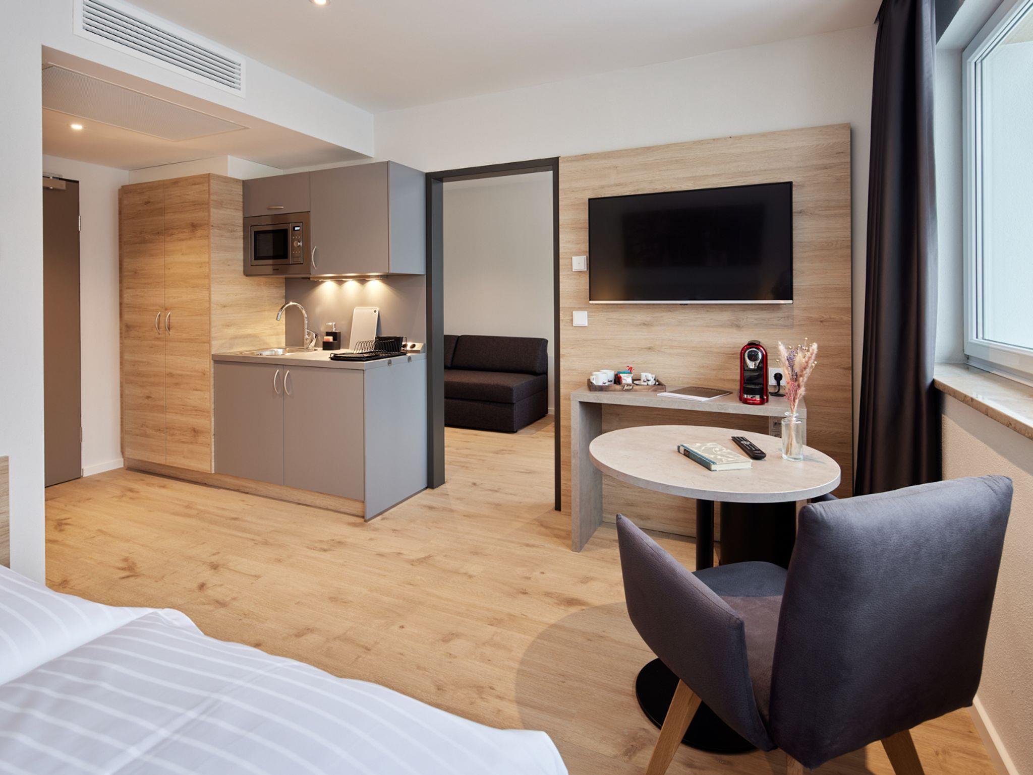 Kategorie Extra Large, Größe: ca. 32m², Wohn- und Schlafbereich mit Doppelbett und zusätzlichem separatem Arbeits-und Schlafbereich mit Schlafsofa für 2 Personen, Kochnische. Badezimmer mit Dusche, Panorama mit Alpen- oder Gartenblick, Unsere Apartments sind alle mit Heiz-und Kühlanlage, WIFI, Smart TV, 17 Zoll Zimmersafe, leistungsstraker Haartrockner und Segafredo Kaffeemaschine ausgestattet. Toaster, Wasserkocher, Wäscheständer, Bügelbrett und Bügeleisen werden nur auf Nachfrage ausgehändigt. Waschmaschine und Trockner stehen Ihnen in der 1 und 2 Etage gegen Gebühr zur Verfügung.
