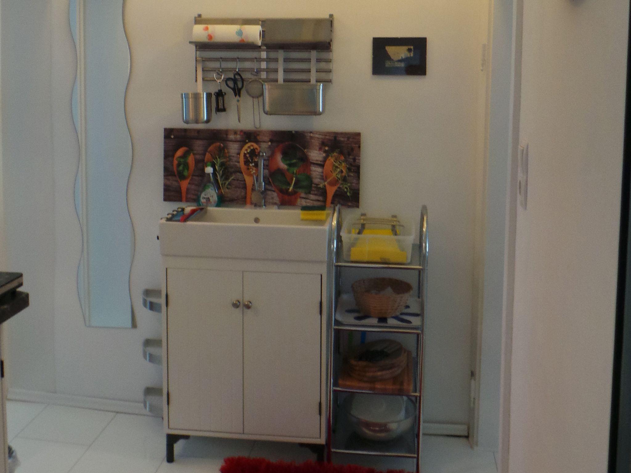Die Miniküche ist gut ausgestattet, verfügt über eine kleine Spüle, großem Kühlschrank mit Gefrierfach, Magnetresonanz-Kochplatte mit 2 Kochfelder mit zugehörigem Kochgeschirr, Mikrowelle, Kaffeefilterautomat, Toaster, Wasserkocher, Besteck, Gläser und allen anderen relevanten Dingen. Die Kochgelegenheit beschränkt sich jedoch auf Grund der kleinen Arbeitsflächen eher auf die Zubereitung von „Schnellgerichten“ und ist für „Kochaktionen größerer Familien“ nur bedingt geeignet! Frisches Gebäck können die Gäste in einer nahegelegenen Bäckerei fußläufig besorgen.