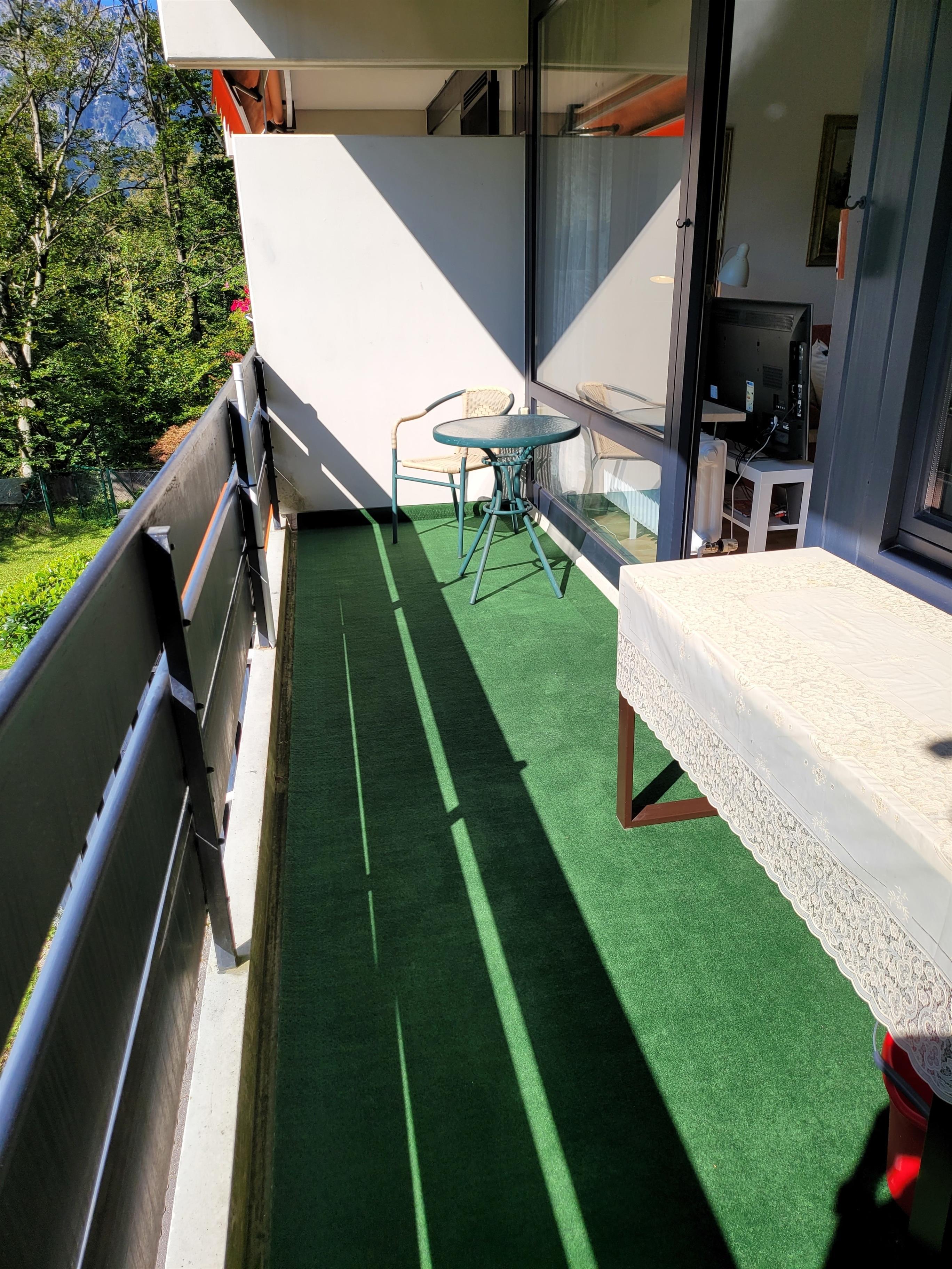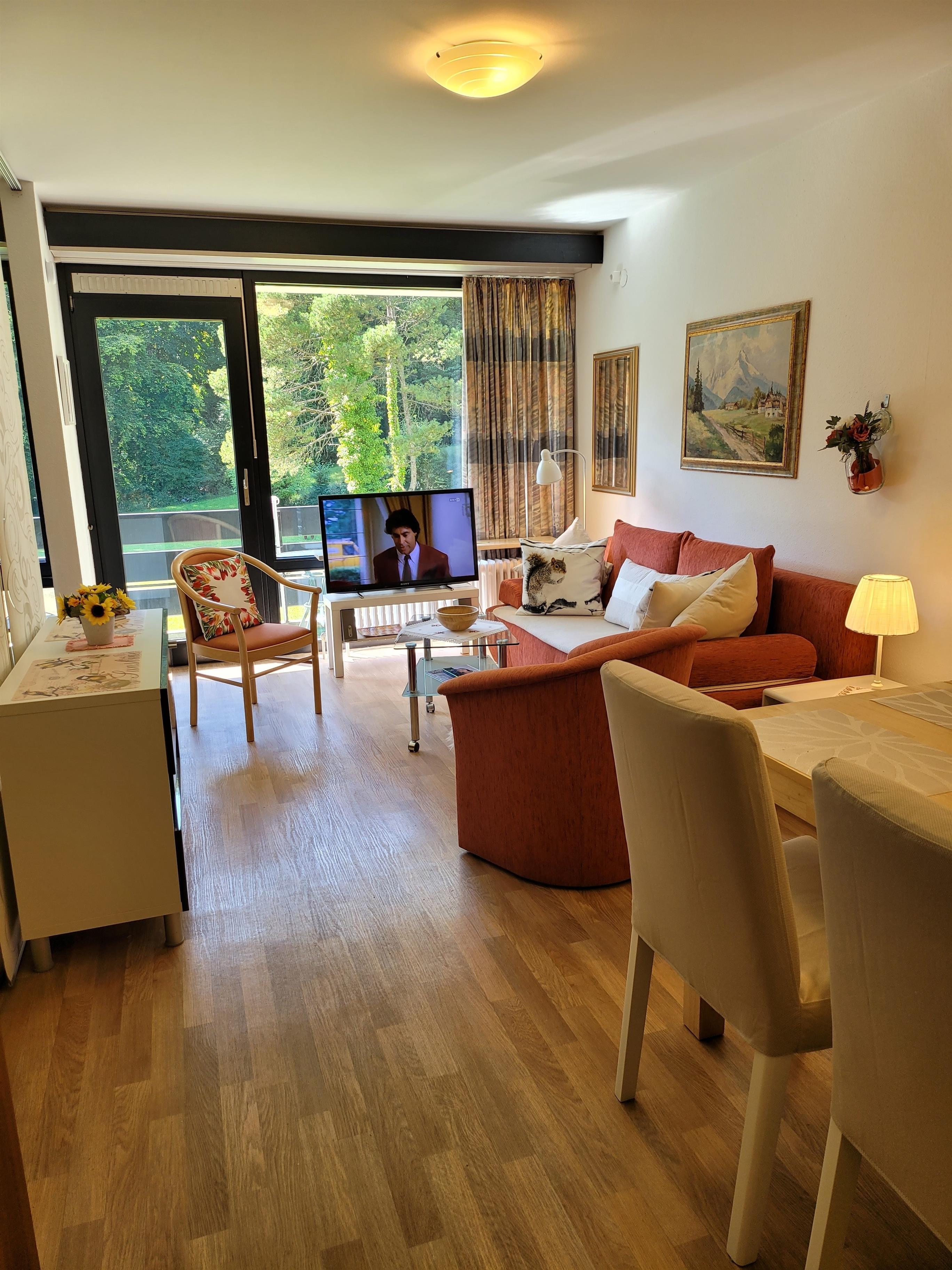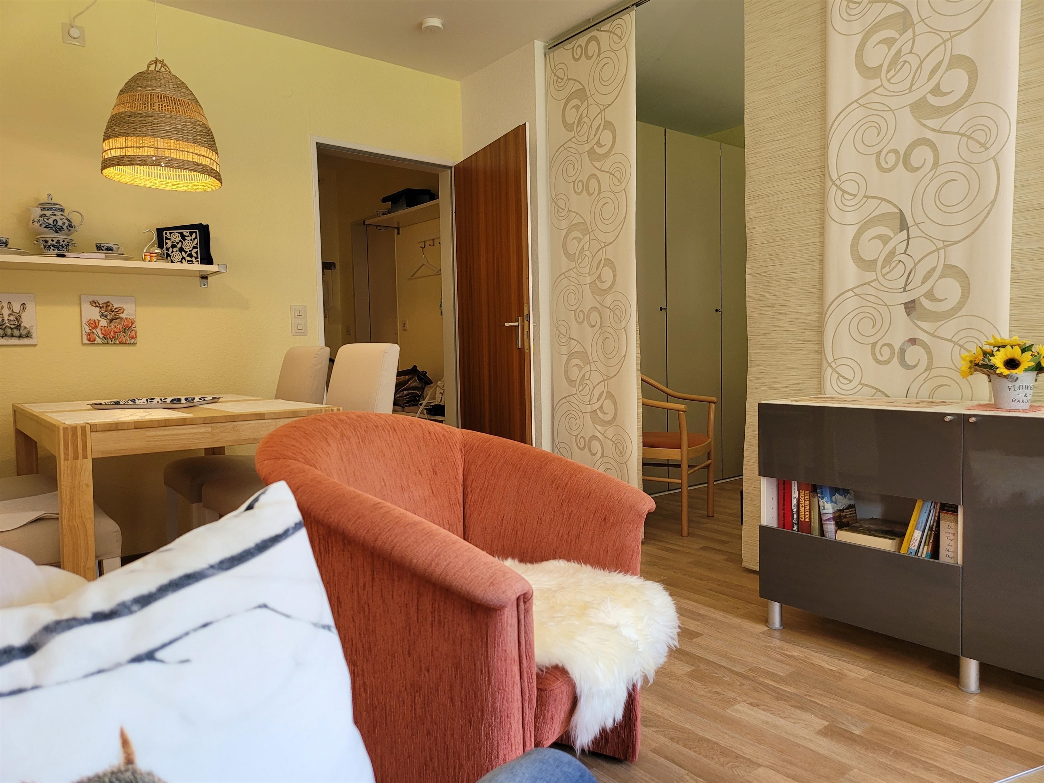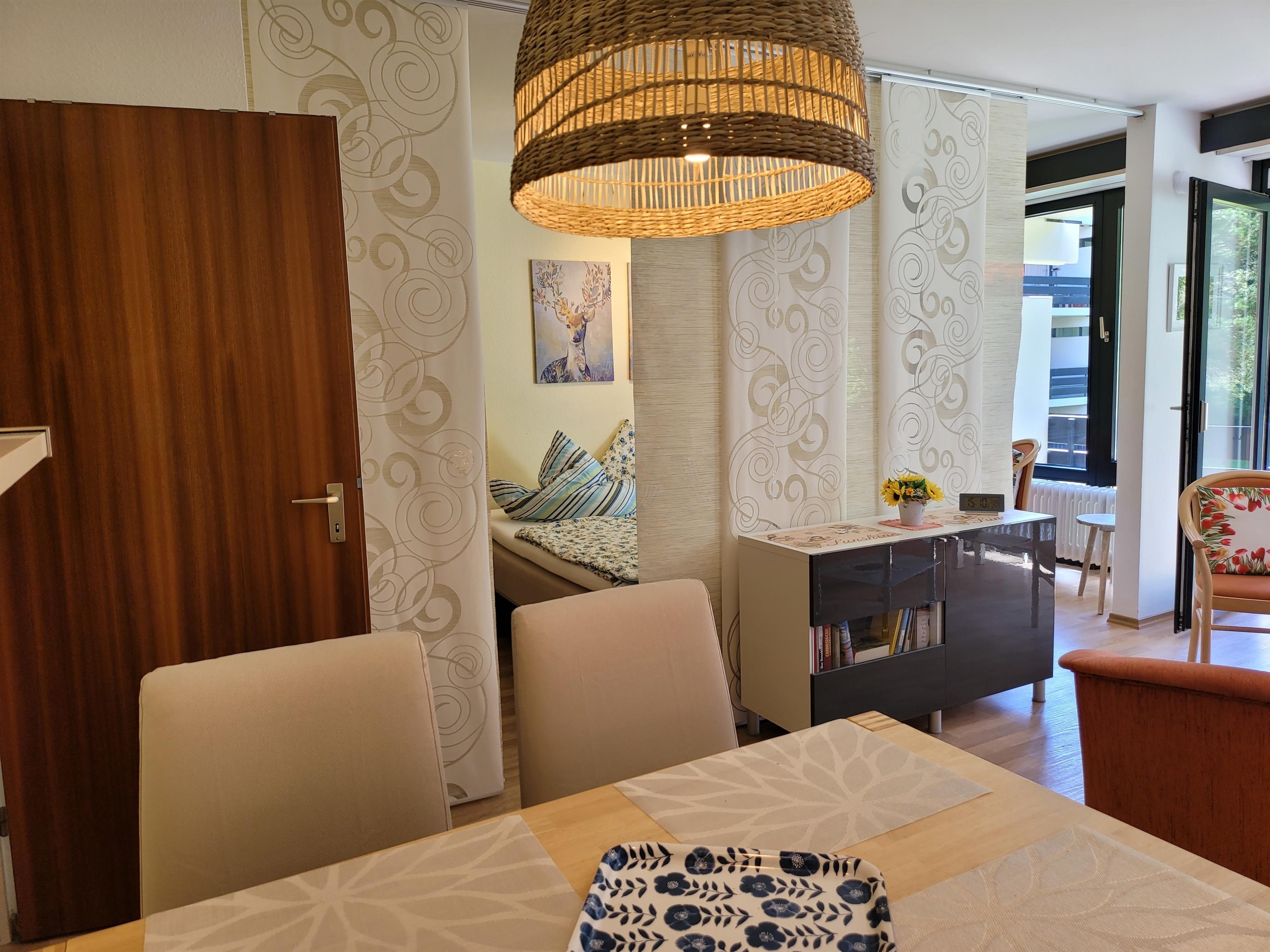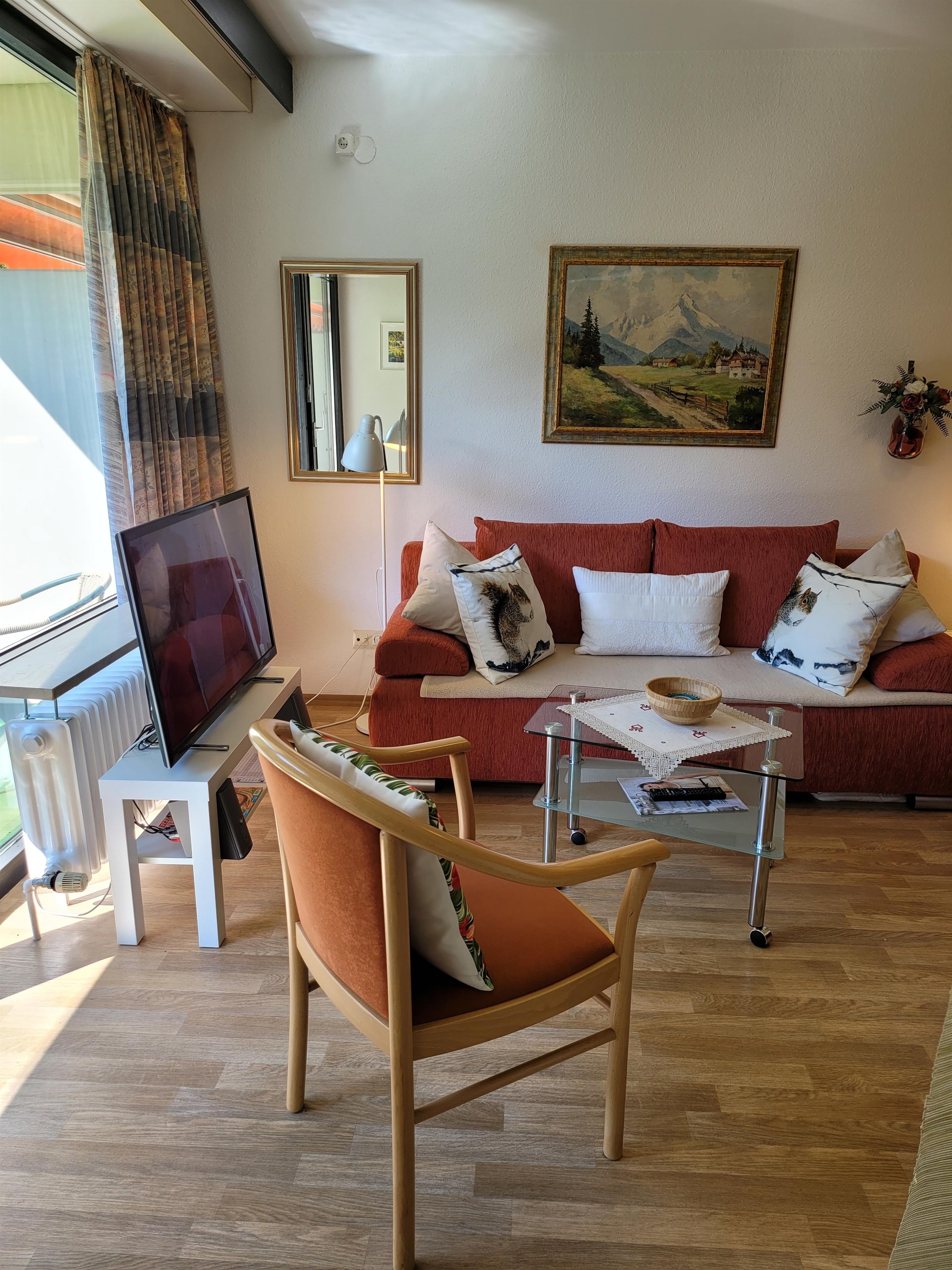 Im Wohnzimmer befindet sich ein moderner Fernseher mit einem Amazon TV-Stick und einem DVD-Player. Unter dem Fernseher steht der DVD-Player. Die gemütliche Coach kann zu einem Doppelbett (140×190) ausgezogen werden. Vom Wohnzimmer gelangt man auf den großen Balkon. Dieser ist mit 2 bequemen Gartenstühlen und einem Tisch ausgestattet. In der Ecke steht ein Wäschständer für die nassen Badesachen.