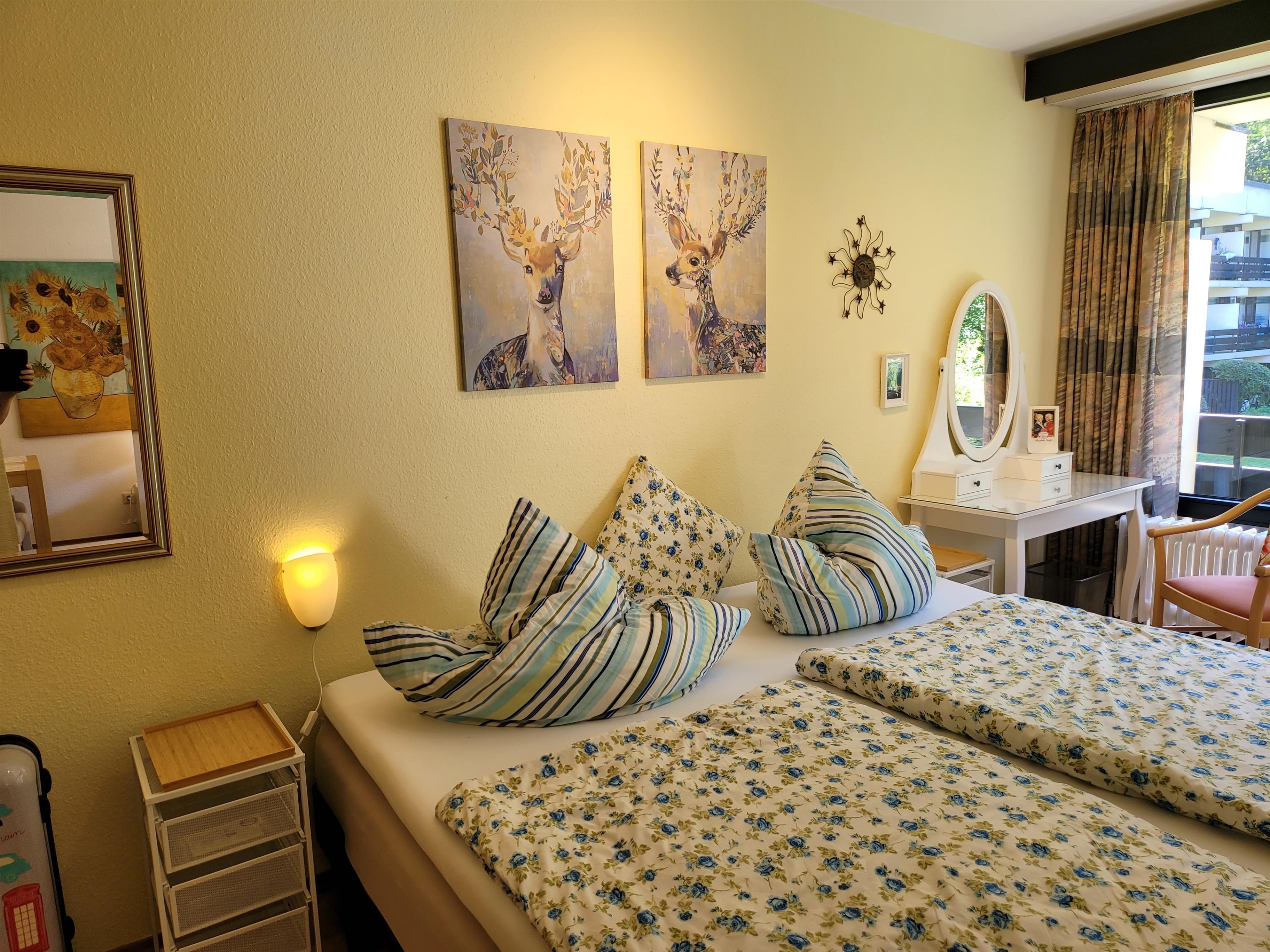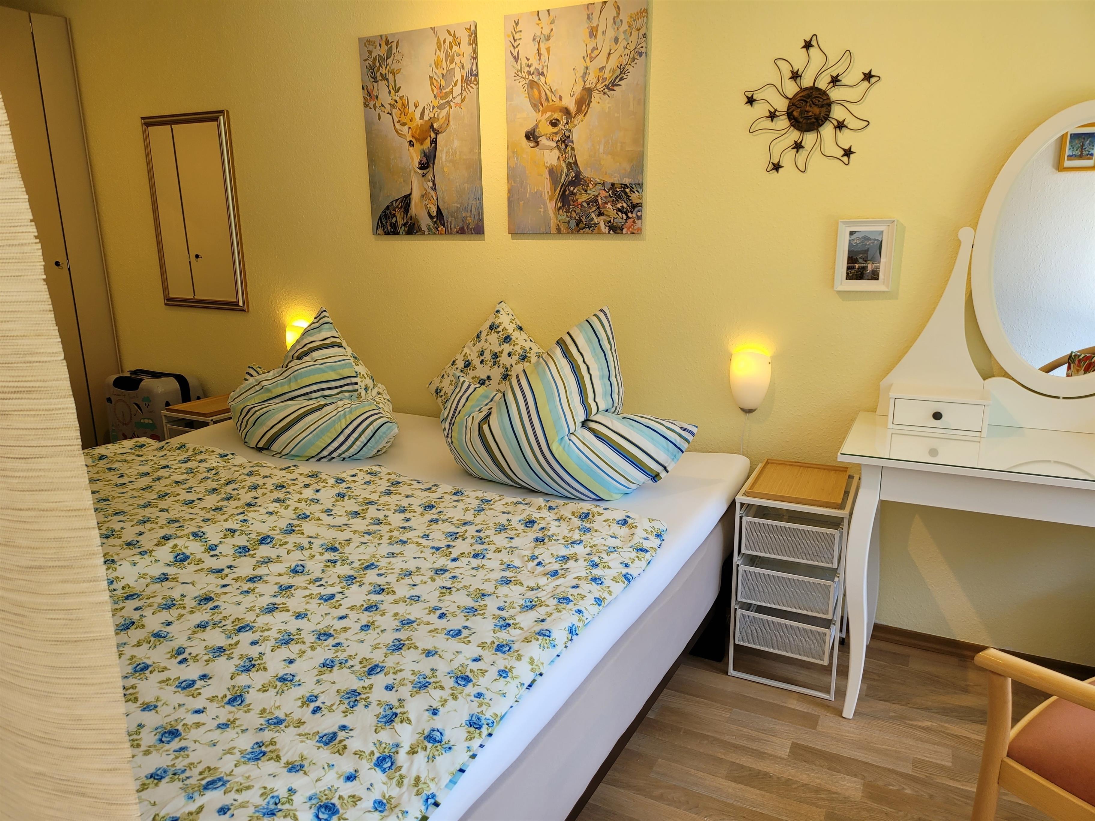 Das Schlafzimmer verfügt über ein Doppelbett mit einem Topper (200cmx200cm). Natürlich sind 2 Nachttische und Leselampen vorhanden. Am Fenster steht ein Schminktisch zum Schreiben oder Frisieren / Schminken (großer Spiegel vorhanden). Ein Korbsessel lädt zum Lesen ein. Auf der anderen Bettseite steht der geräumige Kleiderschrank. In dem großen Spiegel können Sie Ihr Outfit kontrollieren. Im Kleiderschrank ist auch Platz für die Koffer.