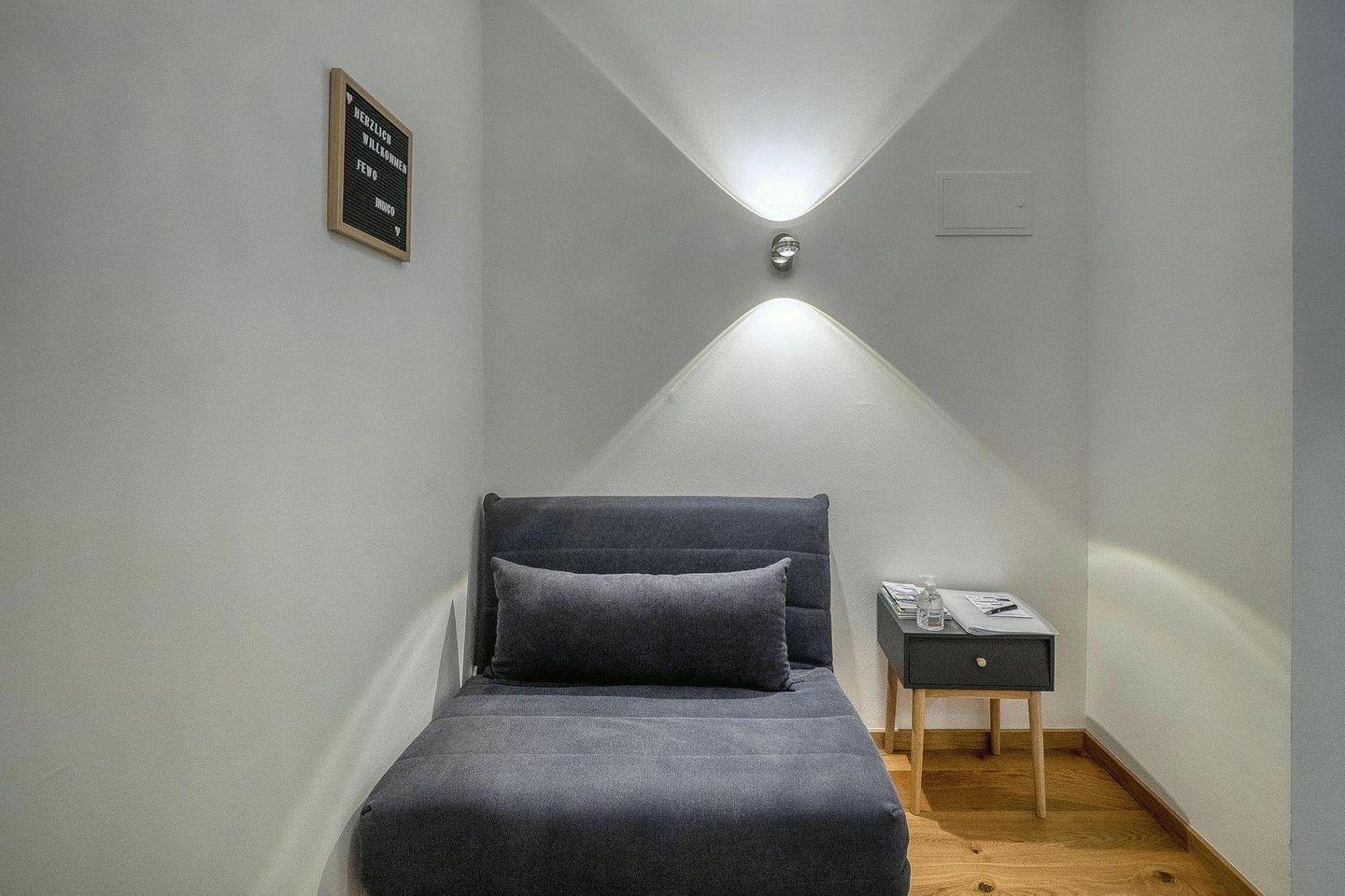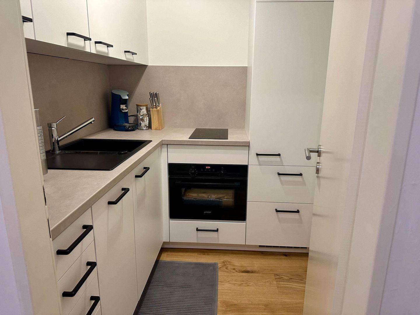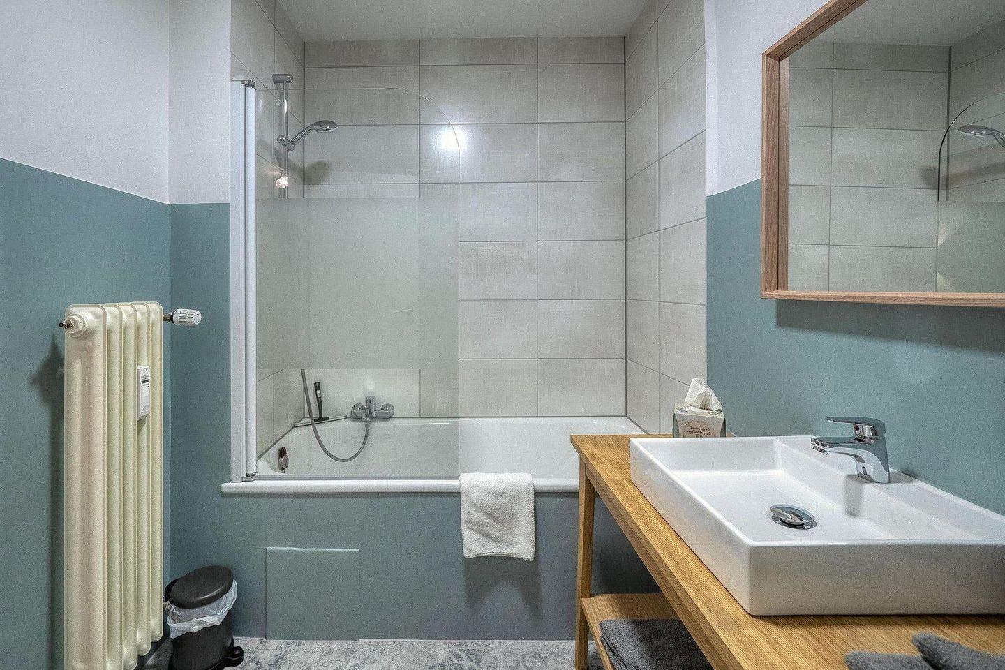 Die separate, voll ausgestattete Küche ermöglicht eine unkomplizierte Selbstversorgung – ideal für kurze Aufenthalte, spontane Städtereisen oder Workation. Das Badezimmer mit Badewanne, Duschmöglichkeit und Föhn bietet zusätzlichen Komfort, gerade nach einem Stadtbummel oder Ausflug.