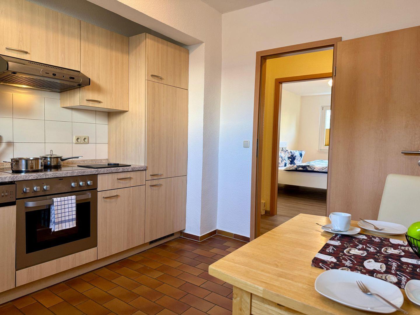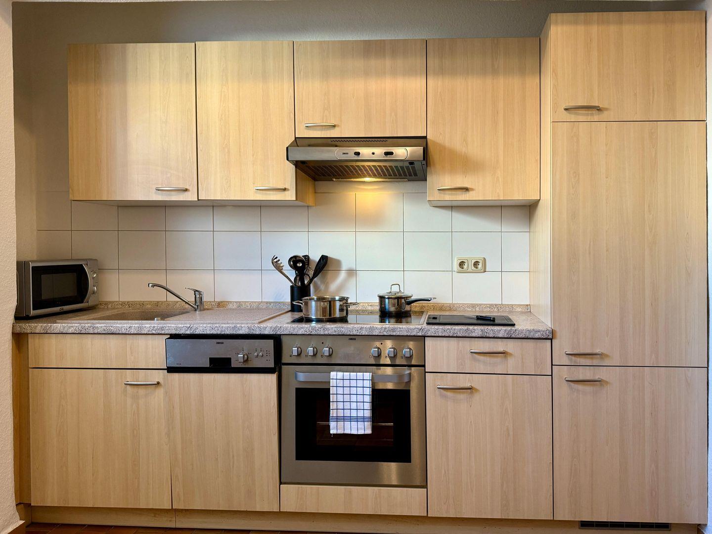 Die abgeschlossene Küche ist vollständig für Selbstversorger ausgestattet und bietet Ihnen einen 4-Platten-Herd, einen Backofen, eine Spülmaschine, Kühlschrank, Kaffeemaschine, Mikrowelle und Wasserkocher. Somit lassen sich hier sowohl kleine Snacks als auch aufwendige Menüs komfortabel zubereiten. Die funktionale Einrichtung wird durch praktische Haushaltshelfer wie Bügeleisen, Bügelbrett, Wäscheständer und eine eigene Waschmaschine ergänzt.