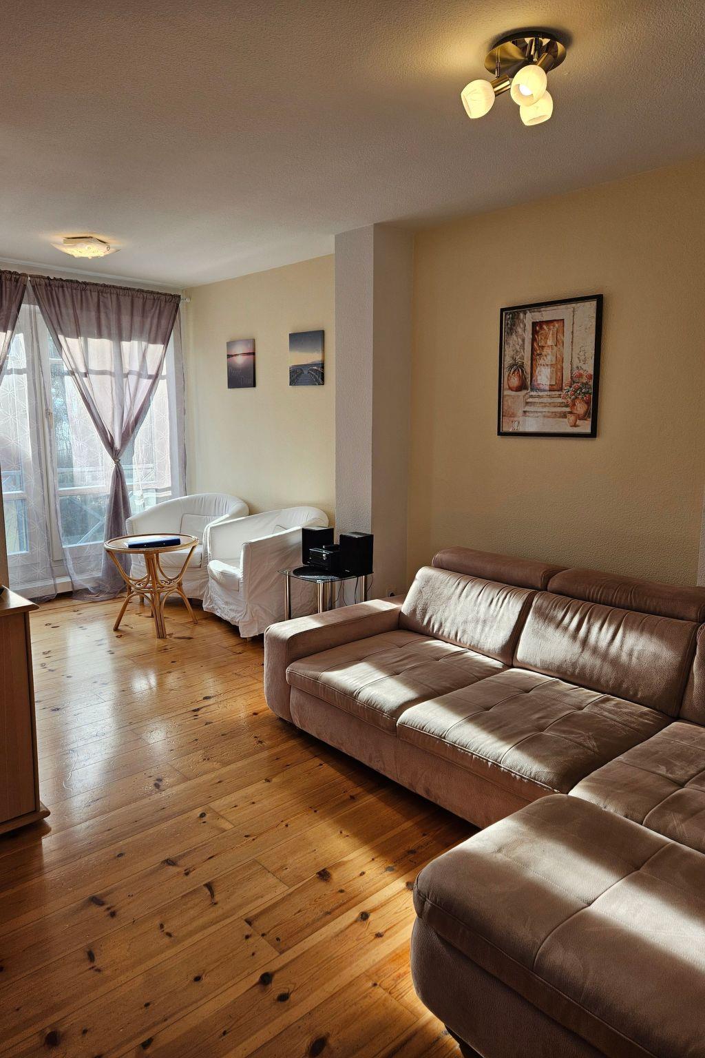 The tastefully furnished 2-room flat on 52 m² on the first floor has a large balcony with a view of Lake Scharmützelsee. Ideal for up to 3 people, we also offer a travel cot and a high chair for our younger guests. The flat features a living room and bedroom with elegant wooden floors, while the kitchen, hallway and bathroom have modern tiled floors. Facilities include a double bed, a fold-out sofa bed, flat-screen TV, radio, Internet/WLAN and a fully equipped kitchen with dishwasher, kettle, coffee machine, etc.
