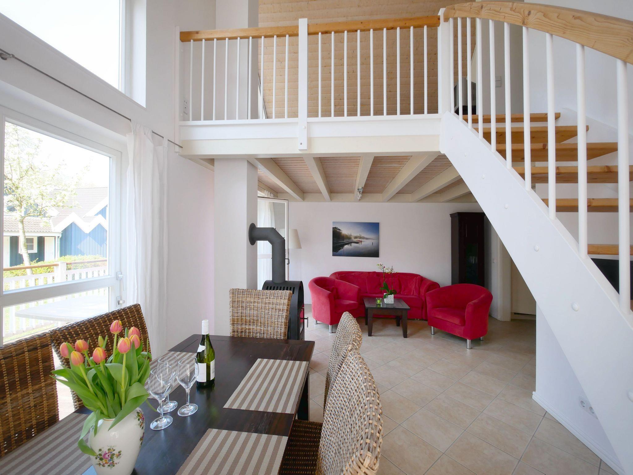 Dieses Reihenhaus (außen) mit 88 m² bietet auf zwei Ebenen Platz für 4+2 Personen mit 2 Schlafzimmern und einer offenen Schlafgalerie (Schlafsofa vorhanden), Sauna, Whirlpool und Kamin.