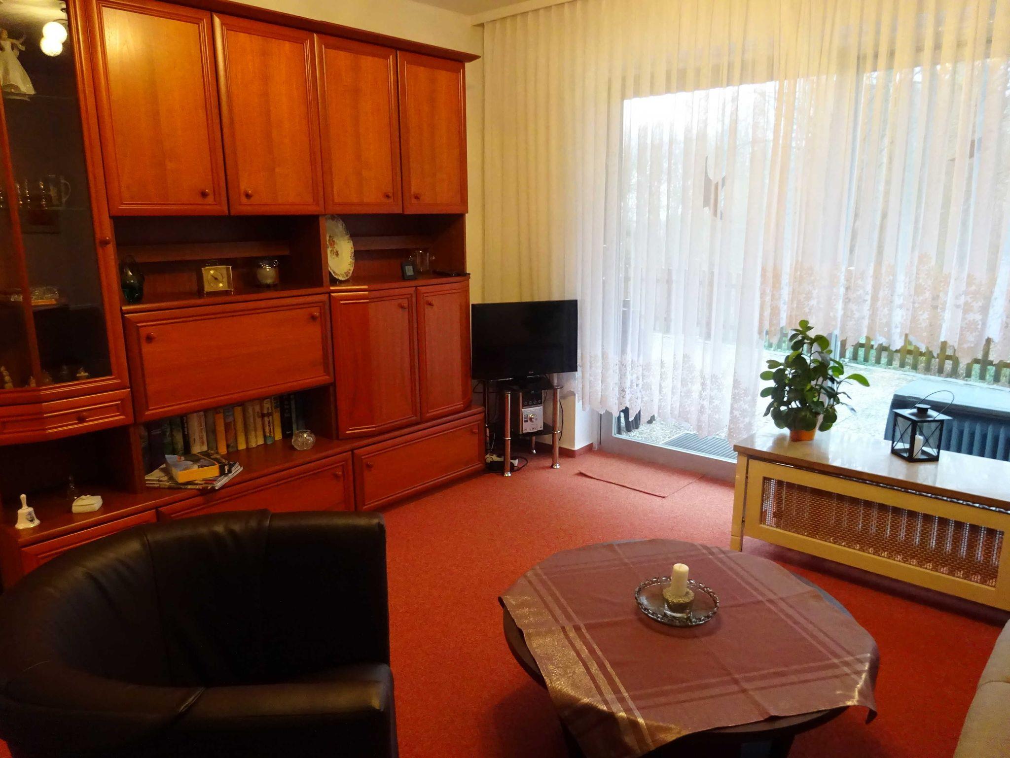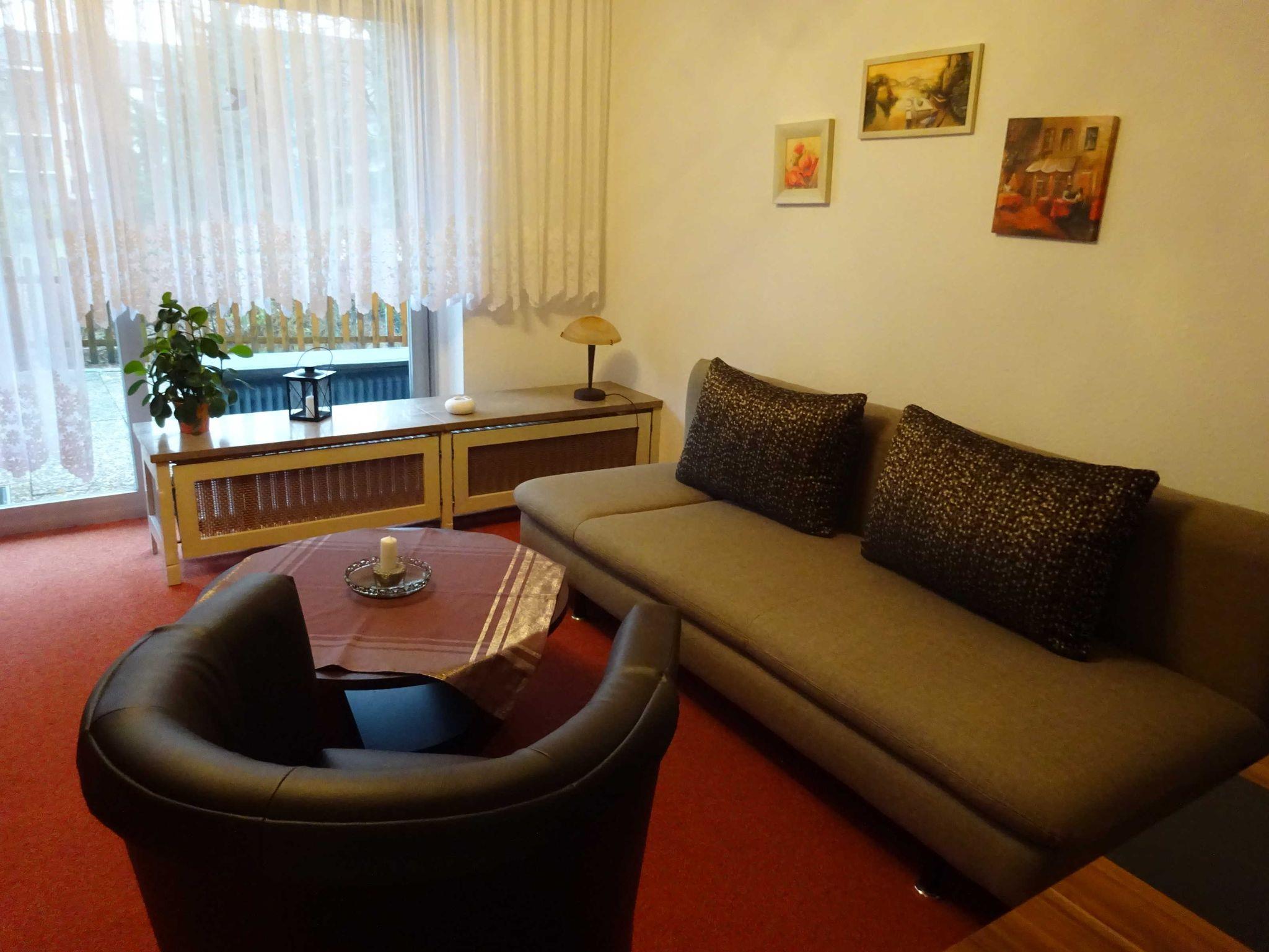 - Wohnzimmer mit Sofa (zur Schlafcouch ausziehbar!), Sessel Couchtisch und Essbereich für bis zu 4 Personen, Flachbild-Fernseher und direktem Zugang zur Terrasse