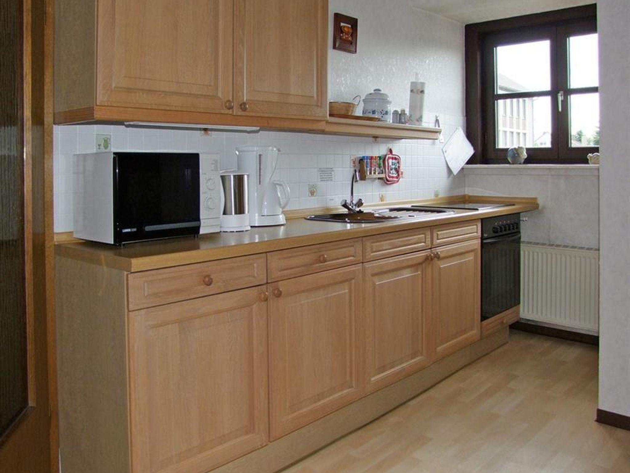 • Küche mit Ceran-Kochfeld, Mikrowelle, Kaffeemaschine, Kühlschrank