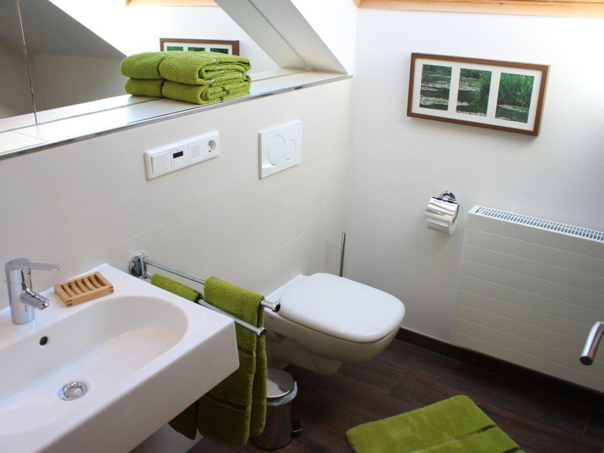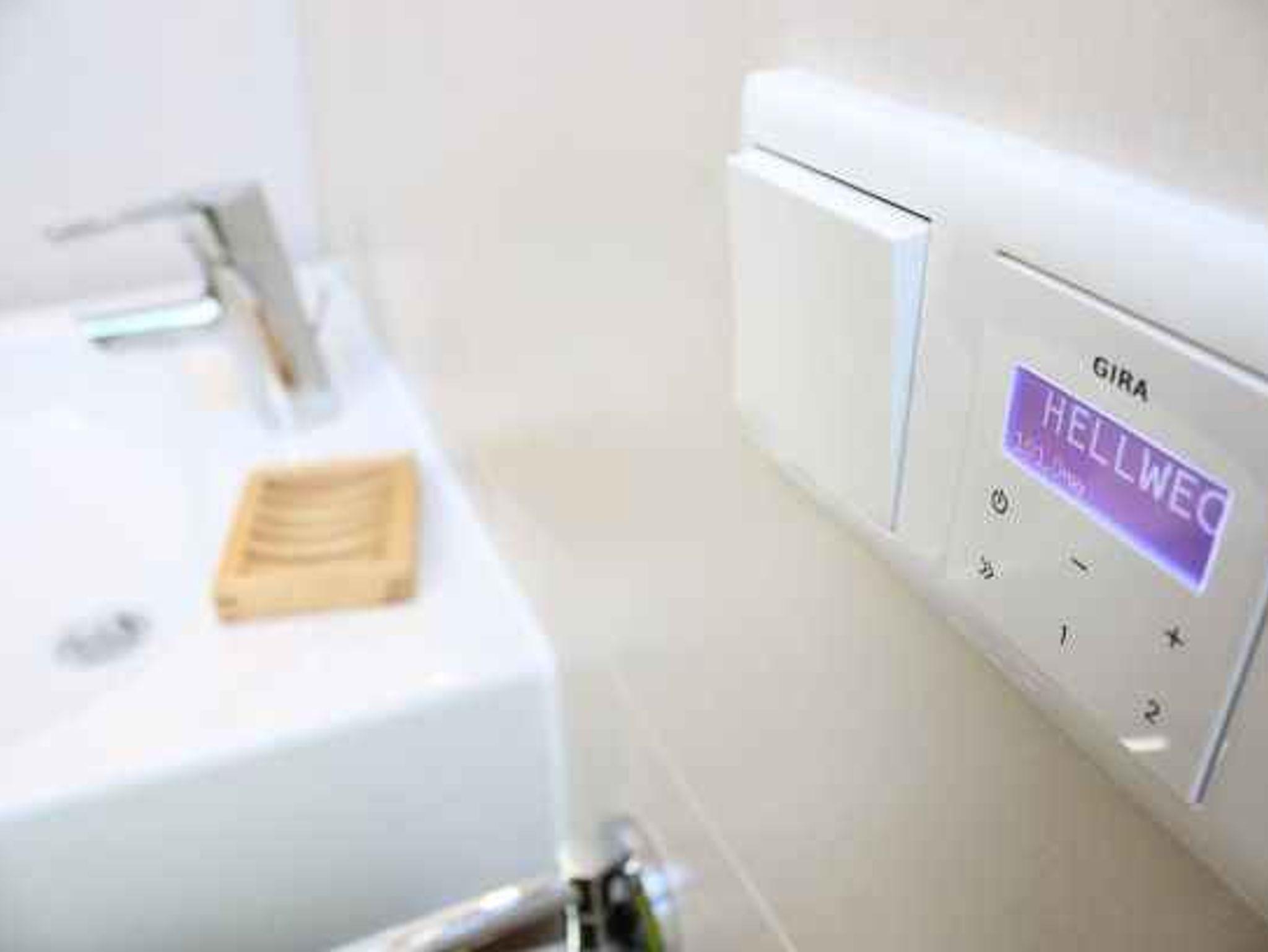 Das moderne Bad mit Dusche, WC und eingebautem Radio sorgt für einen angenehmen Start in den Tag.