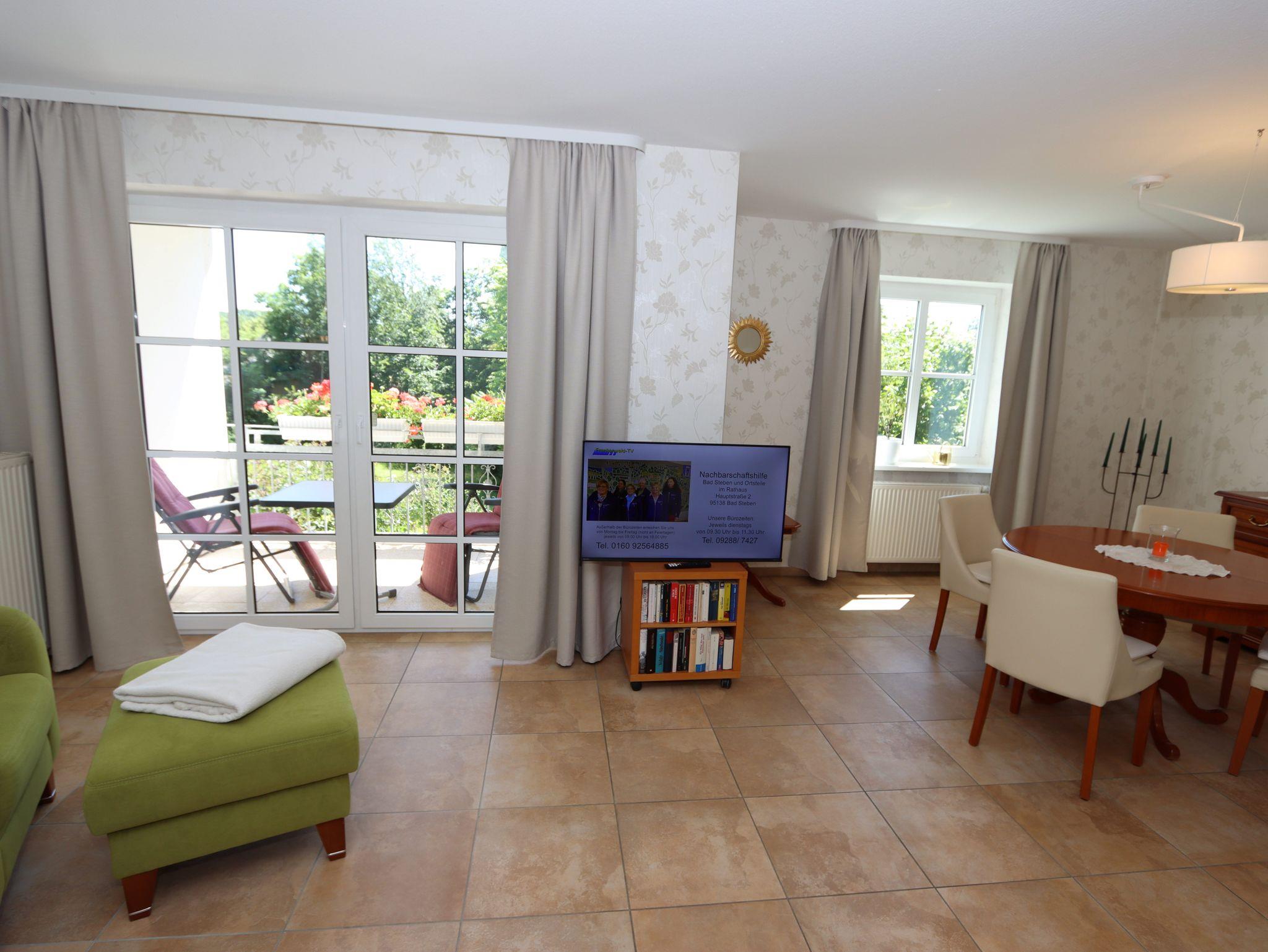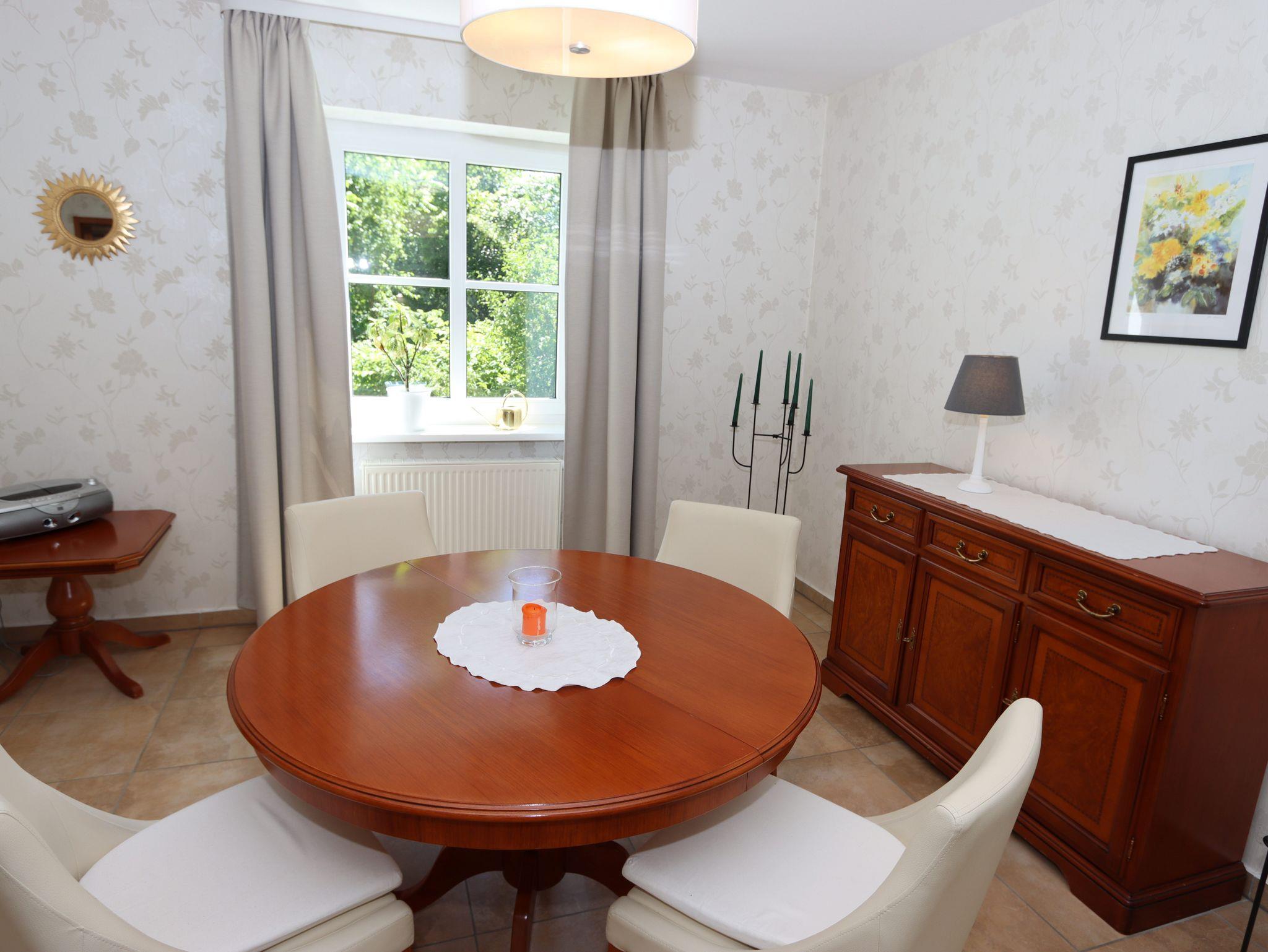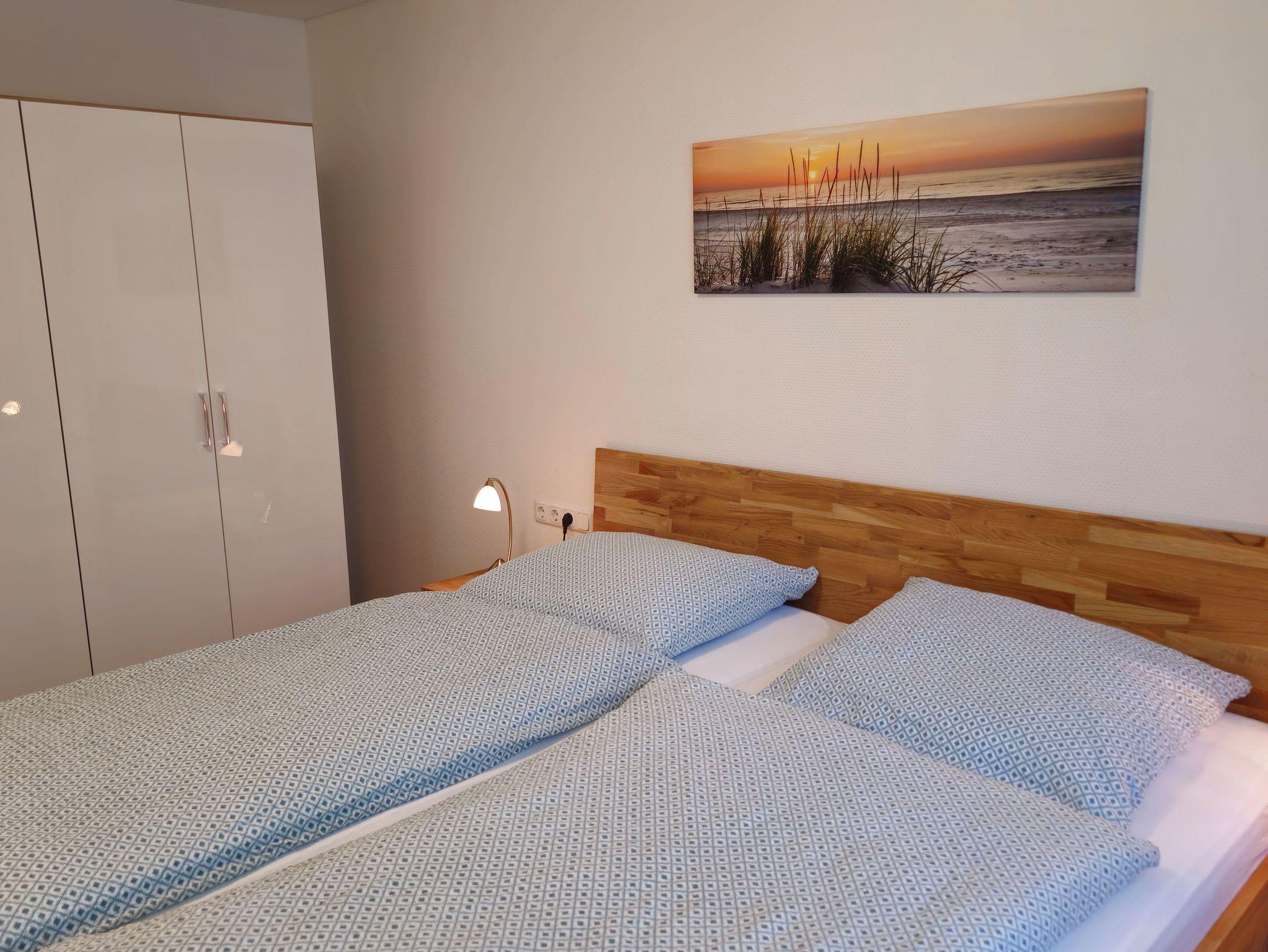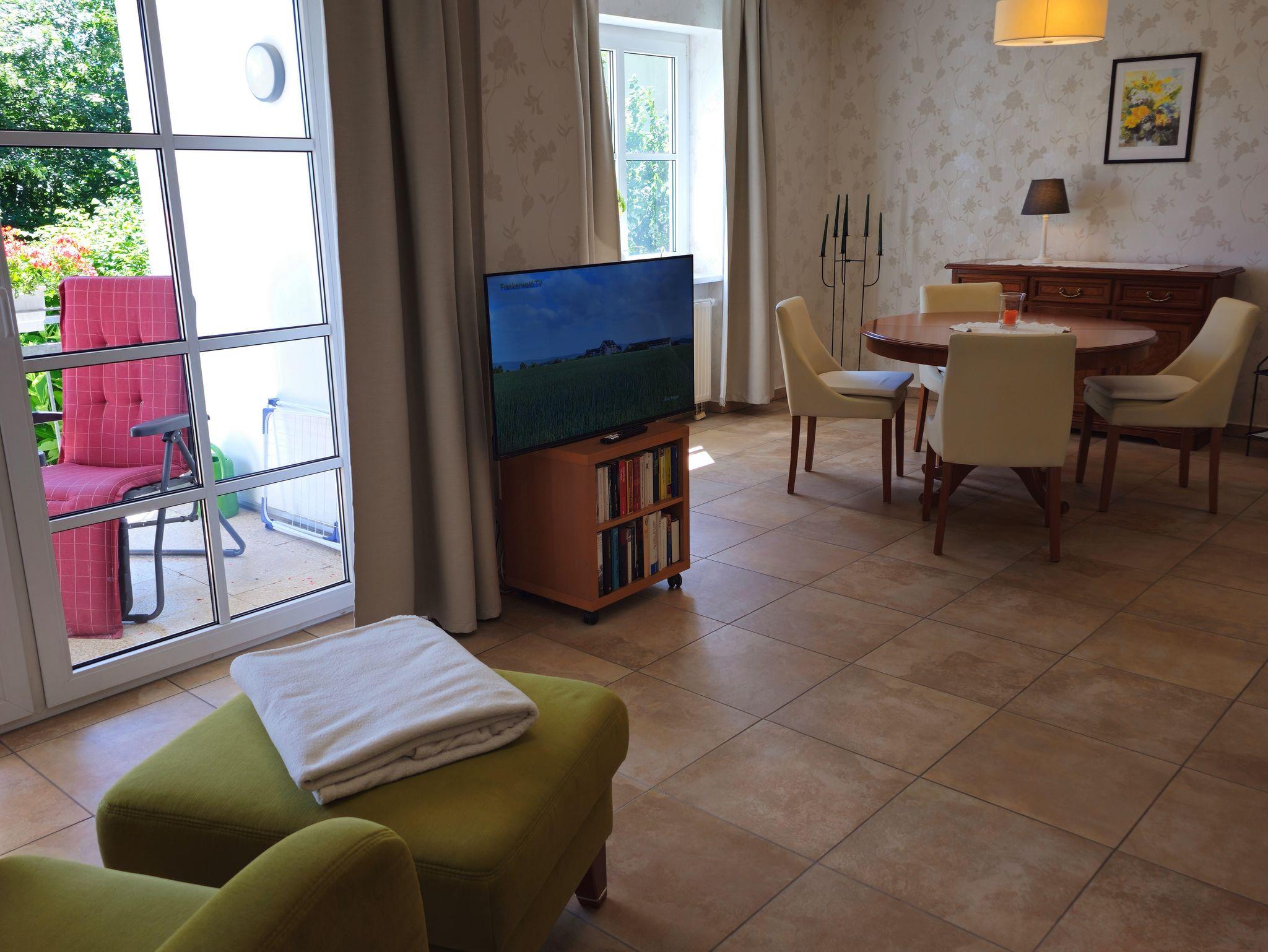 Wir bieten Ihnen eine komfortable Ferienwohnung (ca.60qm) im Hochparterre, mit einem großzügigen Wohnraum und Essplatz, einem Schlafzimmer mit Doppelbett und einem großen Bad mit Fußbodenheizung.