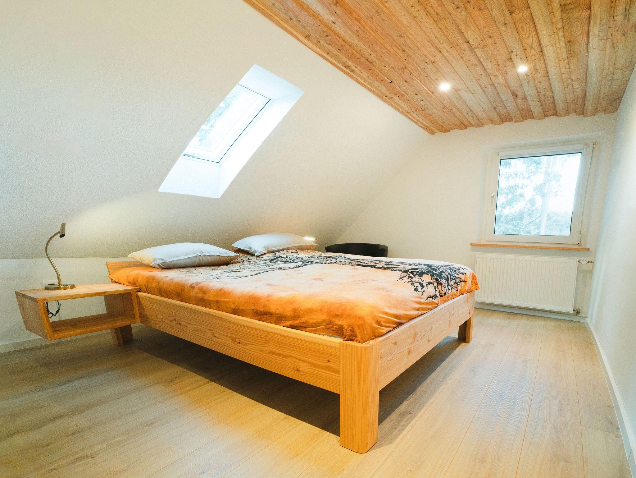 Das etwas größere Schlafzimmer beinhaltet ein vom Schreiner angefertigtes Lärchenholzbett mit 1,60 m Breite.