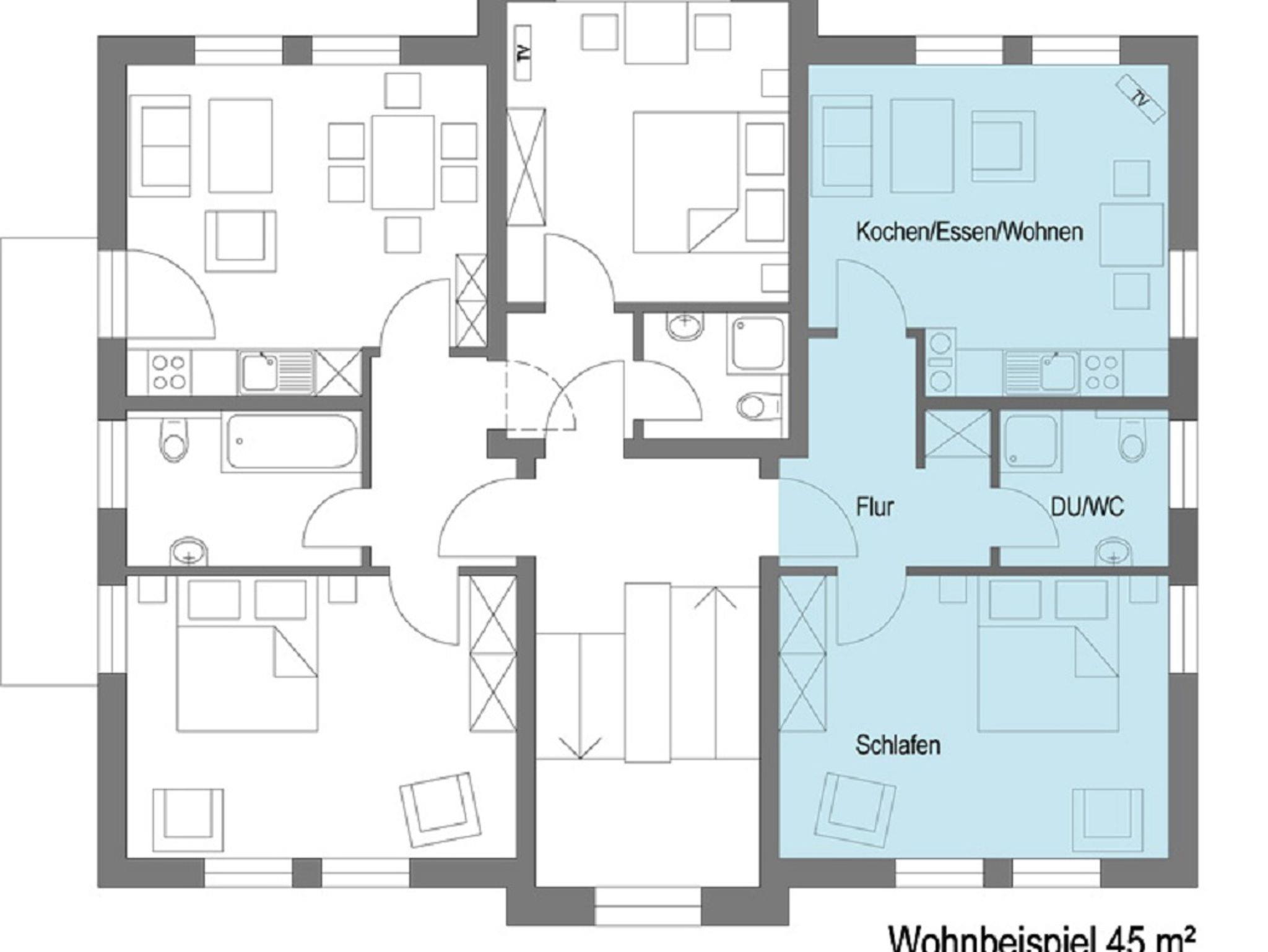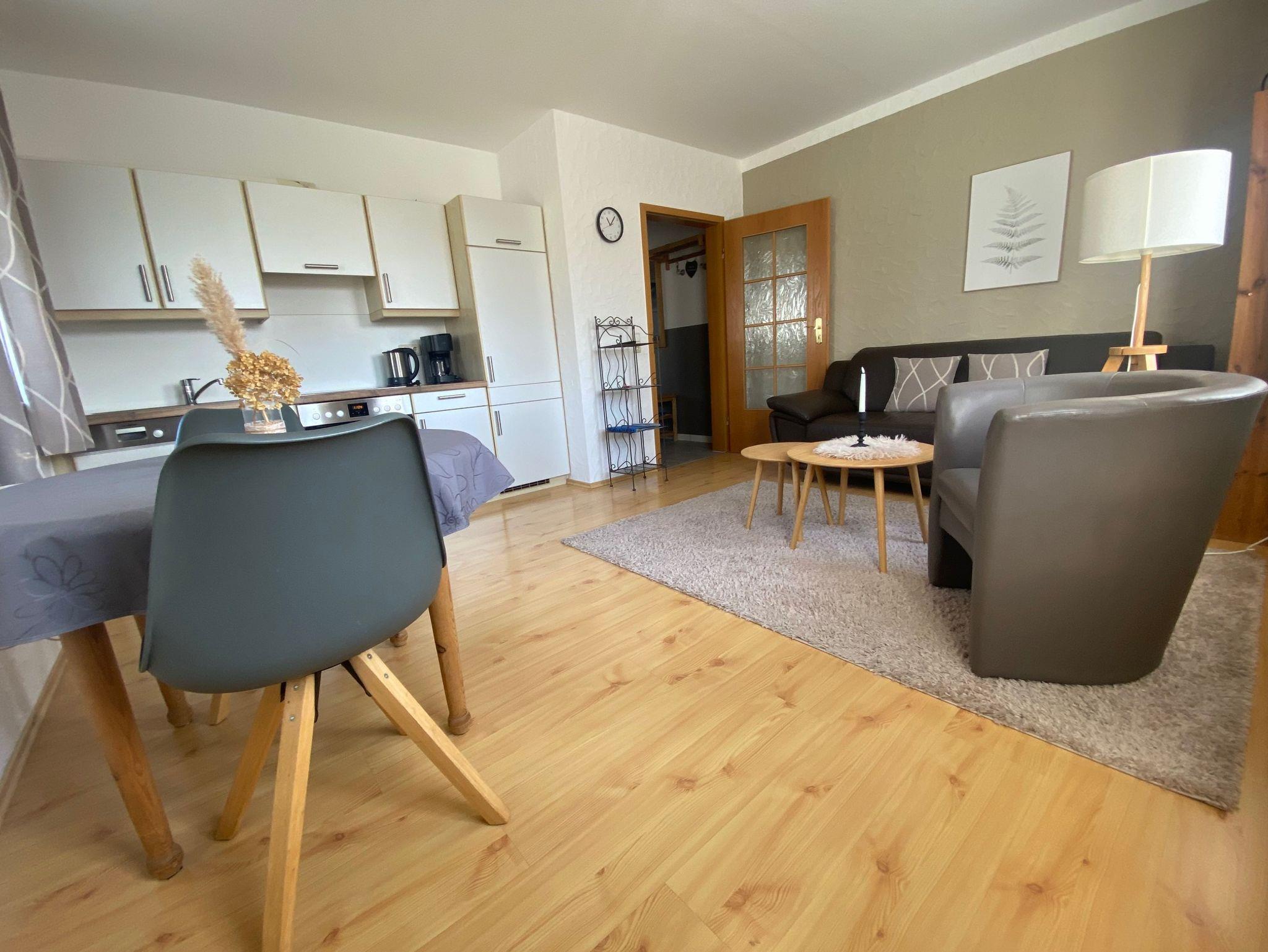 Die Ferienwohnung Gartenblick (unten) mit 45 qm Wohnfläche bietet Platz für bis zu zwei Personen. Die Küchenzeile ist ausgestattet mit einen E-Herd und Bachofen, Kühlschrank mit Gefrierfach, Mikrowelle, Geschirrspüler, Kaffeemaschine, Toaster, Eierkocher, Wasserkocher sowie Ess und Kochgeschirr in ausreichender Menge. Der gemütliche und helle Wohnraum und Essecke sind kombiniert. Über die Diele geht es in ein großzügiges separates Schlafzimmer mit Doppelbett. Das Badezimmer ist mit Dusche, WC und mit einen beleuchteten Kosmetik Spiegel und Fön ausgestattet.